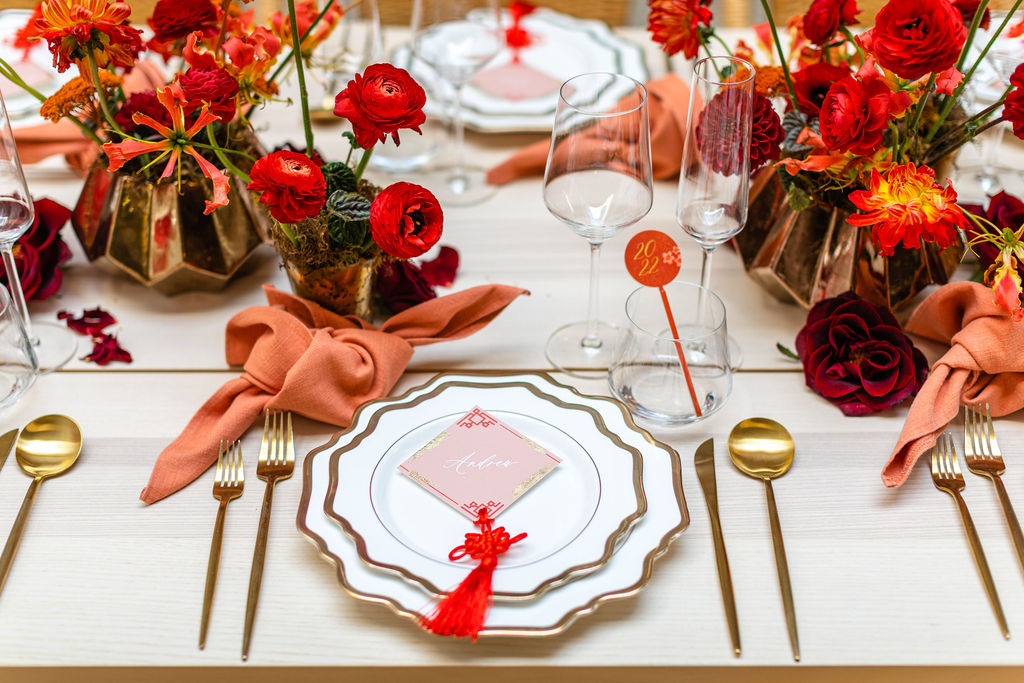 I had fun choosing something different for the tabletop and these gorgeous plates from Signature Party Rentals. I also loved the modern gold flatware they have and simple glassware I paired with them. The touch of the coral napkin from Hostess Haven offset all of the red and gold. Plus, adding Pirouette Paper’s amazing details made it even more perfect.