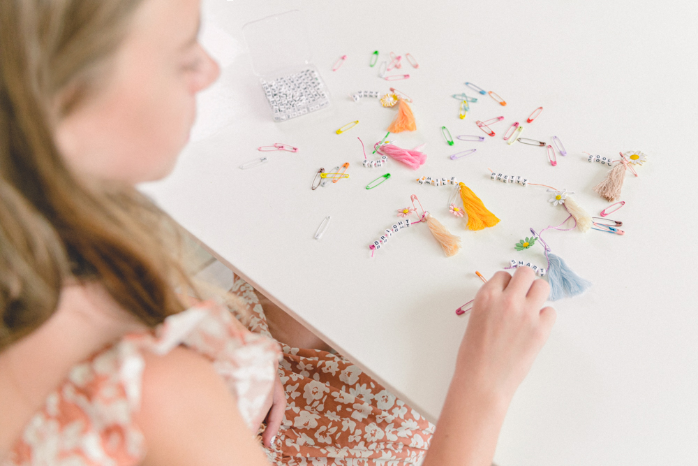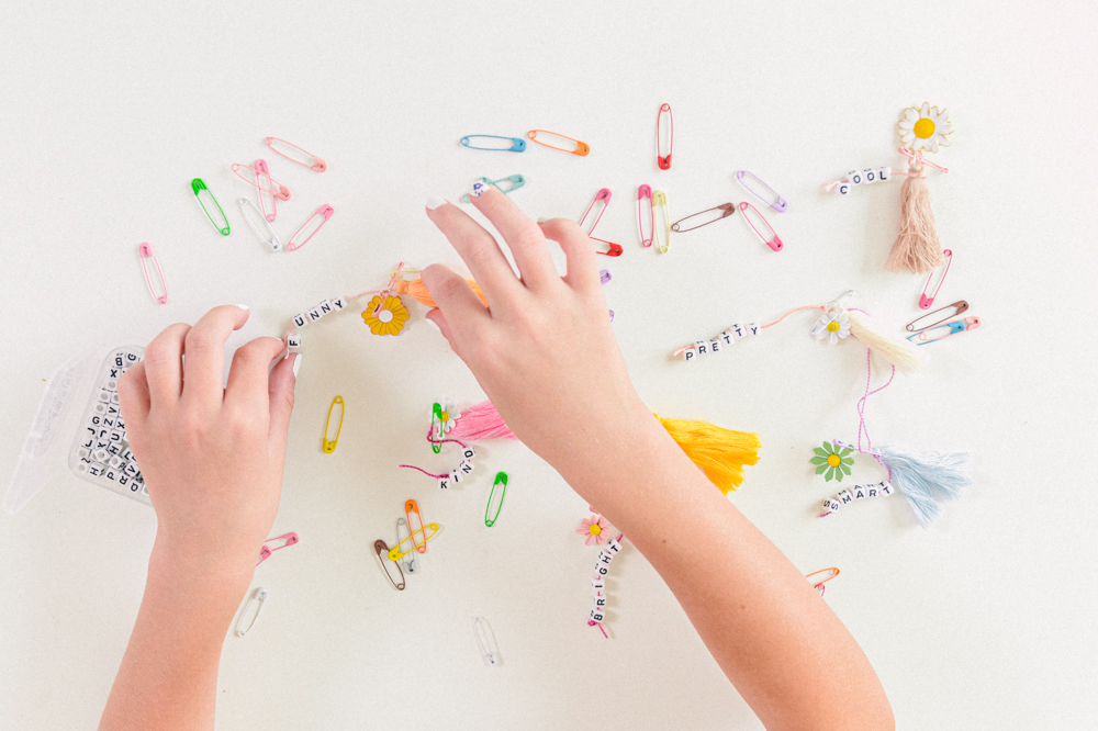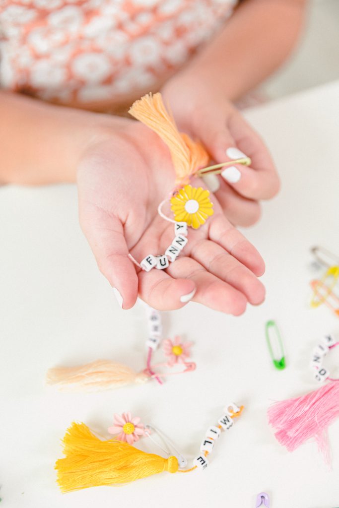 For the cute safety pin keychains, create some fun! I used words like pretty, cool, smile, and funny. Just use nice words that make people happy! I used the string it came with and knotted the ends together. Then, I picked out a tassel and flower to go with it. Just have fun with it! Do what you love!
