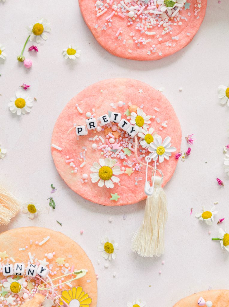 For the cookies, my mom and I made the cookie as directed on the box. We did add some food coloring to make them really fun summer colors. I love pink, yellow, orange, and purple right now. So we did pink tones. I sprinkled the cookies with a cute glitter sprinkle mix and then put them in the fridge. Let them cool all the way!