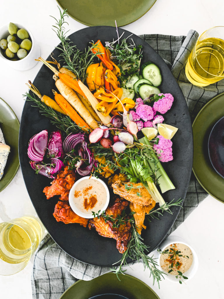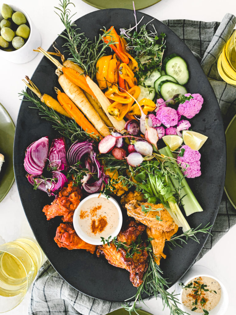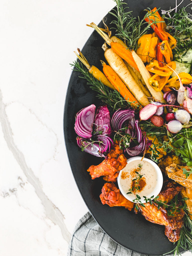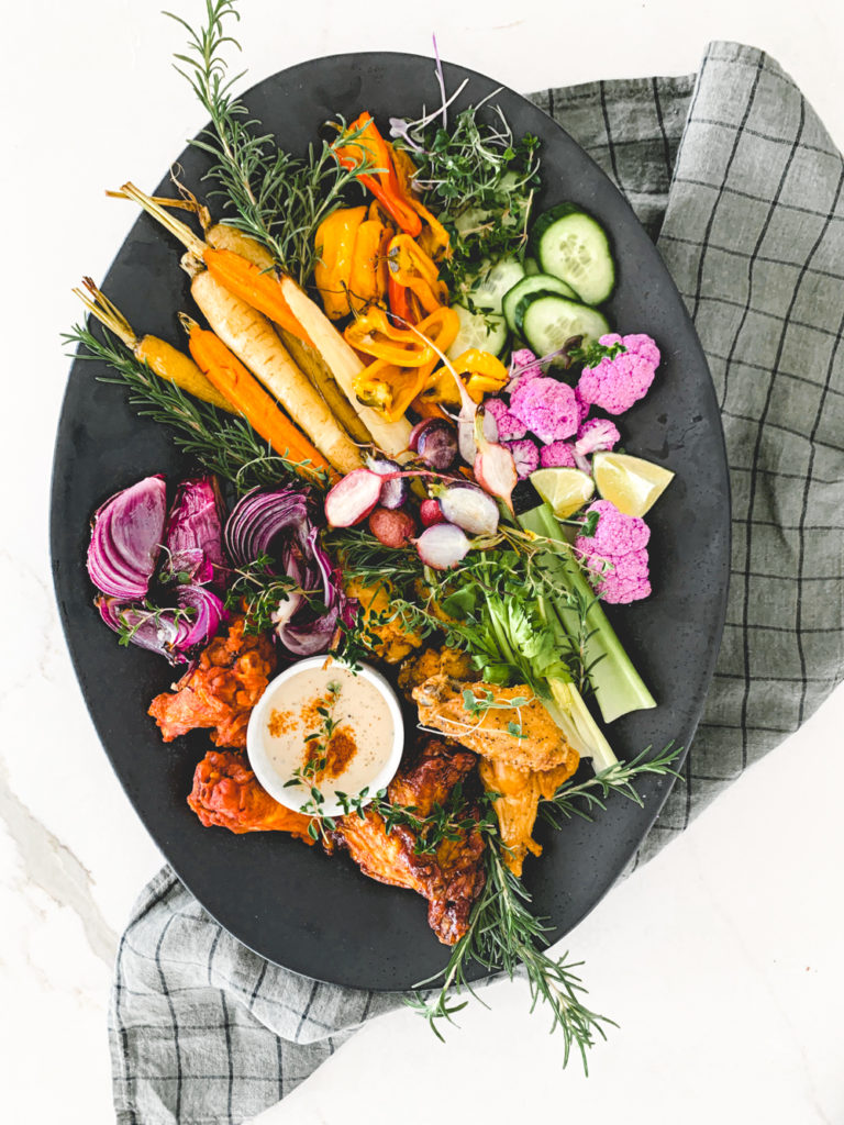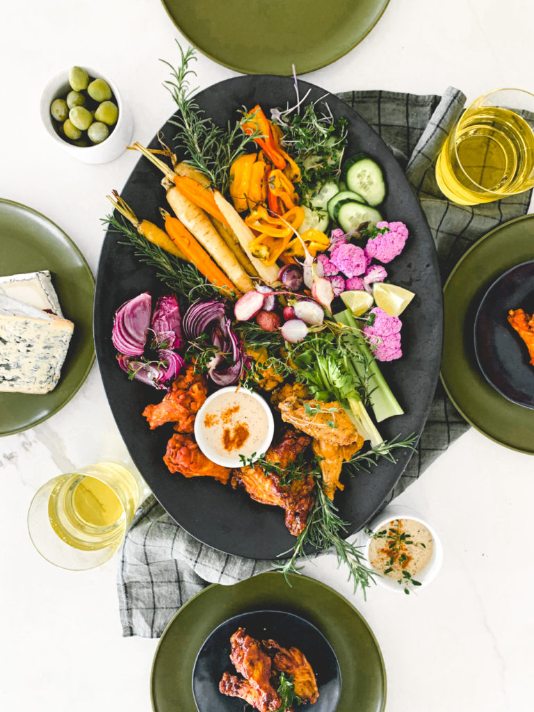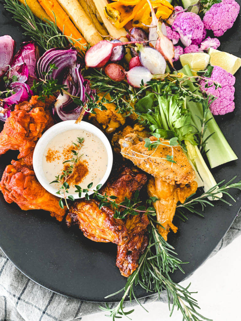 What’s more fun than a chicken wing board. I twisted it up a wee bit, cause that’s just what we do around here. I roasted most of my vegetables, added some yummy blue cheese, and some avocado dip. The roasted vegetables scream fall, the wings scream fall sports, and we love it. So what are you waiting for? Get out there and make yourself a chicken wing board cause there ain’t no thing but a chicken wing!