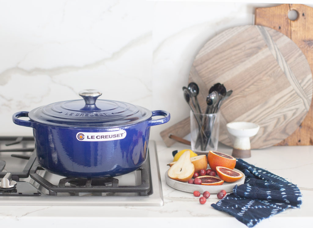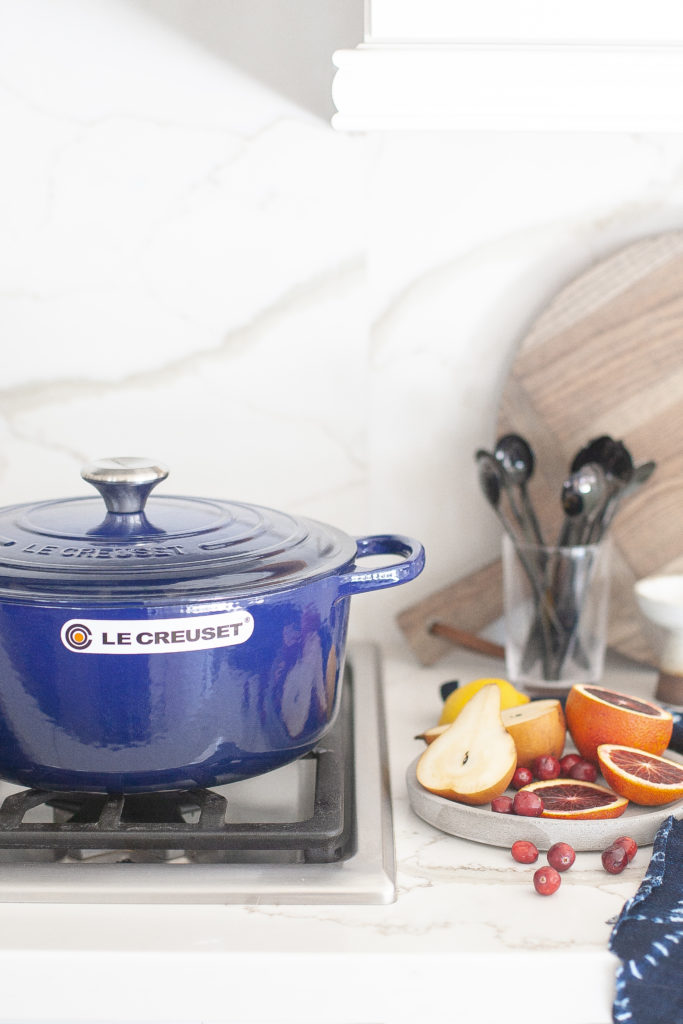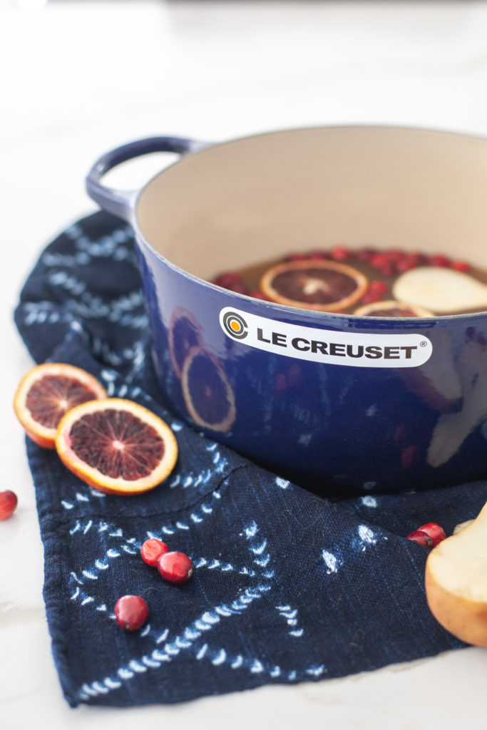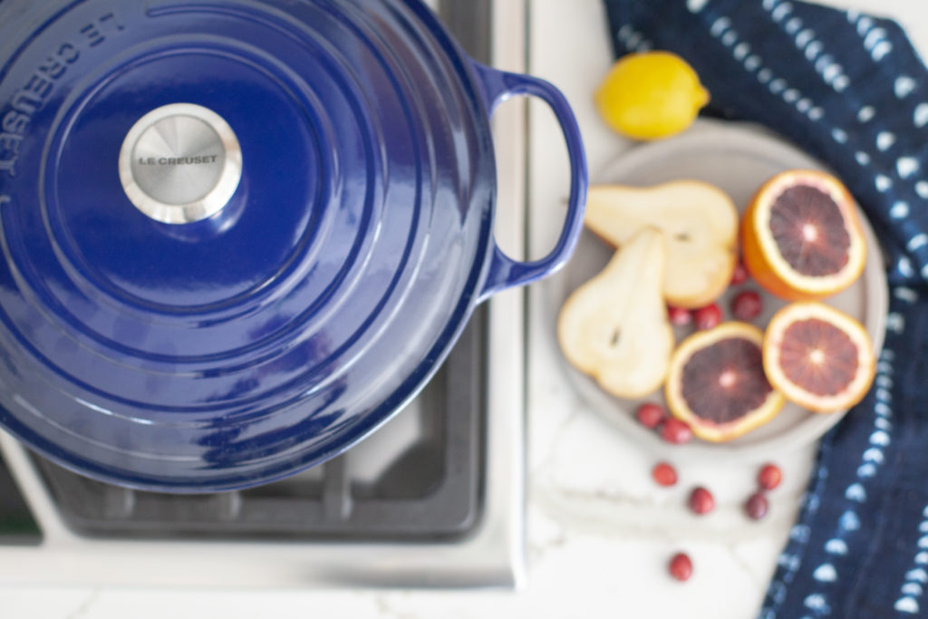 Oh right, duh, to make this yummy cider you will need a Le Creuset. It’s the best way to make cider after all; it allows it to simmer for hours without burning the cider or the bottom of the pan. Sooo, we teamed up with Le Creuset, and we are giving out one of their new indigo round dutch ovens! YES! This cool blue indigo dutch oven can be used for everything and anything! This dutch oven is one pot to invest in that you can use for a lifetime.