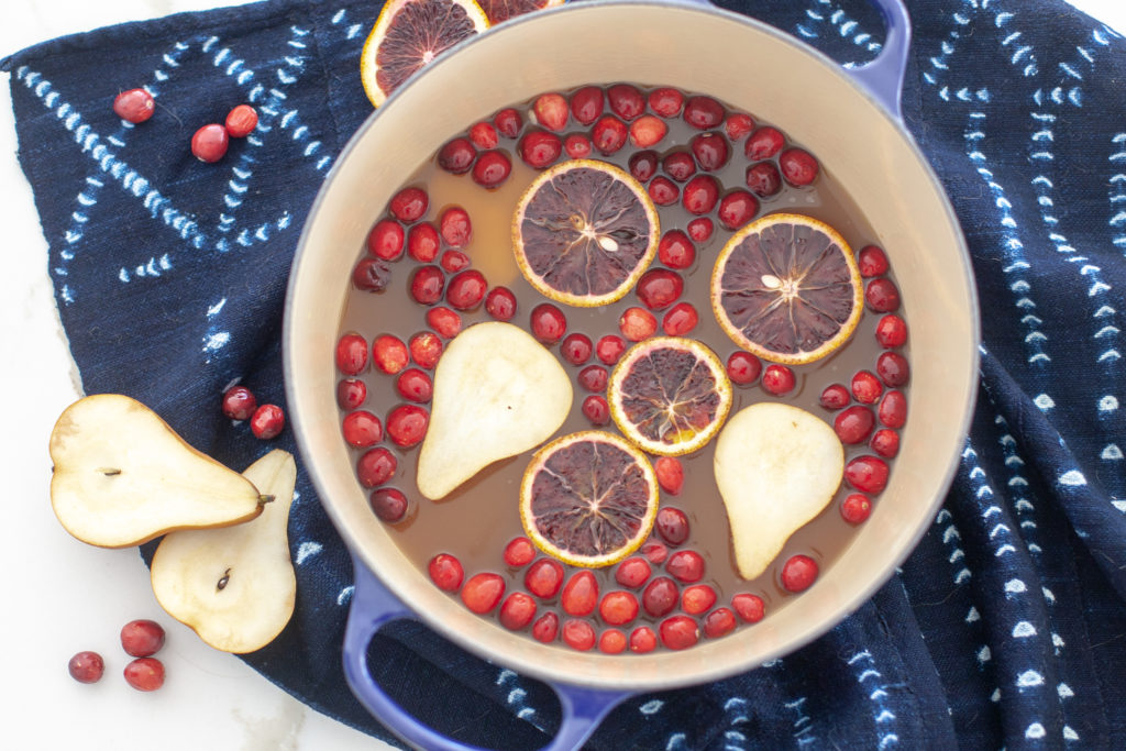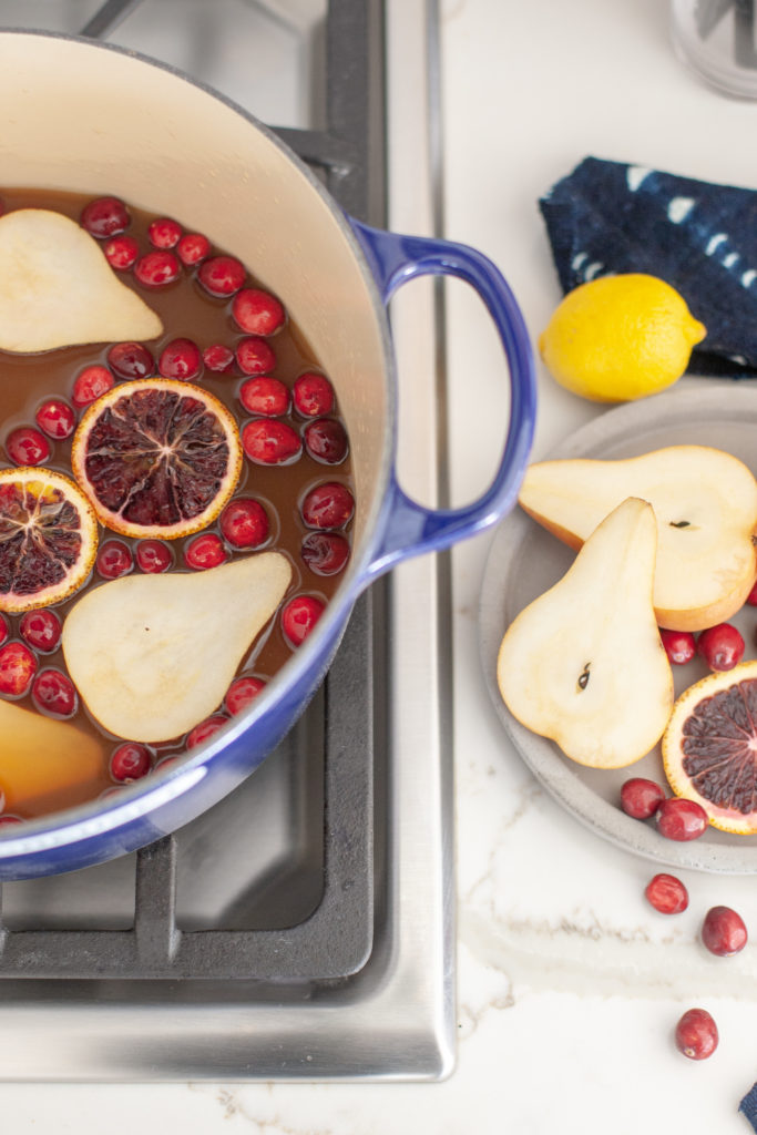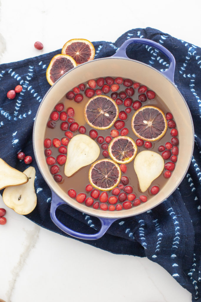 Carefully pour in the apple cider as well as all the fruit plus the cinnamon sticks into your dutch oven. Bring to a boil. Once boiled, lower the heat to a slow simmer. Let simmer for about 20-30 minutes. You will know its ready when your house is filled with that cozy fall smell we love so much. If you are patient, let it simmer longer. Keep on the stove top and reheat as needed.