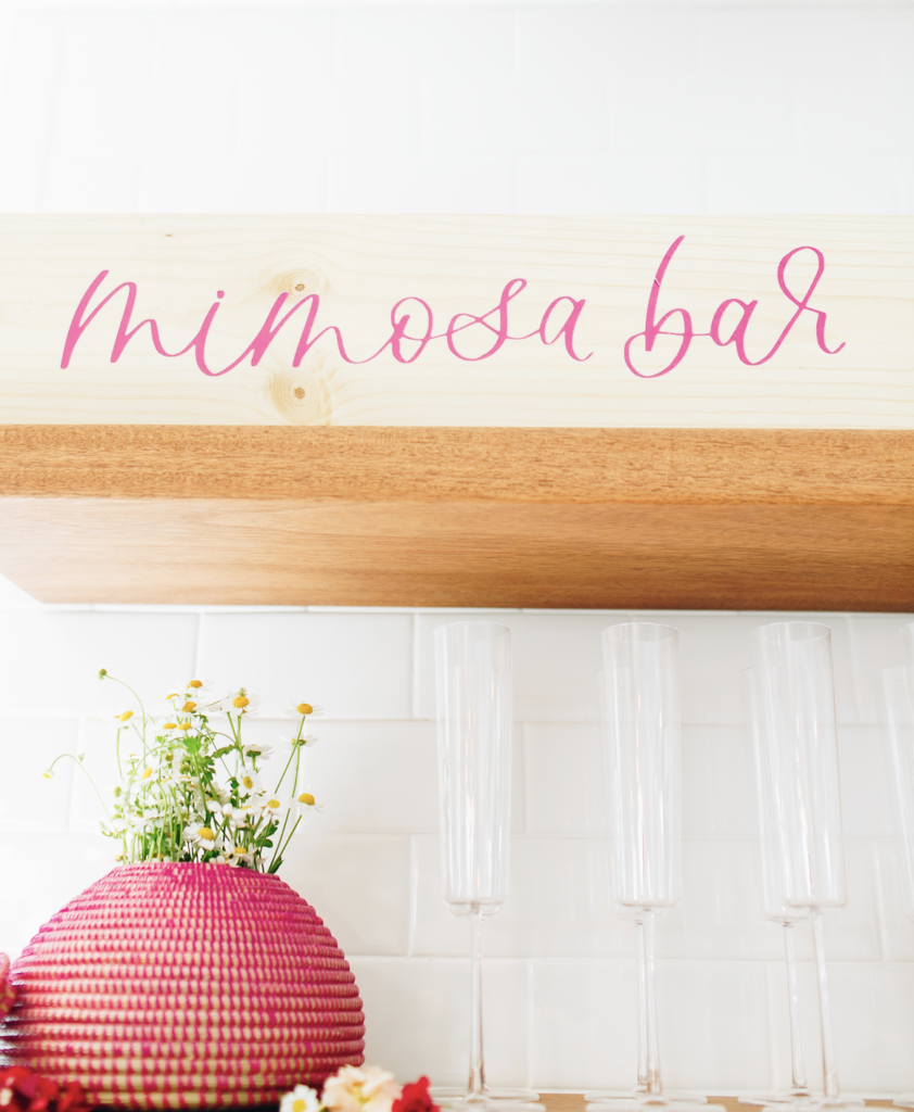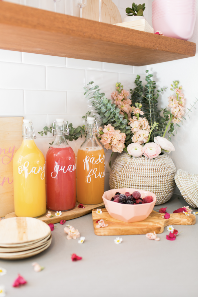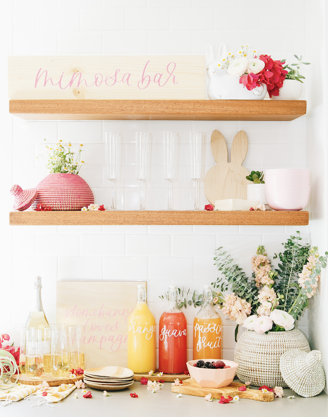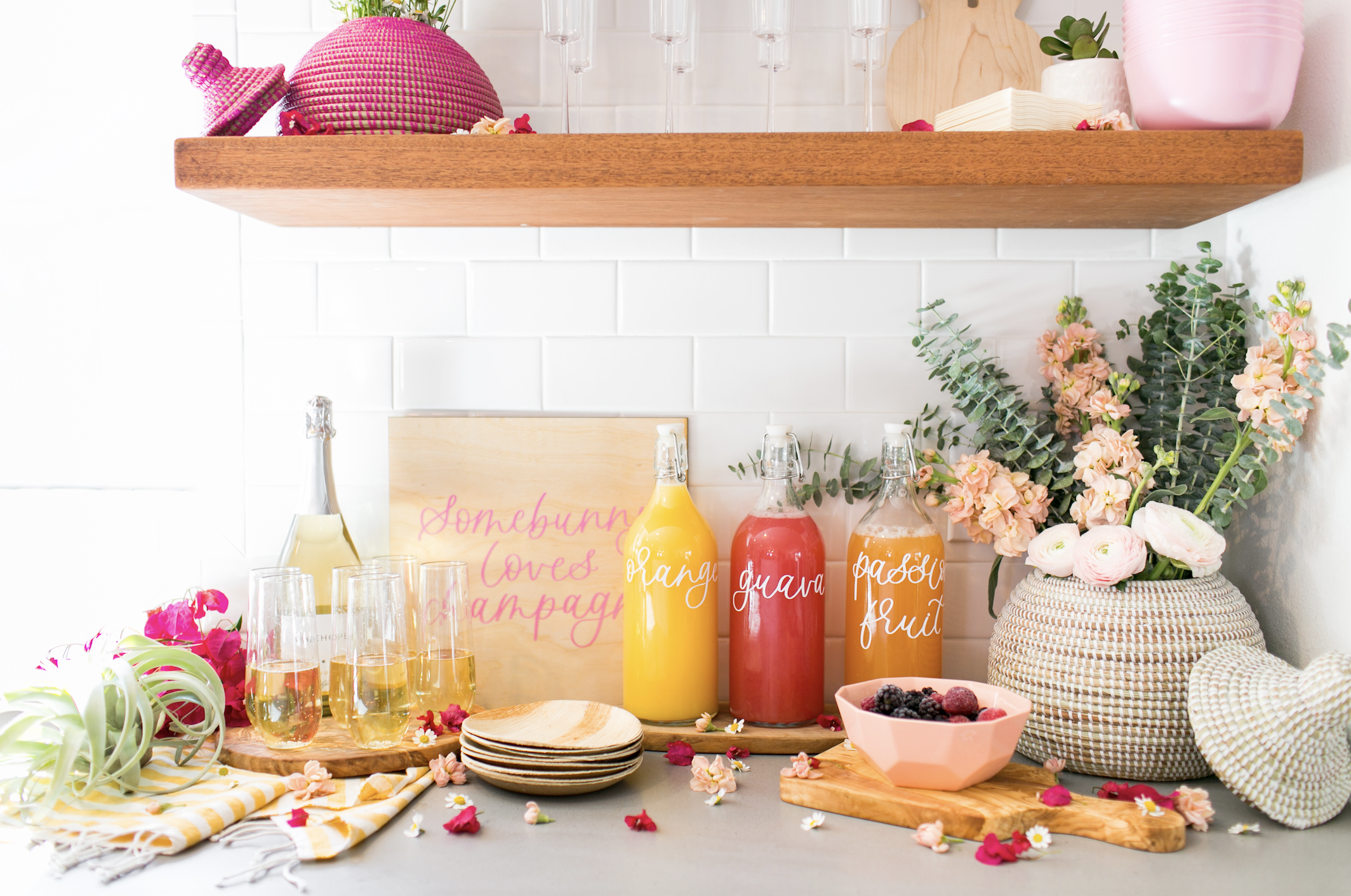 Being that we have limited space and no longer have a bar cart, I did the next best thing… I transformed our open shelving into the mimosa bar! It serves as the perfect spot in the kitchen and offers plenty of space for all the goodies. The best part is you can easily recreate this anywhere at home as well! On your kitchen island, a credenza, or even a fireplace mantle! The possibilities are endless!