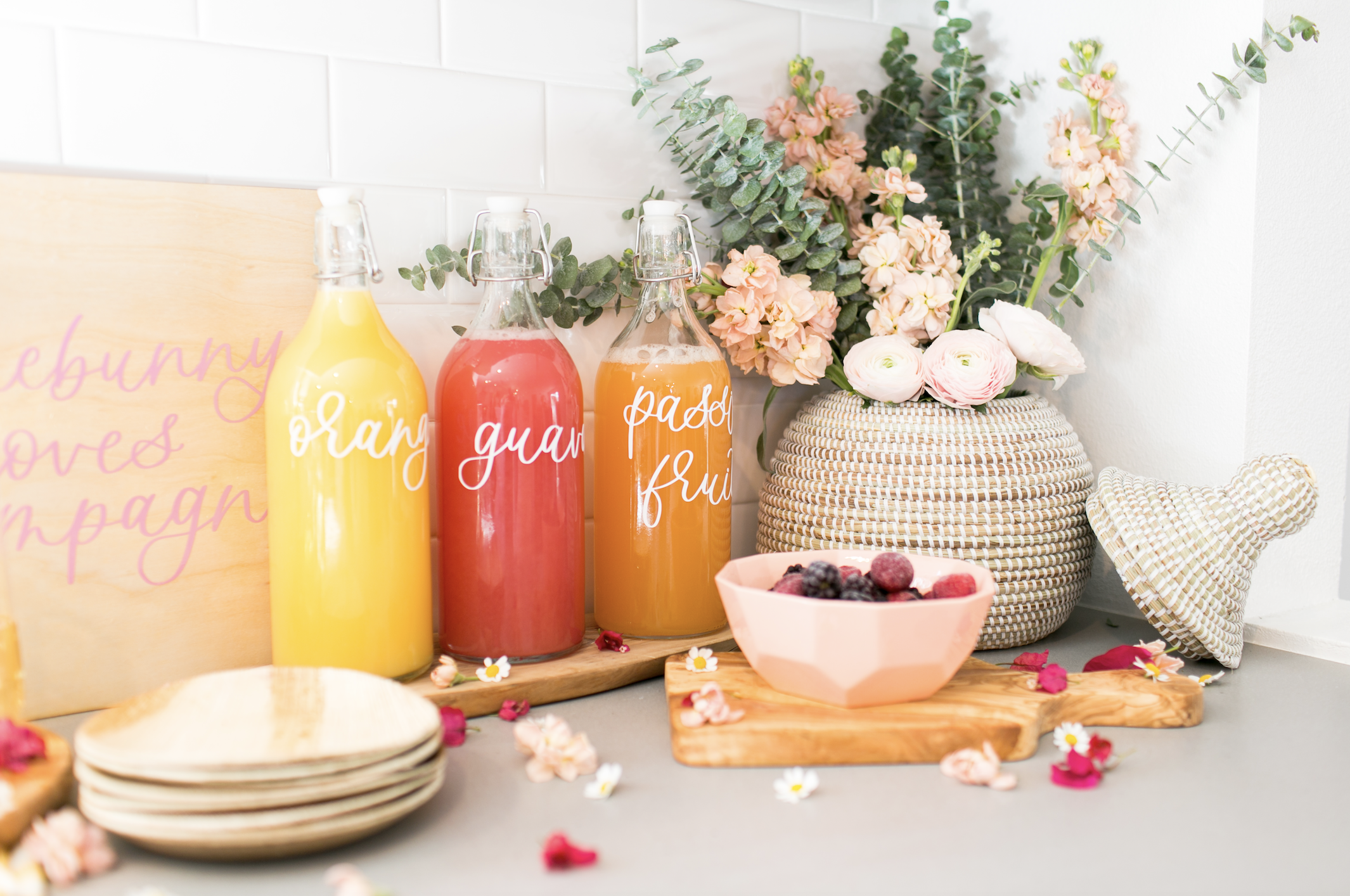 Next, I of course reached out to my friend Courtney of Poppy Jack Shop. Having simple signage pieces really adds that special detail, and you can show some personality! For example… Somebunny loves champagne, who doesn’t love that?! She also added the vinyl stickers for my juice display, don’t they look great?!