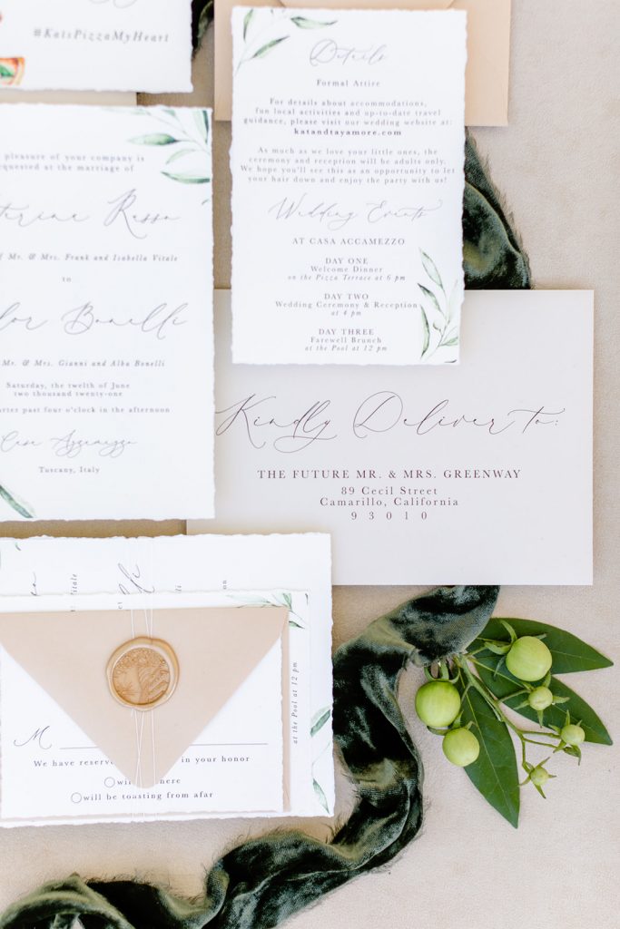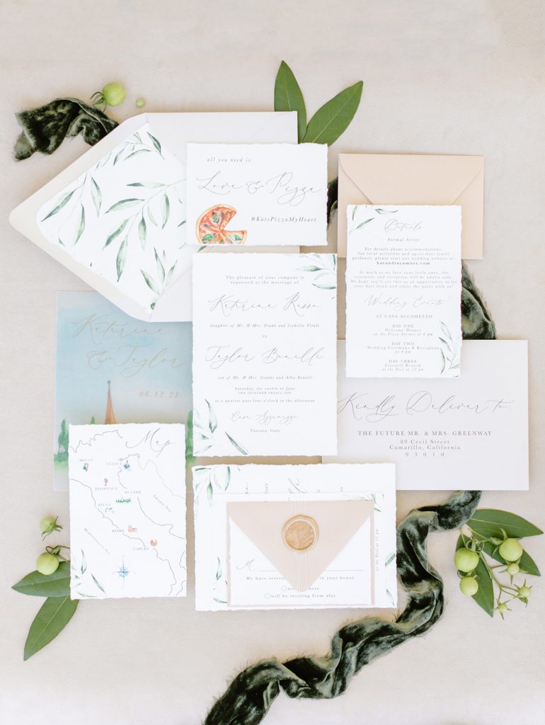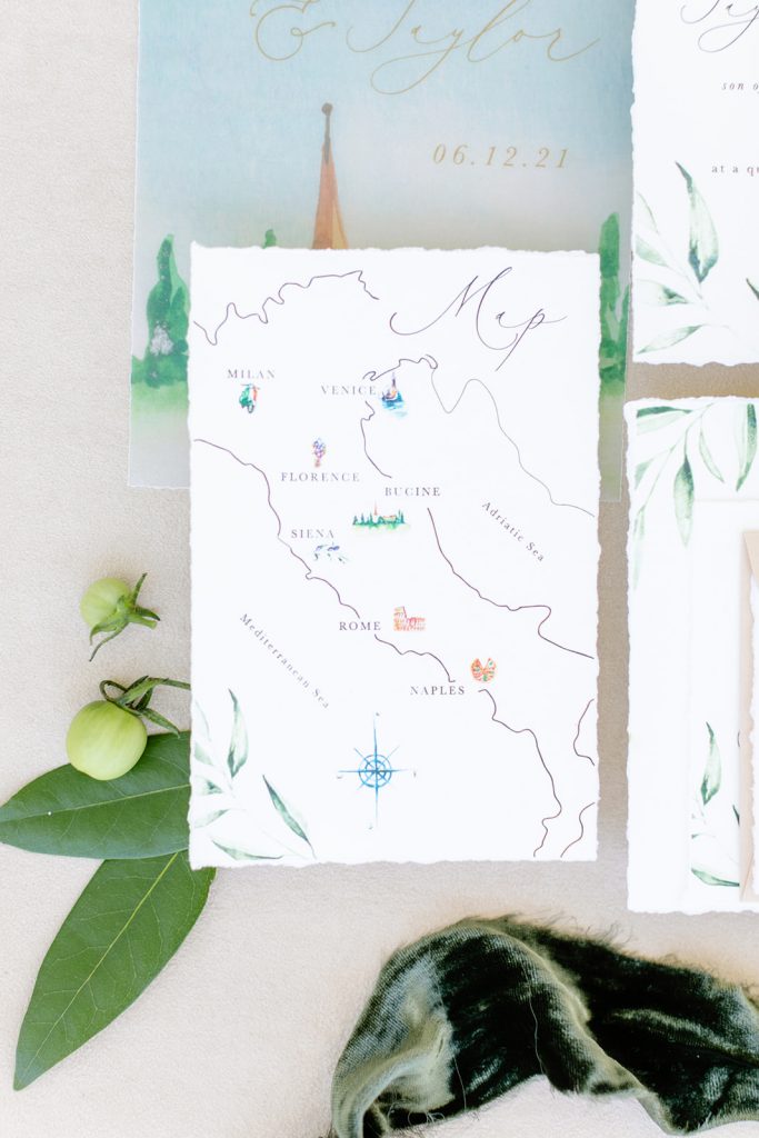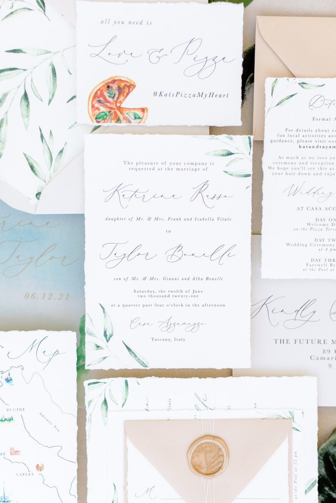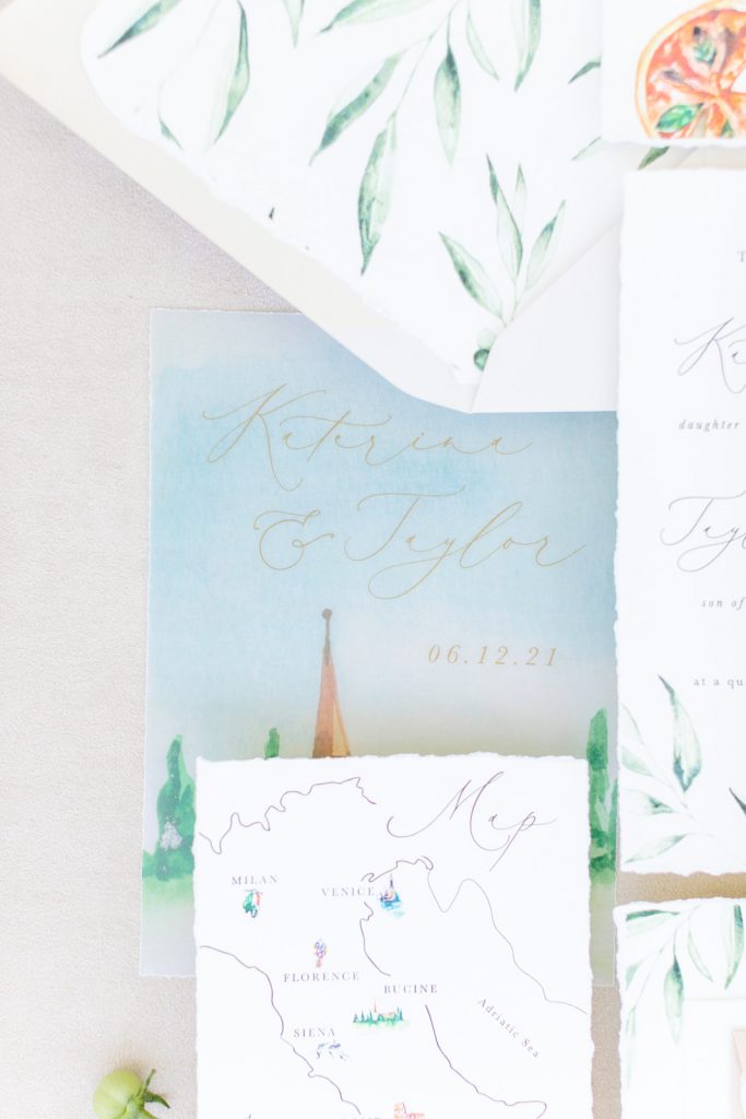 Our invitations, place cards, and signage were all done by the talented Kaylyn of Pirouette Paper.  Her invitation suite is one Italian wedding dreams are made of!!  I loved her attention to detail and that stunning watercolor touch that you see throughout the signage as well.  And I personally can’t get enough of the wax seal on place cards.