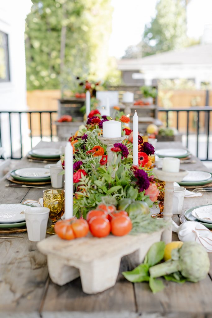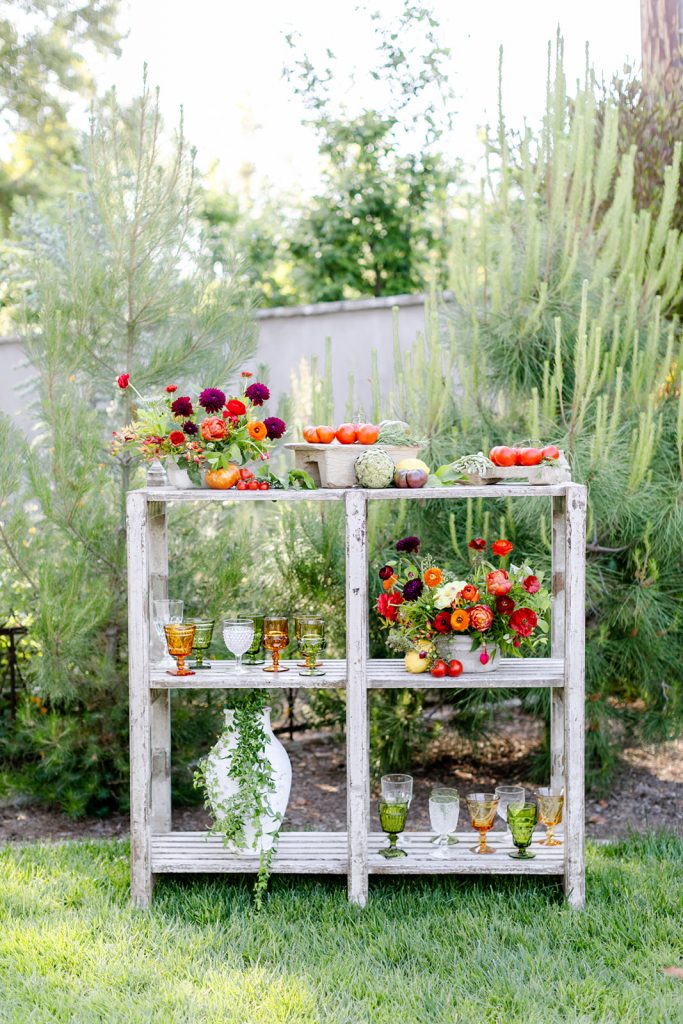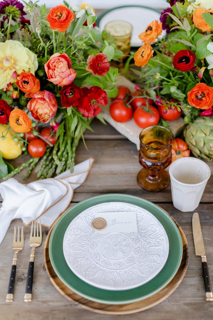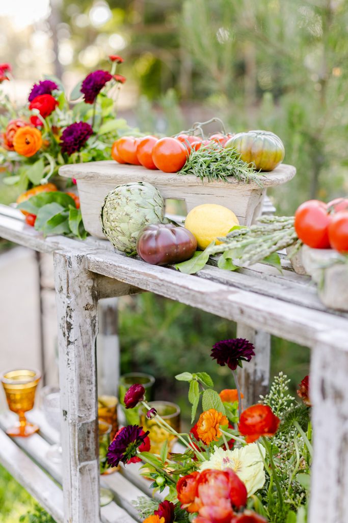 Golden Sol Floral Co did an amazing job of bringing not only gorgeous florals but tons of produce as well!  Adding tomatoes, artichokes, lemons, and other seasonal veggies and fruits really added character to this table and brought the taste of Italy right here to California!