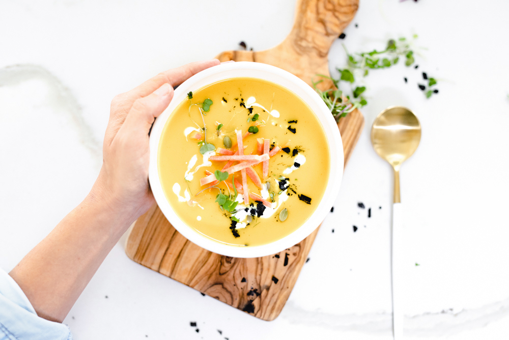 Ladle into bowls and garnish with a sprig of thyme, sliced chives, fennel fronds, thinly sliced apples, and a drizzle of olive oil. Feel free to get creative when it comes to garnish, jazz it up or do nothing. Whatever your palette is craving that day.