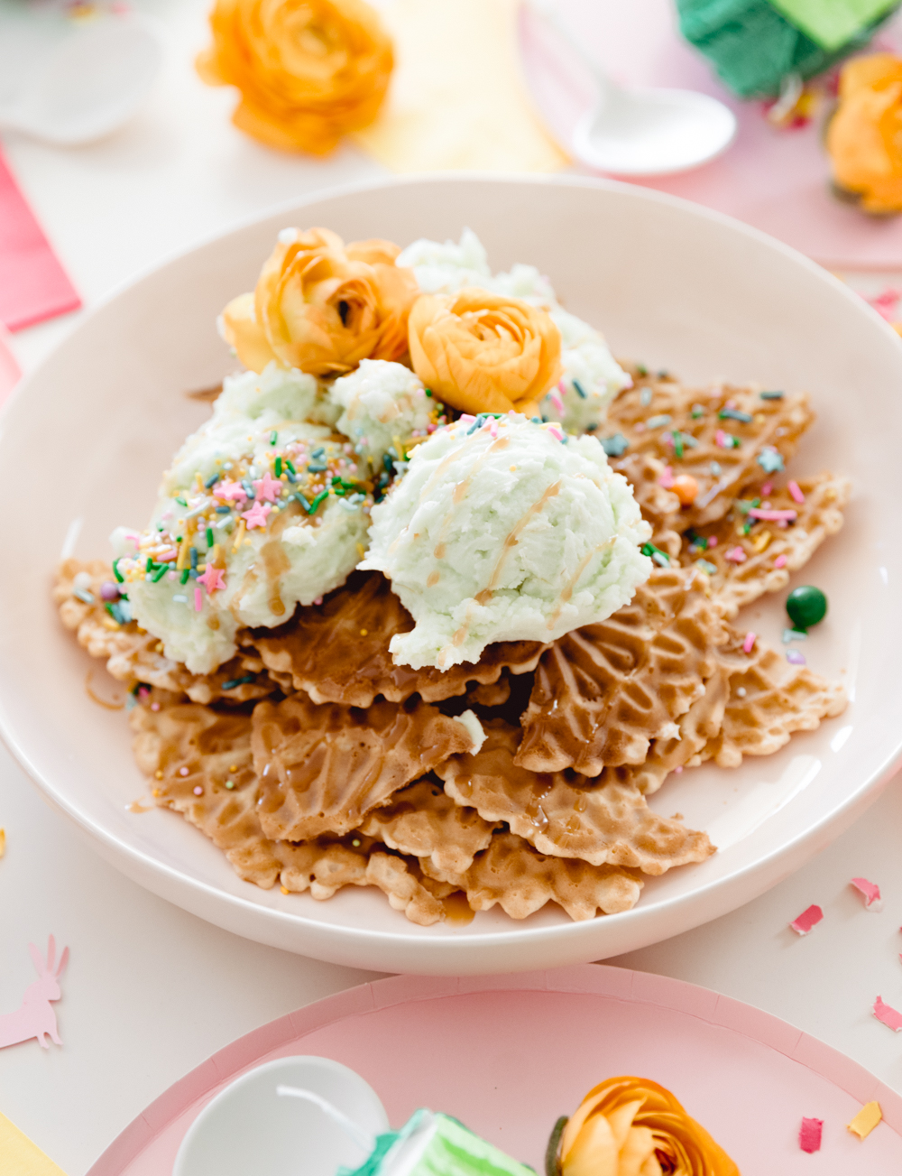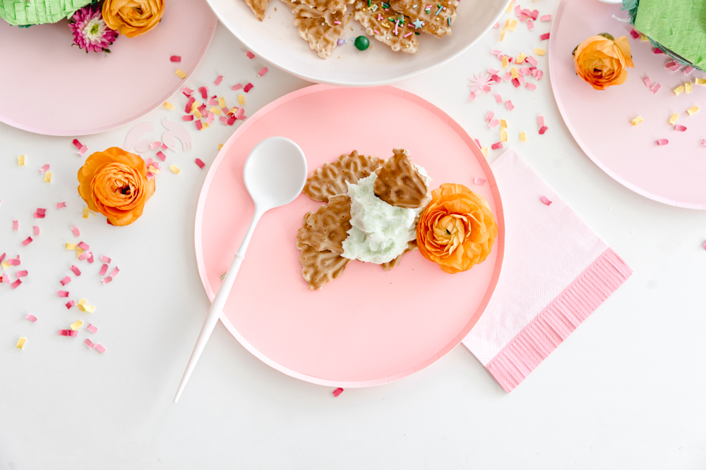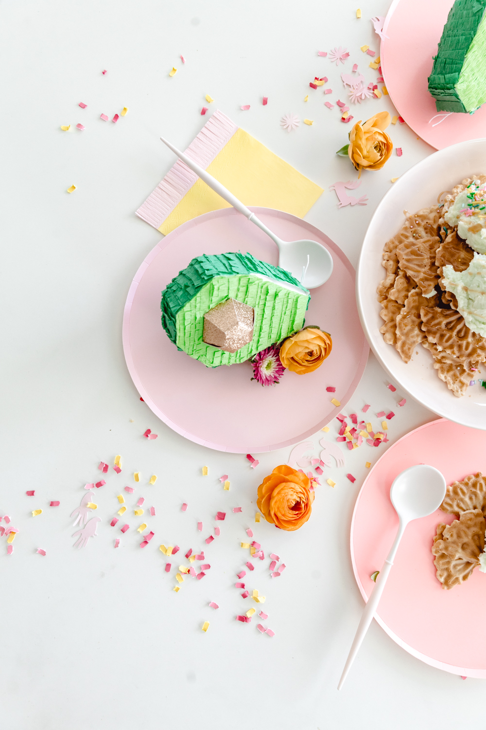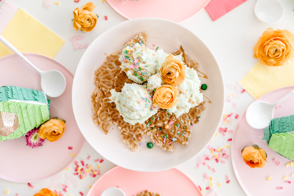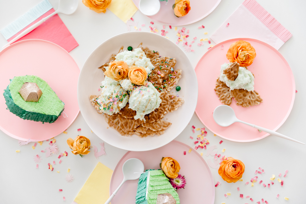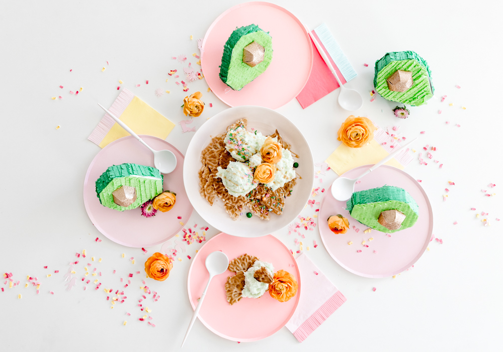 Since this is fun for the whole family, it only makes sense to set up a fun table for the kids. This is where Witty Bash and Lula Flora come in! How adorable are these avocado pinatas?!? Add in bright colored plates and perfectly themed fringe napkins from Witty Bash, and this is a festive setup ready for some ice cream nacho eating!