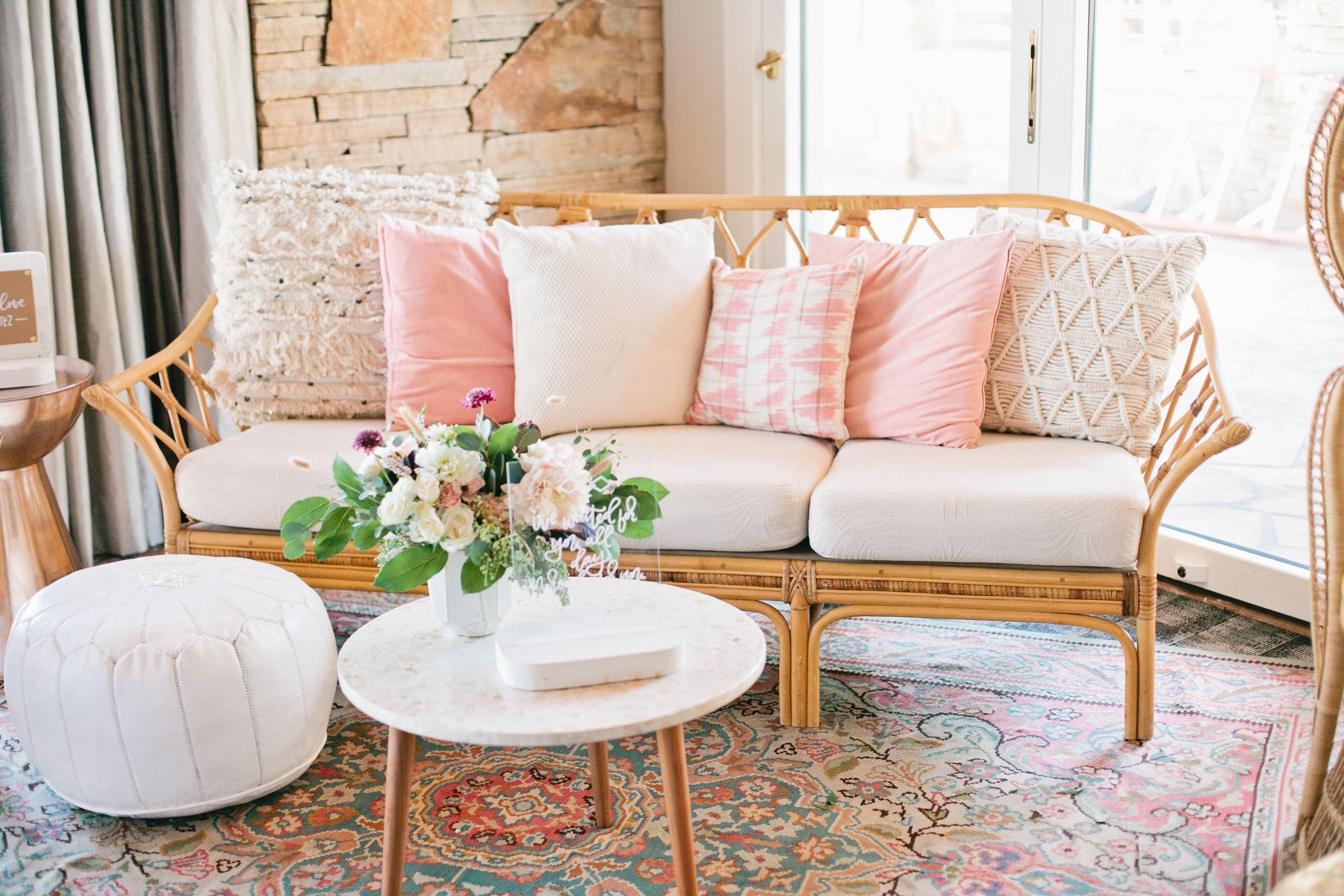 “All the vendors that came together for our special celebration make the event that much more memorable. My dear friend Megan Welker, along with the ultra talented Jacquelyn Kazas of Beijos Events, took on the huge task of styling the whole thing. I gave them the lyrics to the song and a couple colors I liked and they came up with the rest! It’s amazing how their minds work. The leather and the gold and the soft floral palette came together so perfectly. The acrylic plates with song titles that had baby in them was such a cute ode to my DJ husband and the adorable lounge area, styled so perfectly in pinks and nudes just took everything up a notch!!