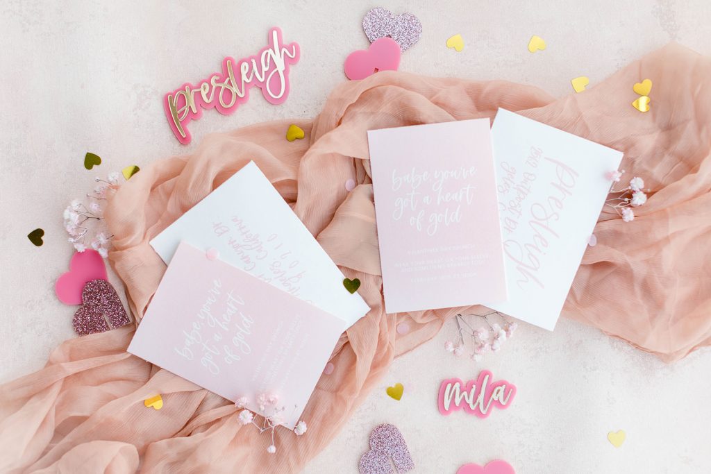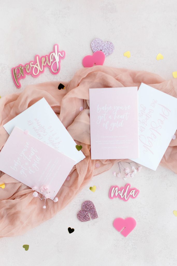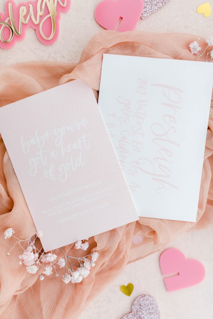 Kicking it off with a pretty little invite by David & Leanna with all the amazing details! Lorin styled it so well on a pretty Party Cursh Studio linen with pretty babies breath and gold heart confetti. Because with a heart of gold themed shoot, you’ve gotta have that!! I’m obsessed with all of the details Leanna did for this one, specifically those amazing place cards!