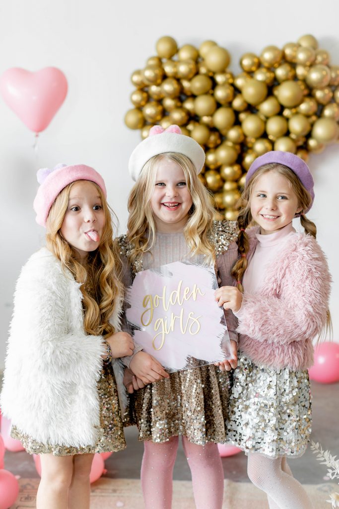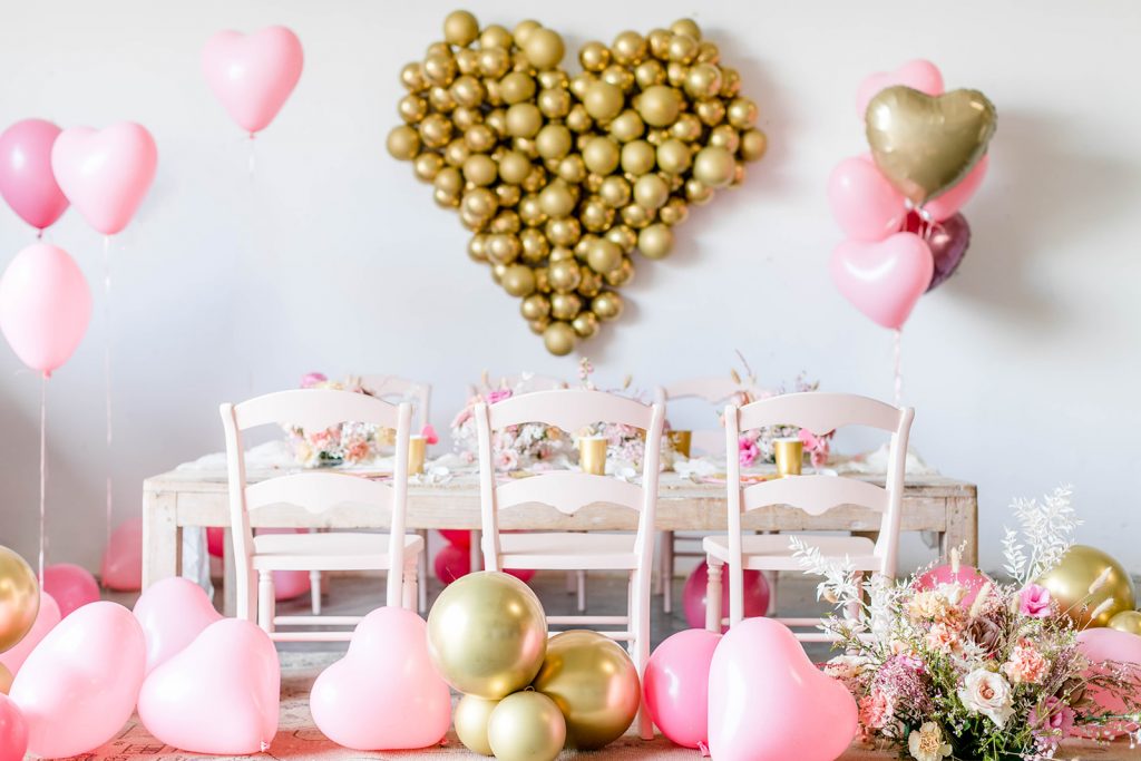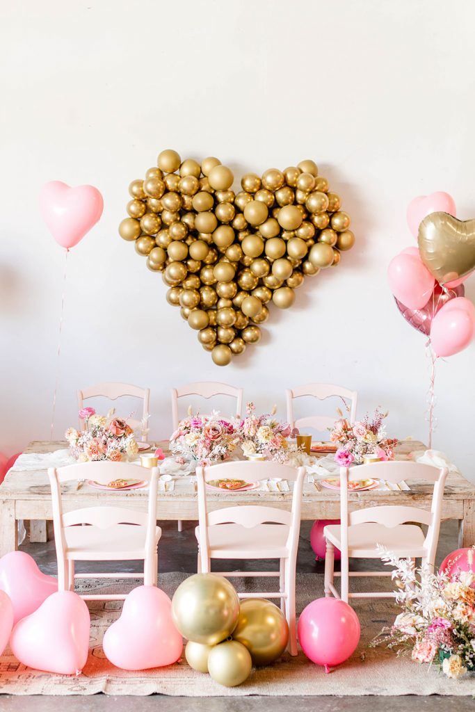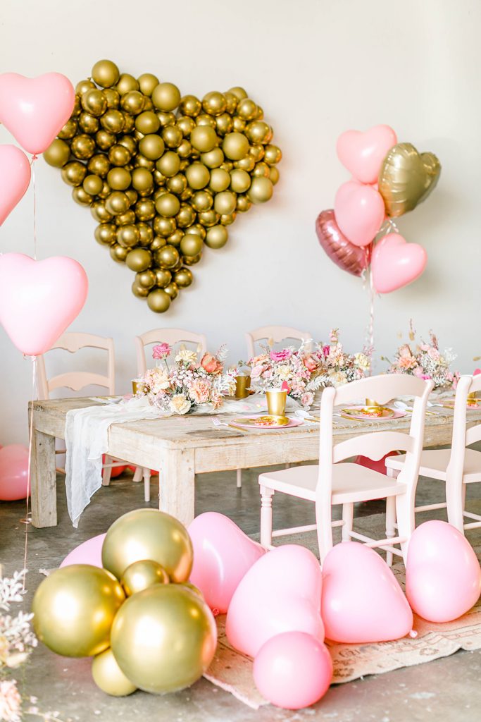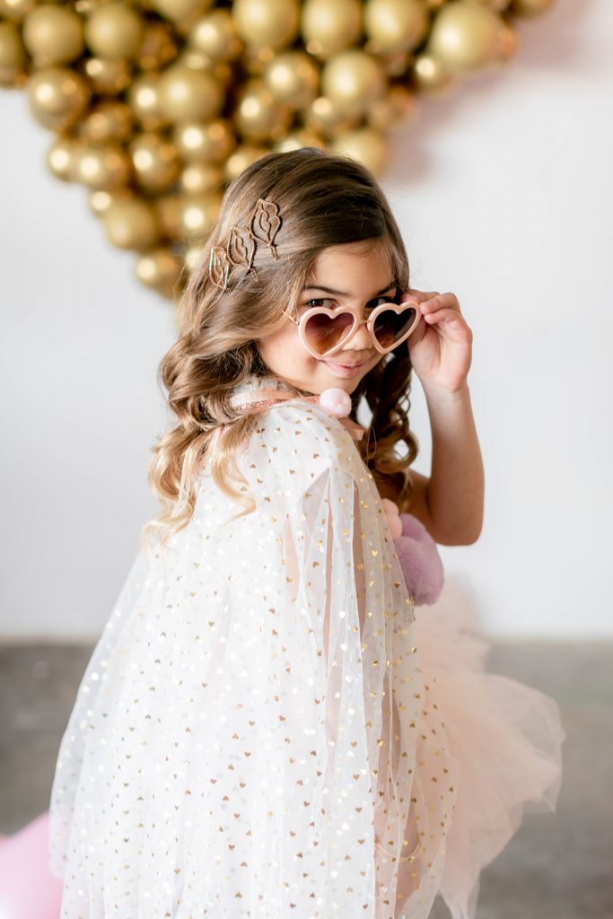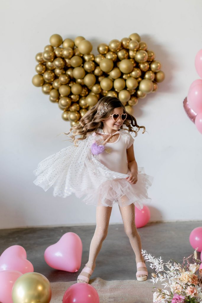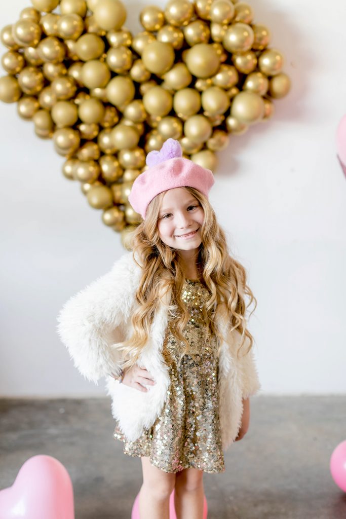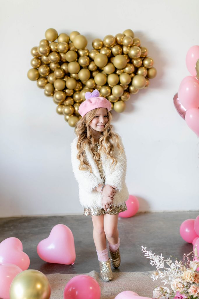 Let’s start with the obvious, that adorable gold heart by The Pop Shop! Isn’t it such a cute backdrop?! You could do it in so many colors for a Valentine’s Day Party or even a birthday party, but for a Heart of Gold shoot, you better believe I went with gold! We added helium heart balloons and tossed a few more around the floor as well. I love the look of them tossed effortlessly on the floor, don’t you?!