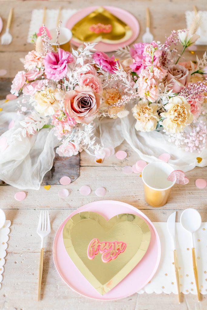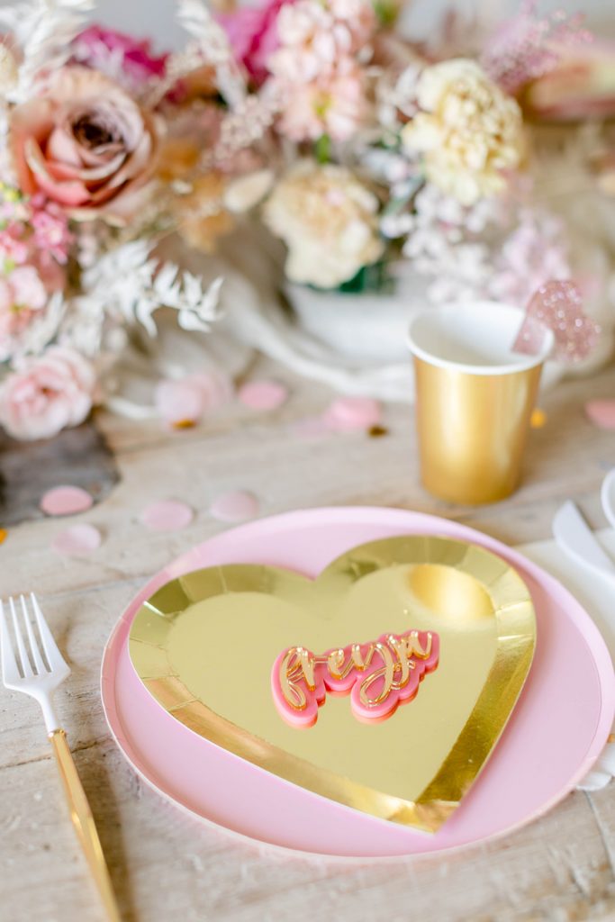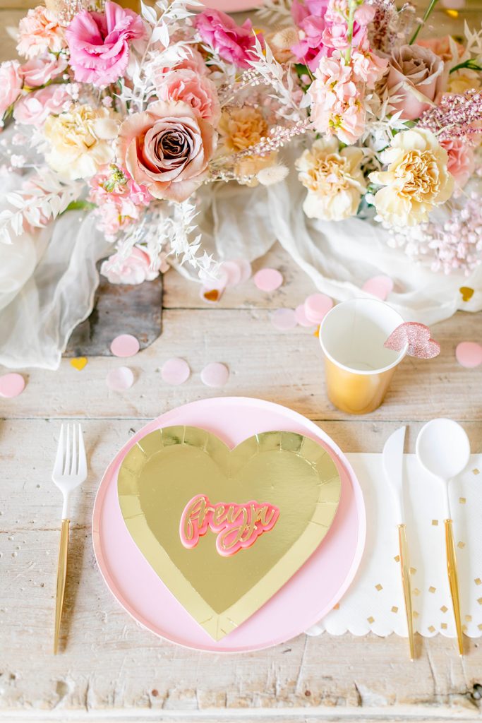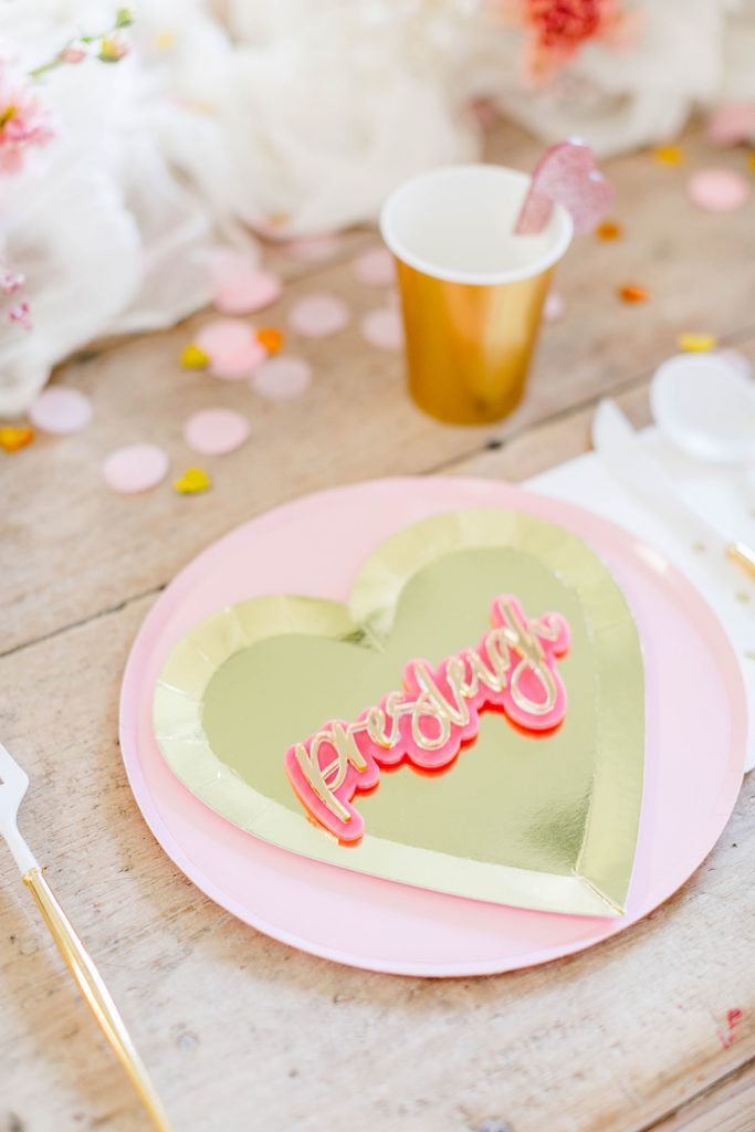 Talk about cuteness, these place settings are everything! The tabletop is all from Oh Happy Day Party Shop. I used their signature pink plates, gold hearts, gold cups, gold confetti napkins, and Sophistiplate Bella flatware.