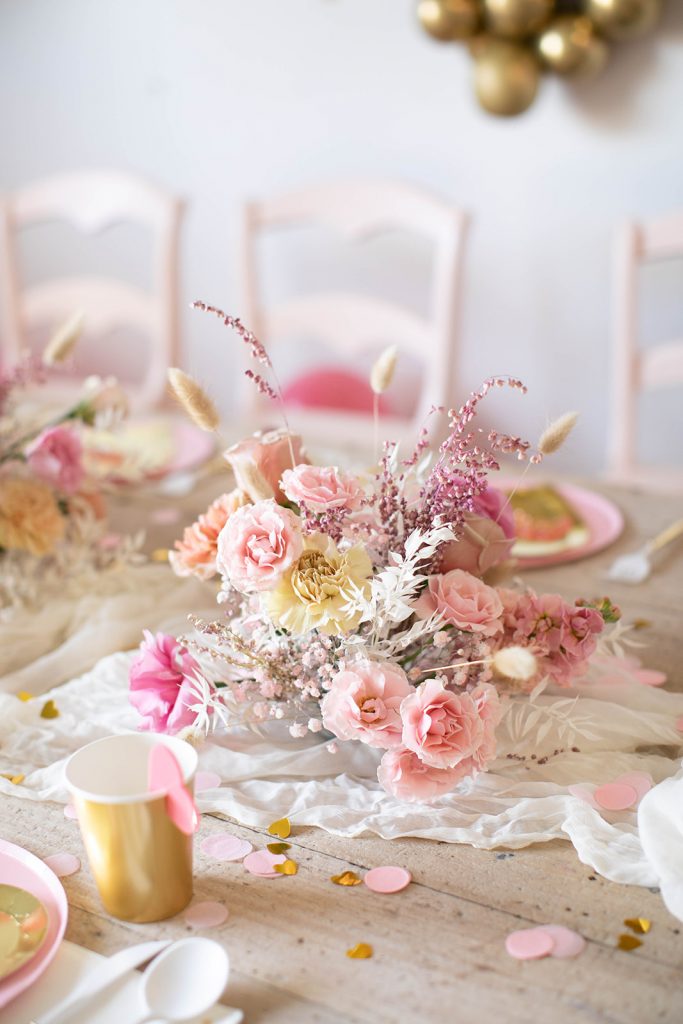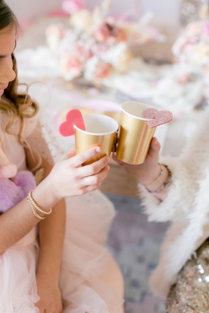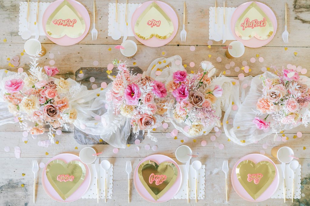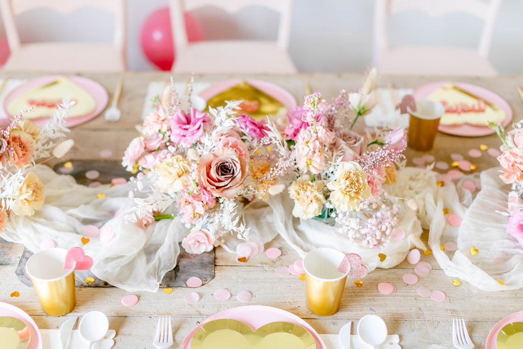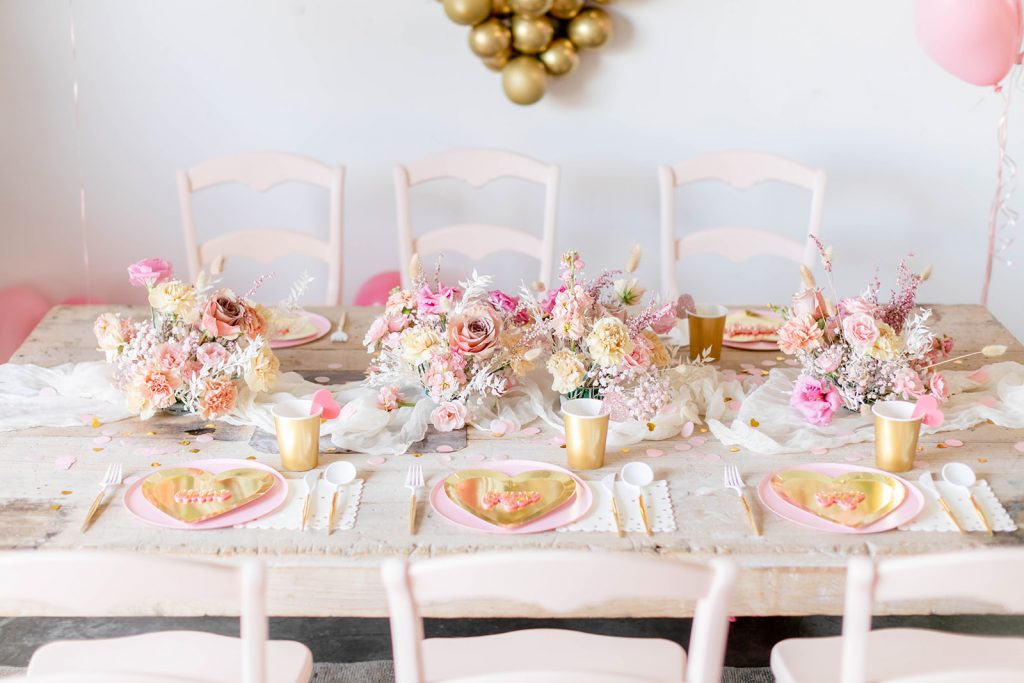 Talk about cuteness, these place settings are everything! The tabletop is all from Oh Happy Day Party Shop. I used their signature pink plates, gold hearts, gold cups, gold confetti napkins, and Sophistiplate Bella flatware.