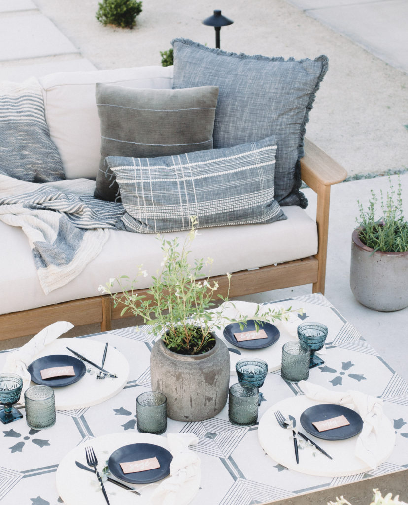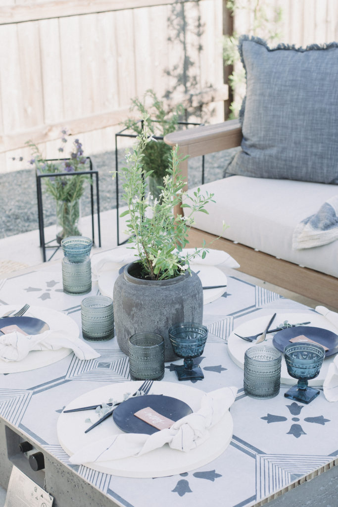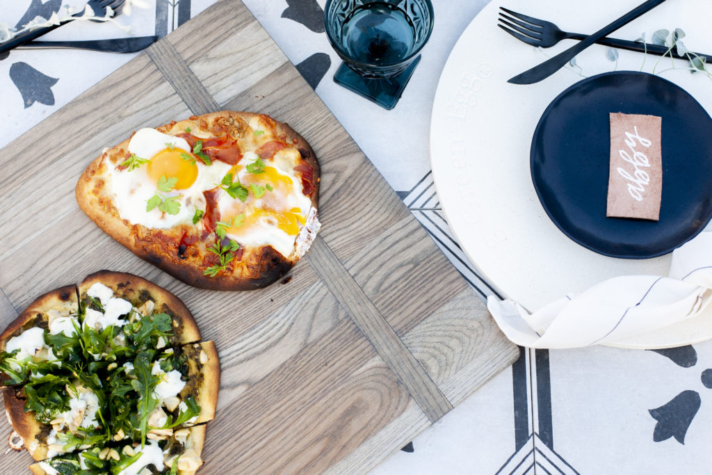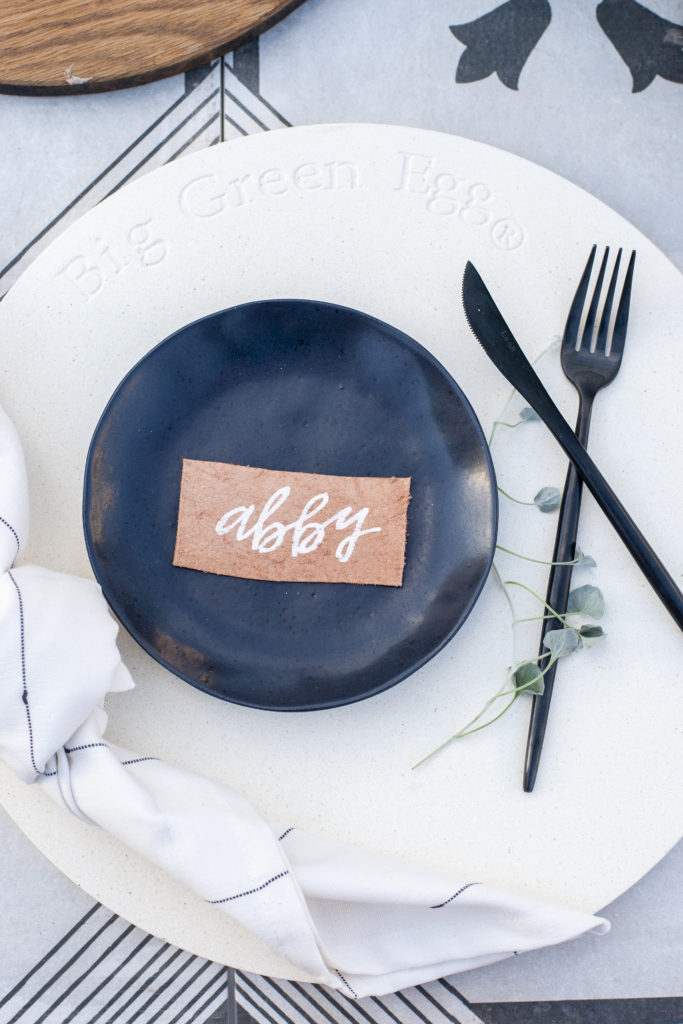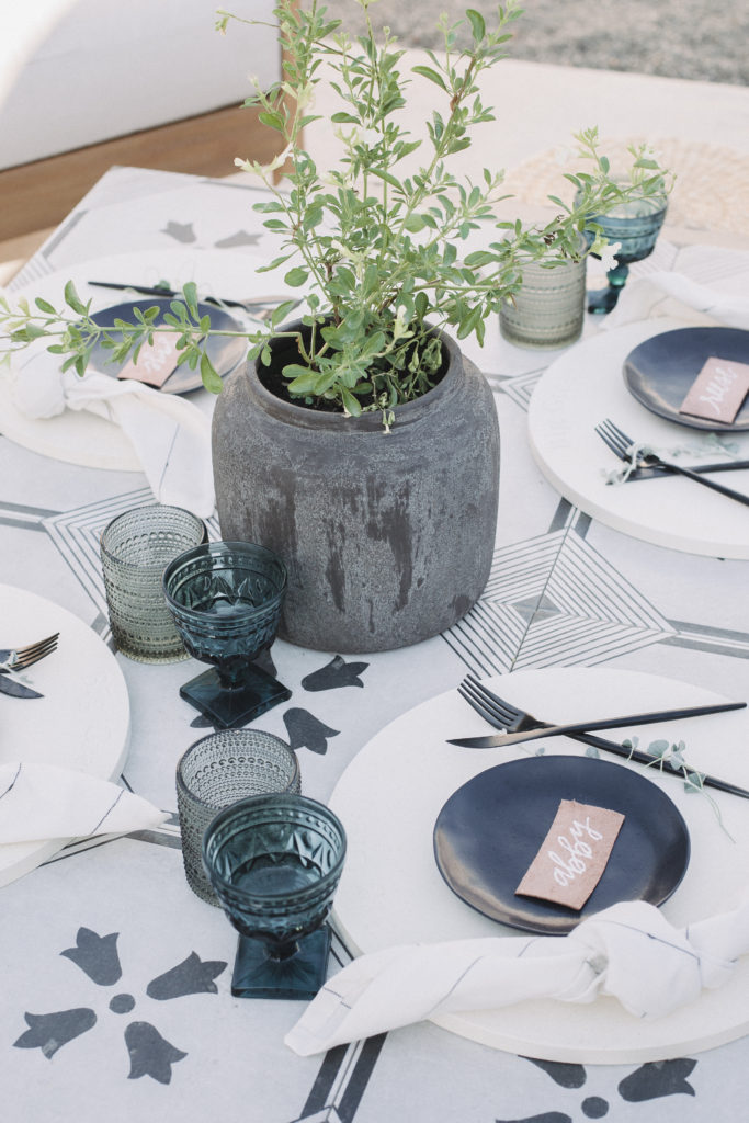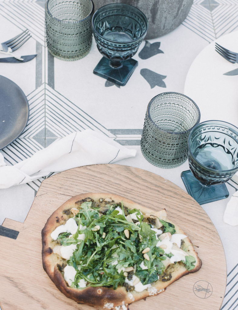 I used the Big Green Egg’s pizza stones as chargers for the table. It’s a fun way to add some modern grill-themed detail into your tablescape. I added some dark grey-blue vintage glassware that I have had for years that I found at a vintage shop in combination with the Fortessa Jupiter Double Old Fashioned Glass in smoke from Sur La Table—followed by these white and black napkins, Baird Appetizer Plates, and my black flatware.