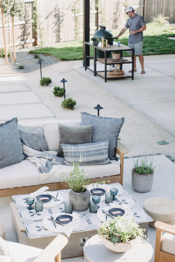 Now, no outdoor pizza night is complete without a little setup to dine al fresco. I covered our firepit up with some ceramic tile from Bedrosians. I love this decorative tile called Graphite Dynasty. We got it to create an outdoor wall that my husband is currently building. So I thought let’s make a portable tabletop to match the wall. It’s nice to take off and on the firepit when we need a table. Stay tuned for an update on our backyard design!