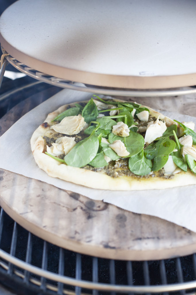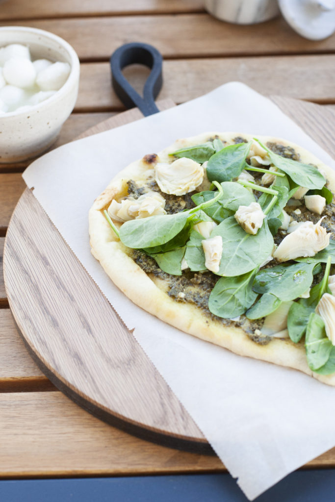 Spread the flatbread or dough with pesto and top evenly with spinach and artichokes.