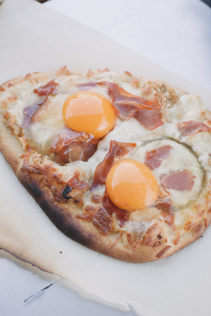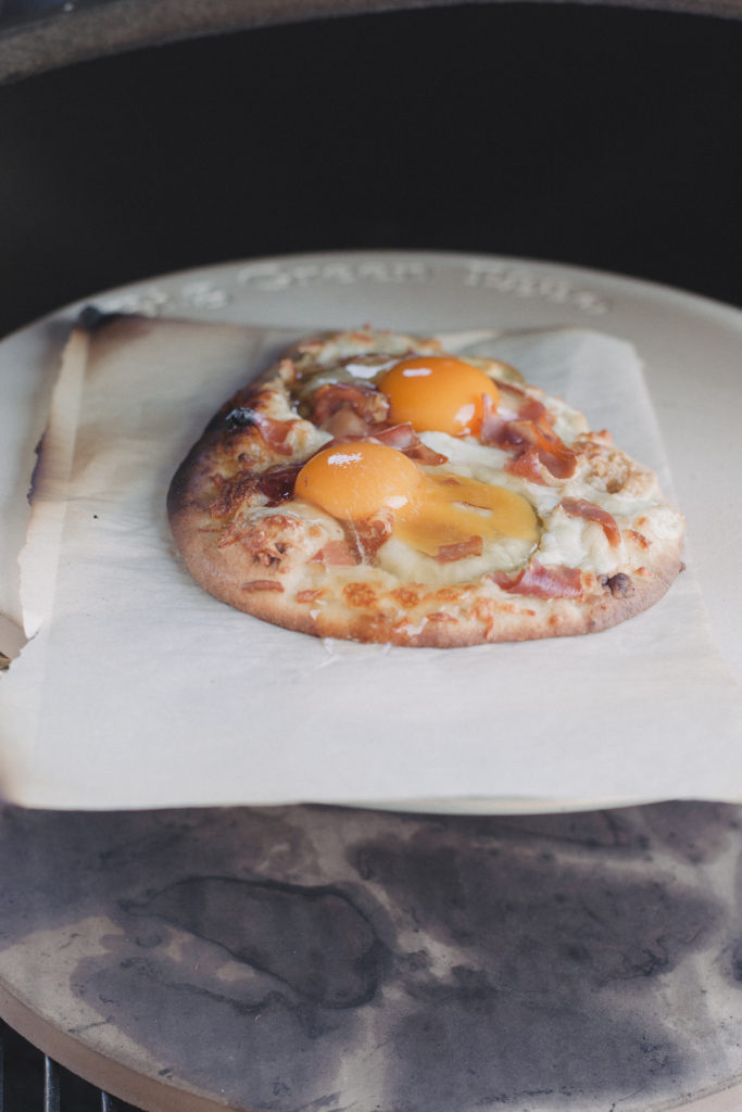 Remove the pizza from the oven and add the eggs. Take a measuring cup and twirl on top of the pizza where your eggs will go. This process will create a bit of a well, so hopefully, your eggs don’t run all over the pizza. Mine still did a little bit, but it’s still really yummy! Season the tops of the eggs with salt and pepper and place back in the oven. Cook for 3-5 minutes, until the egg whites are relatively firm and the yolks are barely set.