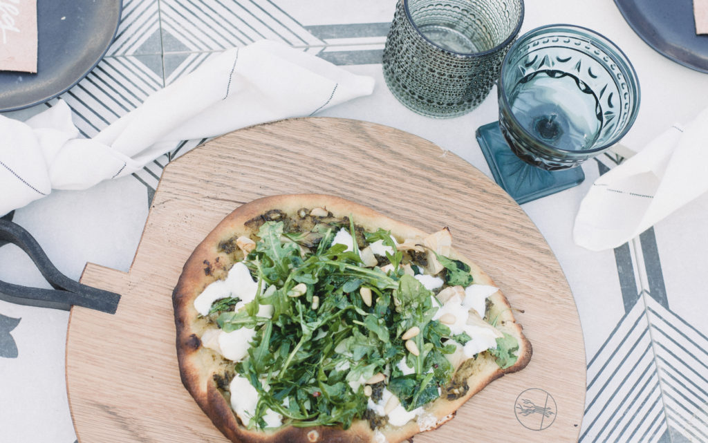 ARTICHOKE PESTO AND BURRATA FLATBREAD WITH LEMONY ARUGULA
