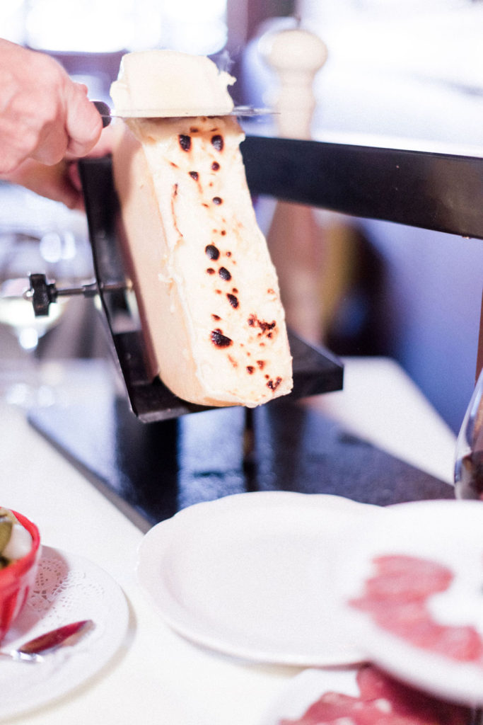 Raclette is a cheese specialty from the Canton du Valais in Switzerland, and also the name of the cheese itself. It is prepared by holding a round of the local cheese close to the fire, scraping the top, softened part off onto a plate once it has melted. The word “raclette” comes from the verb “racler,” which means “to scrape” in French.