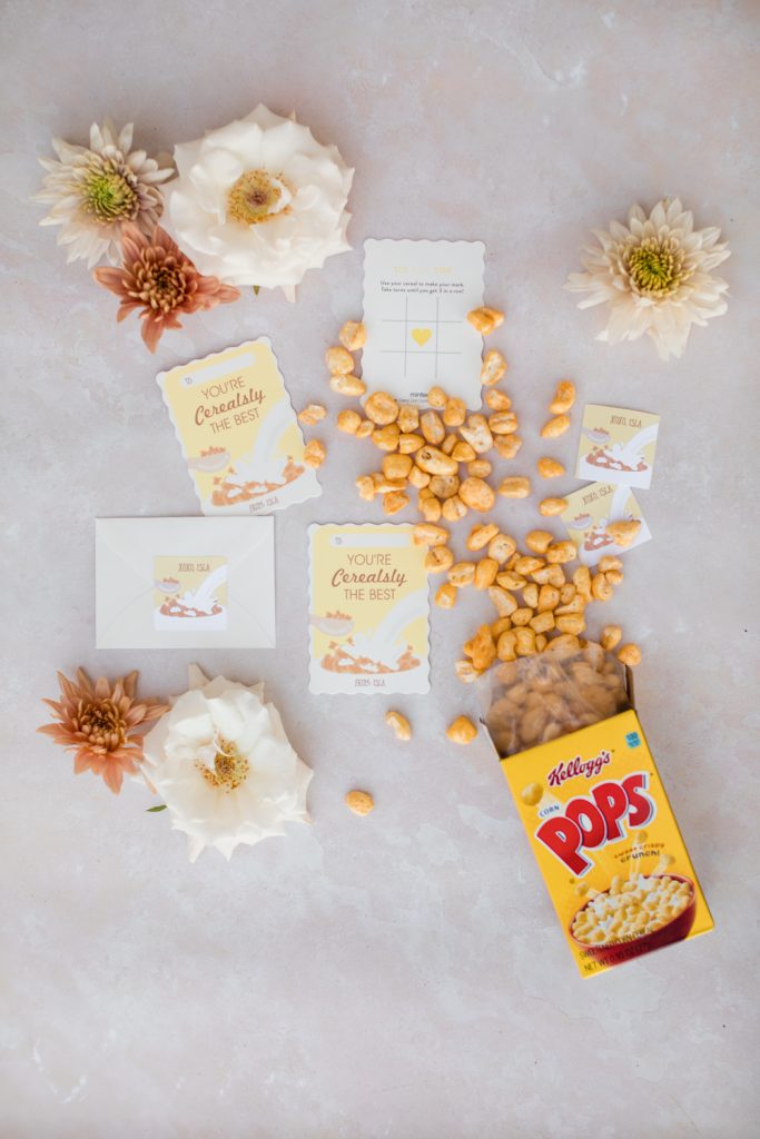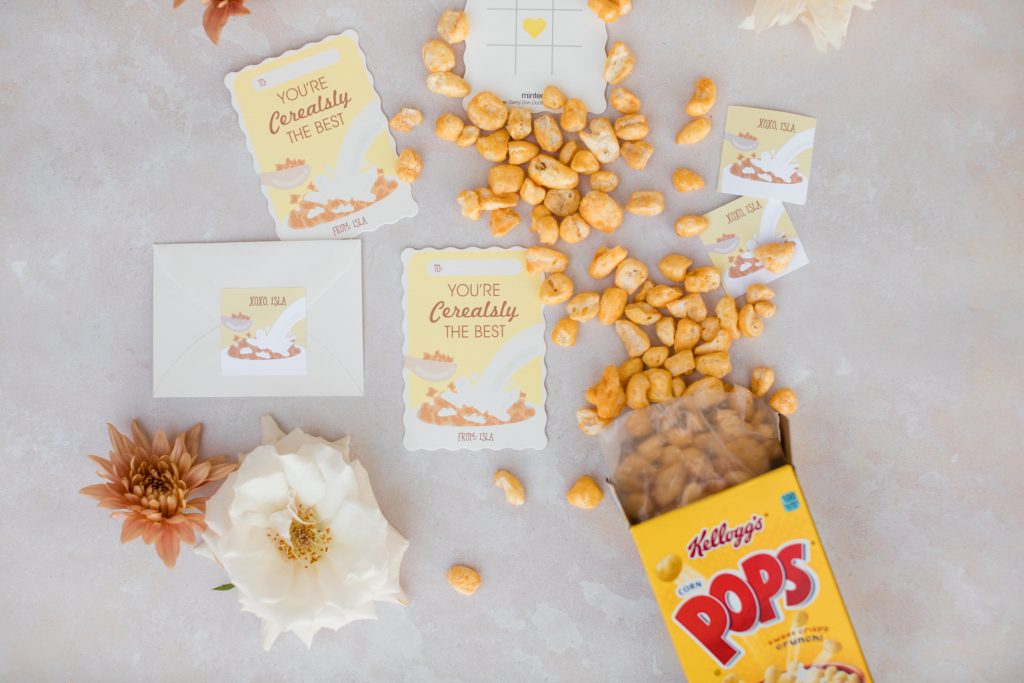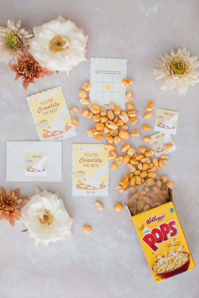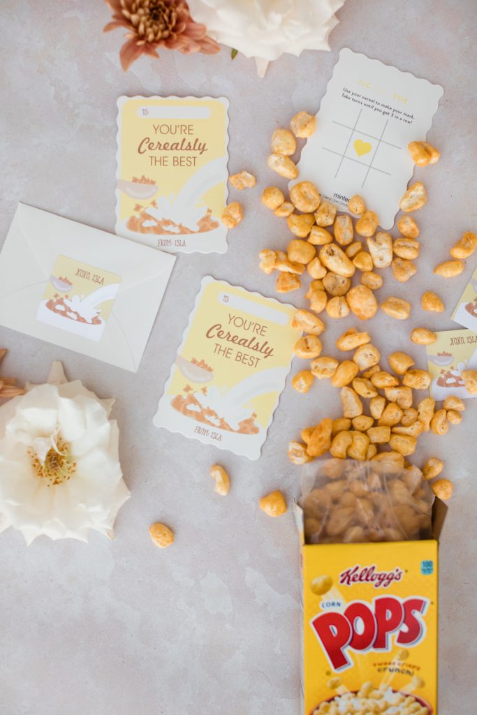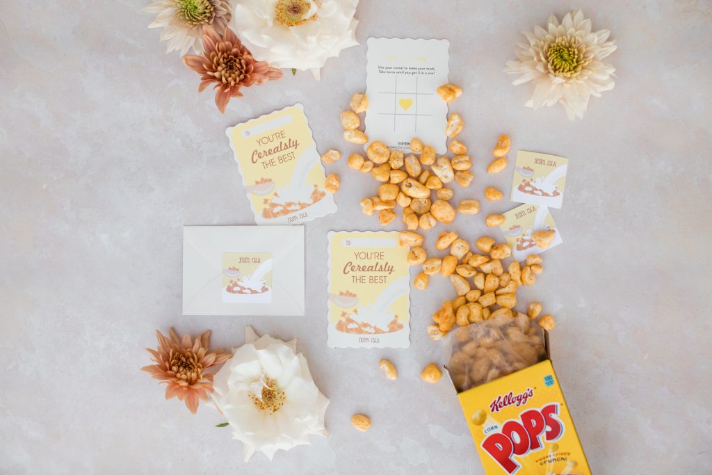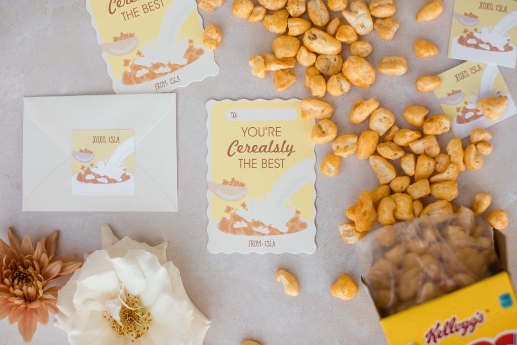My little first grader Isla picked the cereal valentine as her favorite from Minted, “You’re cerealsly the best”! She is a real cereal lover and thought giving all her friends a little box of something she loves would be very appropriate for this love holiday. She of course wants everything to be pink, but picked the yellow version to be fun, bright and different from the normal valentine’s day color palette. She also chose to do fun customized stickers and the back of the card with tic tac toe so her friends can play with their cereal as well!