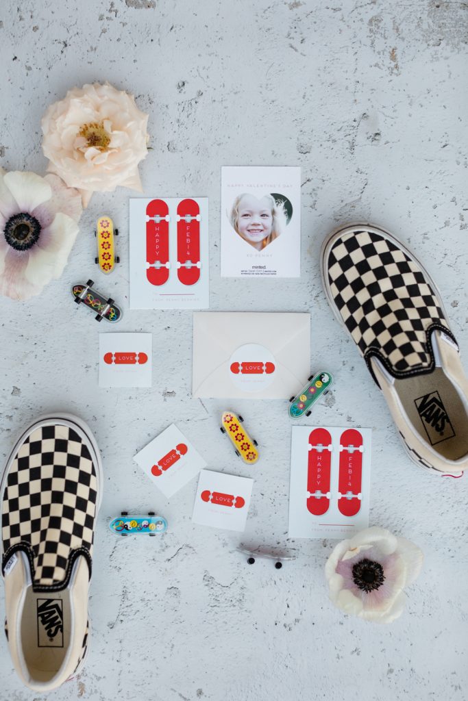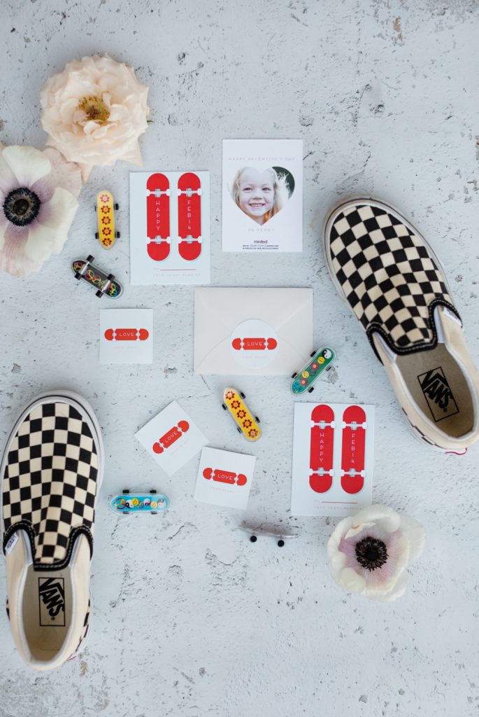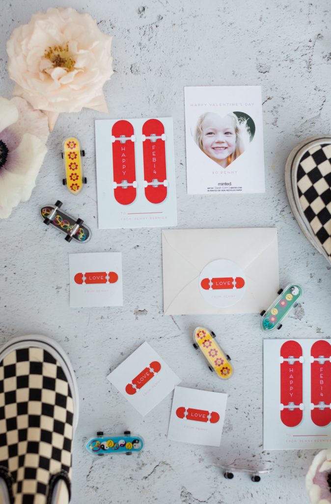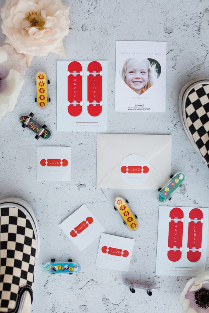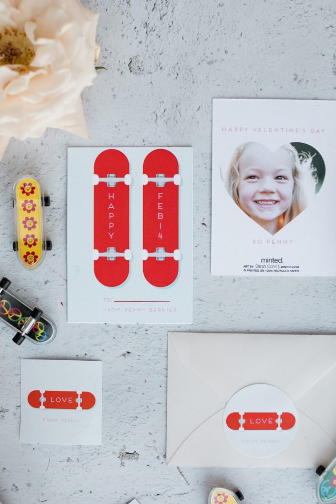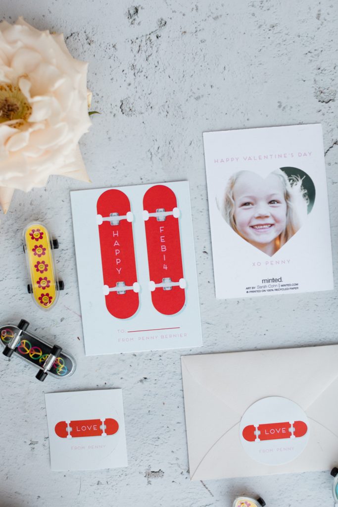 Penny is in kindergarten and loving being a social butterfly at school and is so excited to hand out her cards this year! For Christmas Santa brought her a skate board and ever since, the first thing she wakes up and asks for is to go skating. So clearly the skate board card and matching stickers were the perfect pick for our skater girl who is constantly on a mission to out do the boys in our neighborhood!