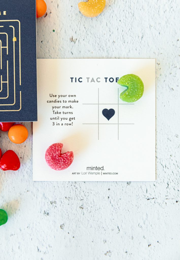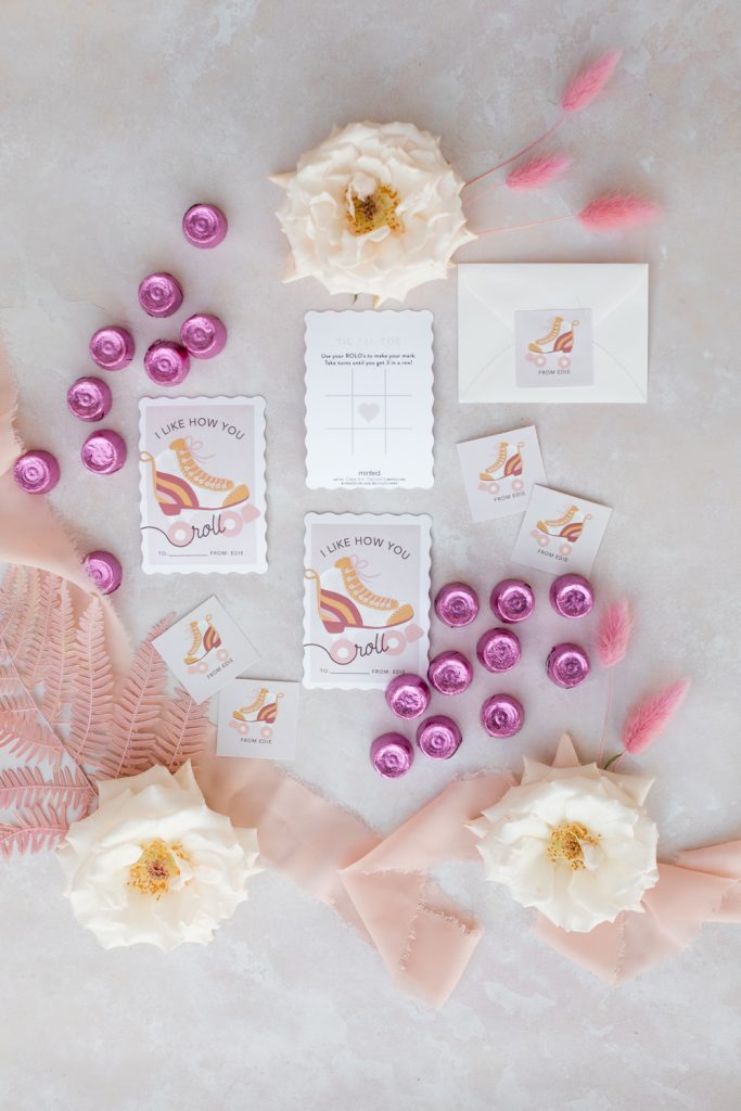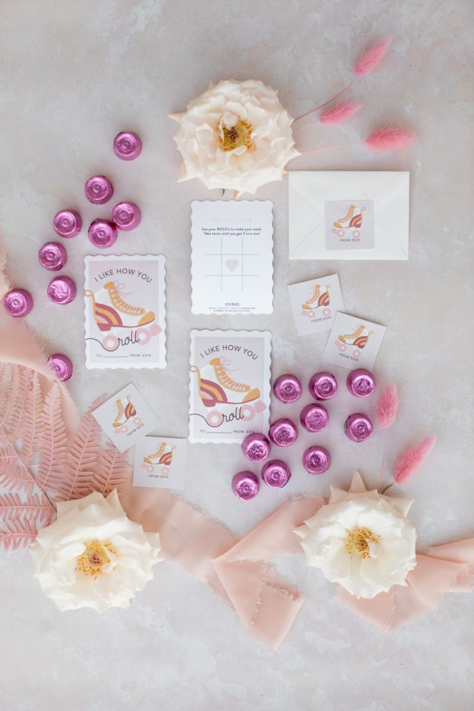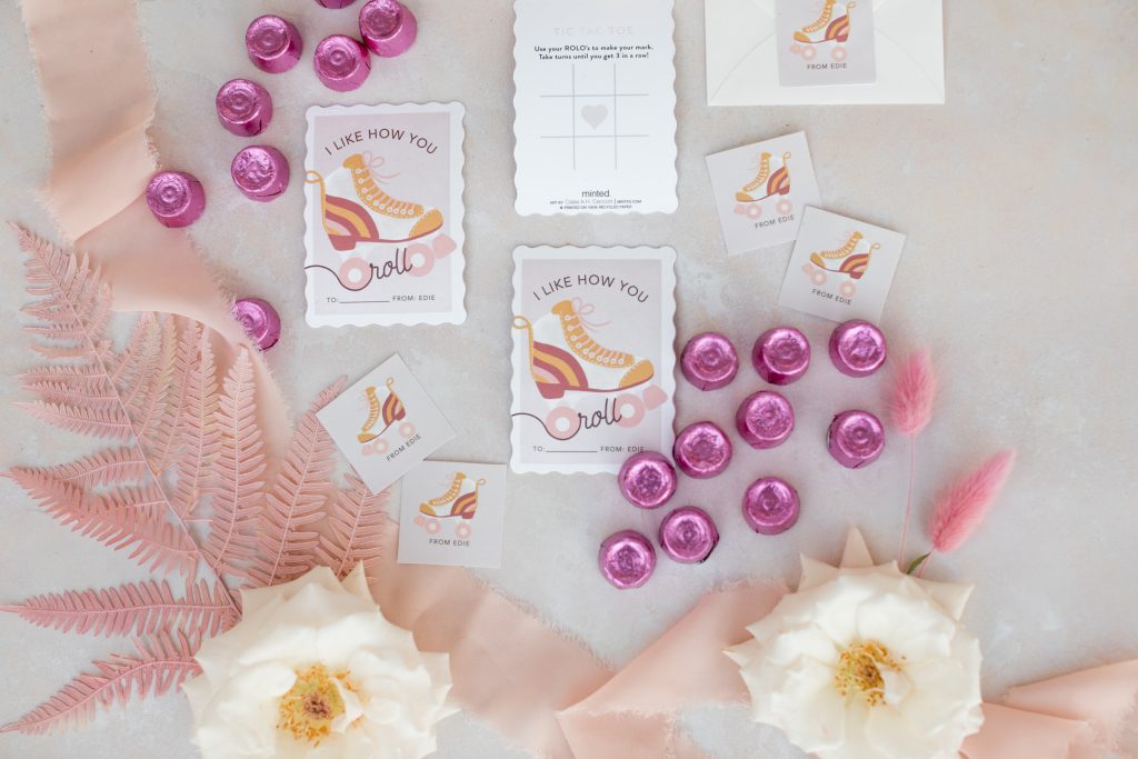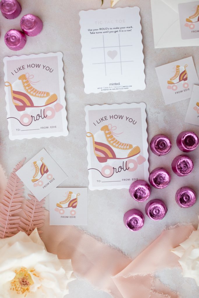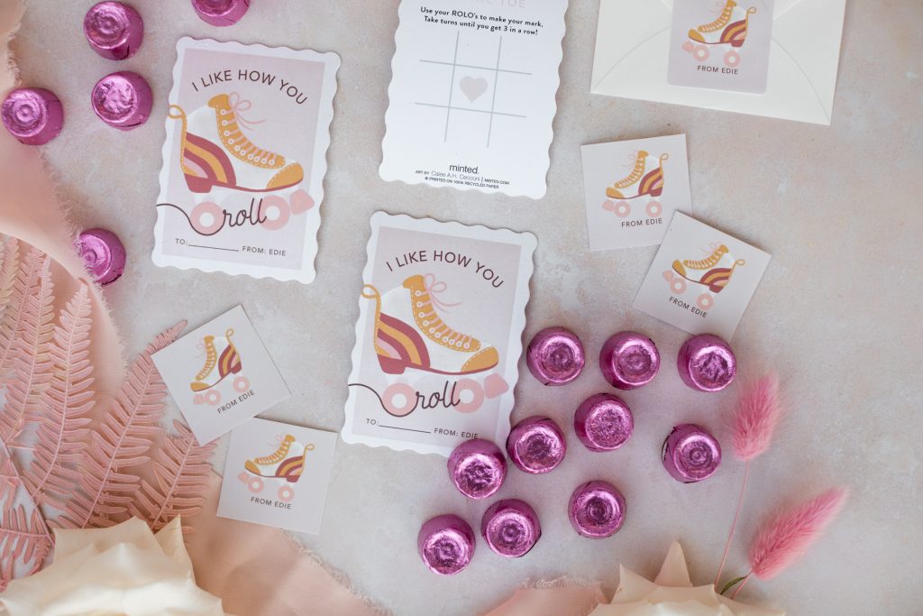 It’s getting a little harder to choose valentines for Edie. Who is this emerging pre teen in the house?? She loves to be involved and has an opinion on what she likes, which I love seeing her independent little spirit come through in her choices. This year she liked the rollerskate, “I like how you roll”! from Minted. She also had fun choosing the color way, and loved the retro version of it, but ultimately decided to go a bit more neutral and girly for valentines day. Of course she had to add the adorable customized stickers! She chose one of her favorite chocolate candies to go with the cute pun, “Rolo’s” and thought it would be cute to add the tic tac toe on the back so her friends can play along and use the candies as markers of the game.