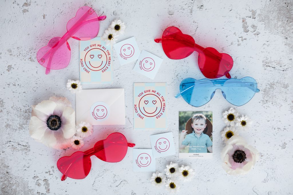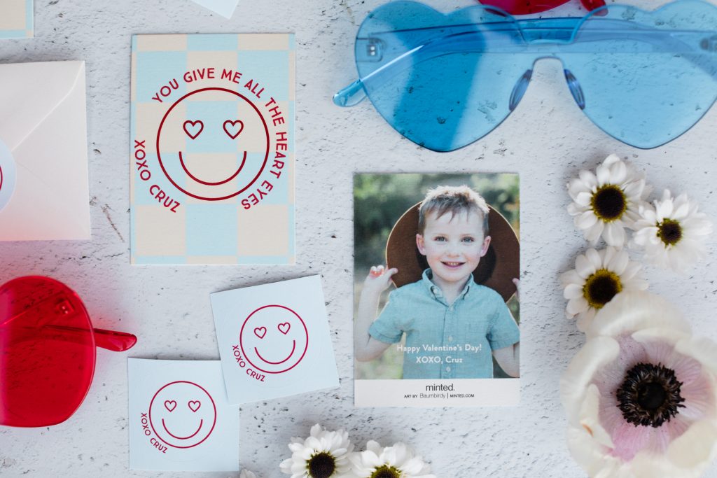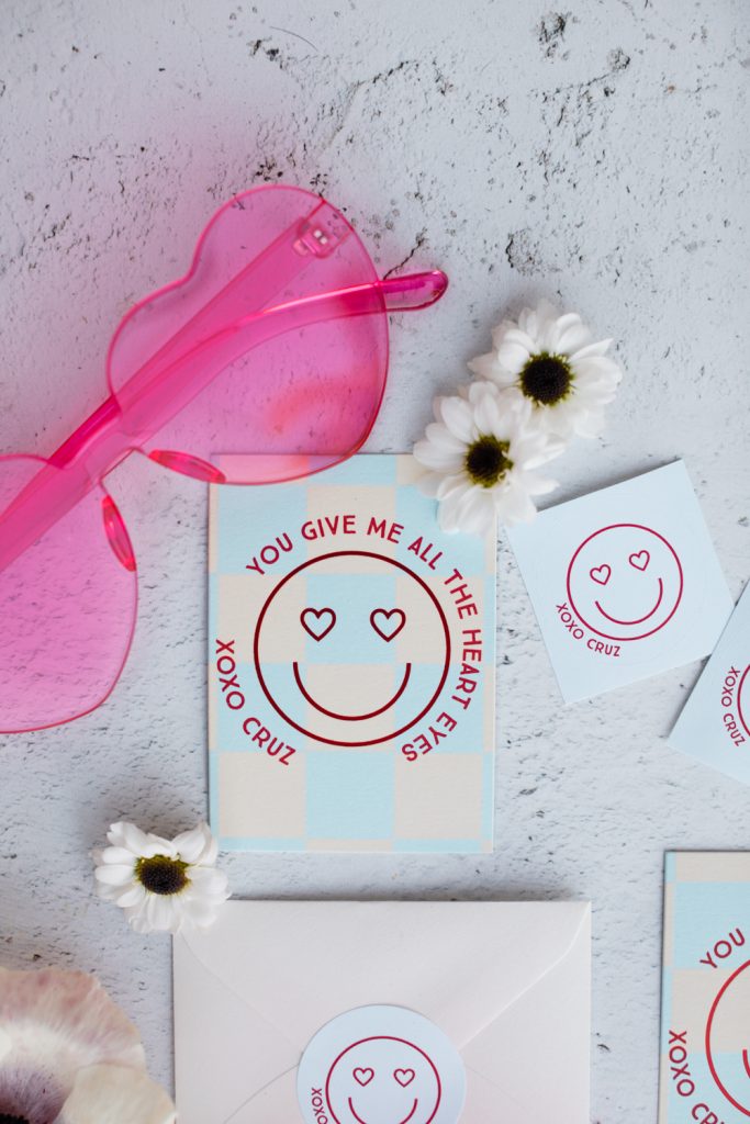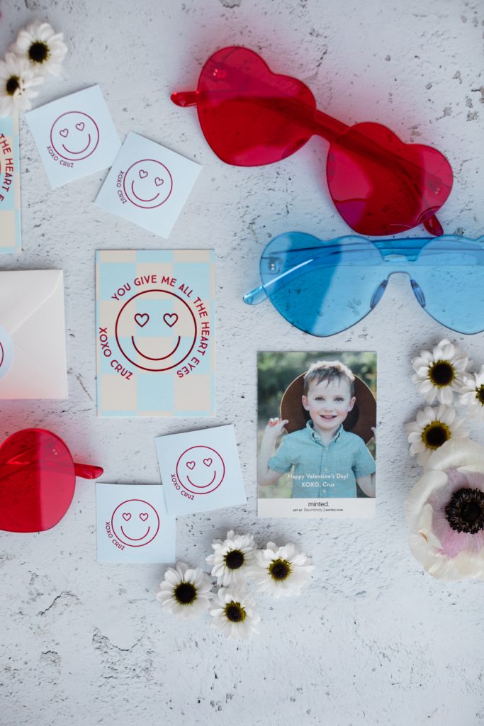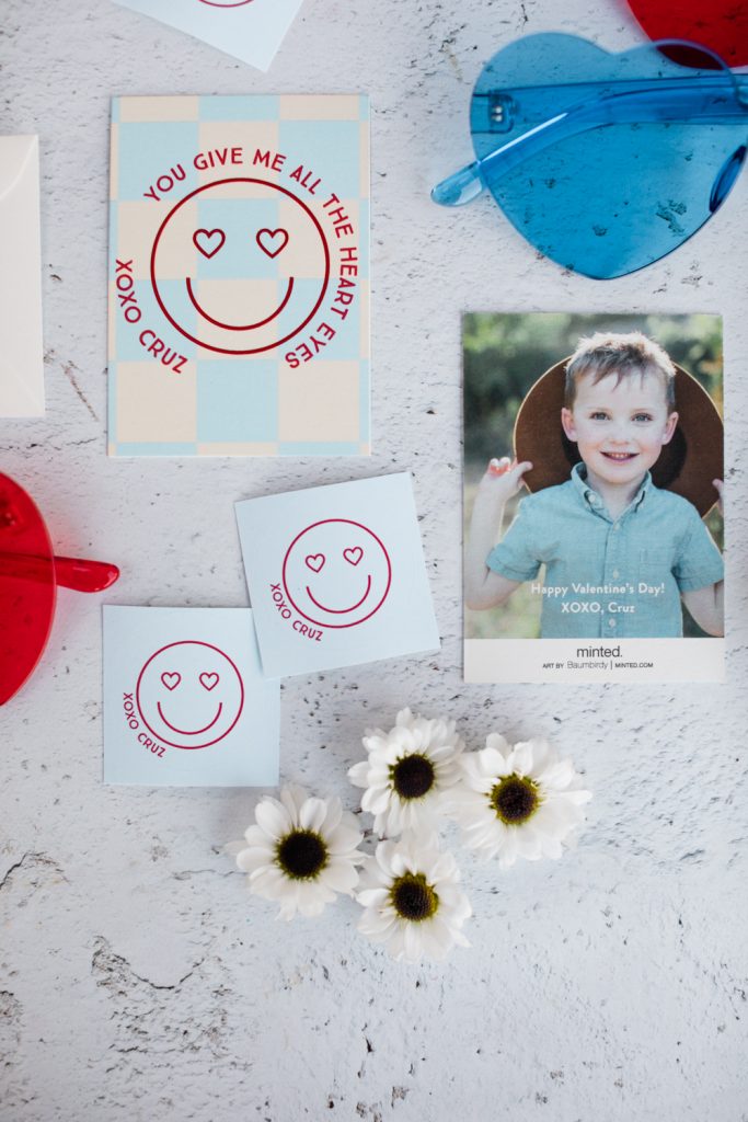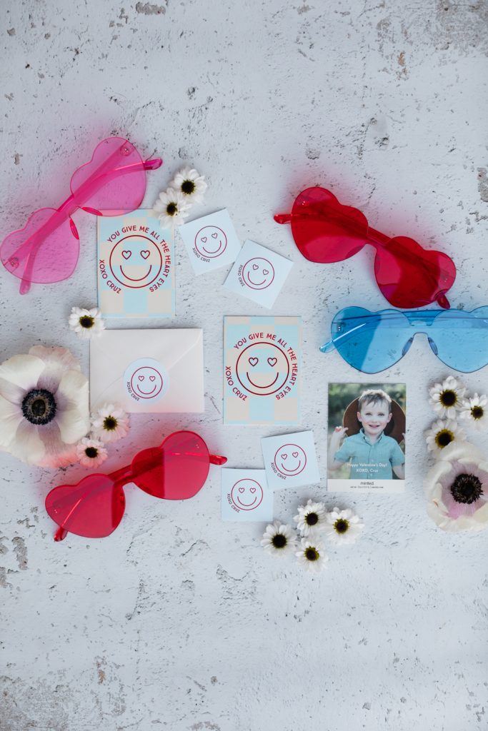 My little Cruz is a big TK-er this year!!! He’s 5 and ready to rumble!! When they are this little I try to fine non candy options and these cute heart sunnies were just the ticket. He recently shared the letter P at school and gave his classmates Pop-Its – another fun non candy hit at this age. But heart eyes are always fun and cute for Valentine’s Day, don’t you think? This card caught my eye right away with its adorable checkered print in a variety of colors. I went with the light blue and red combo – perfect for my blue eyed boy! And the happy face was just too cute, like my cutie Cruzy! I customized the back with an adorable photo of him and added the custom stickers, now he’s ready for the big day of LOVE!