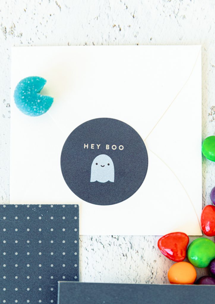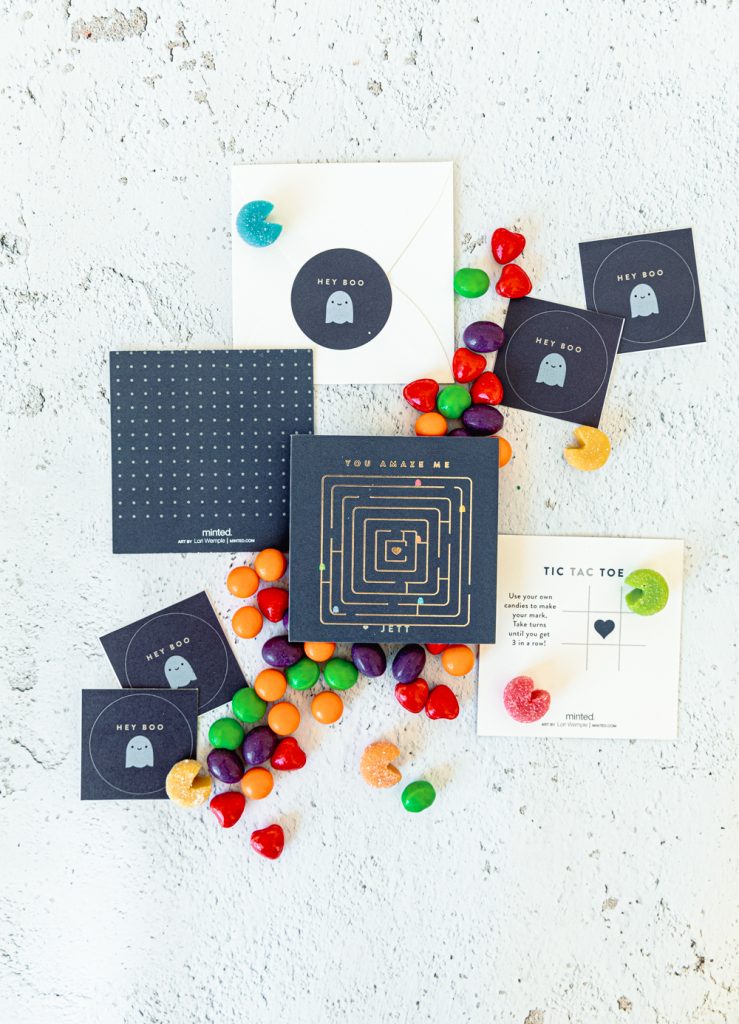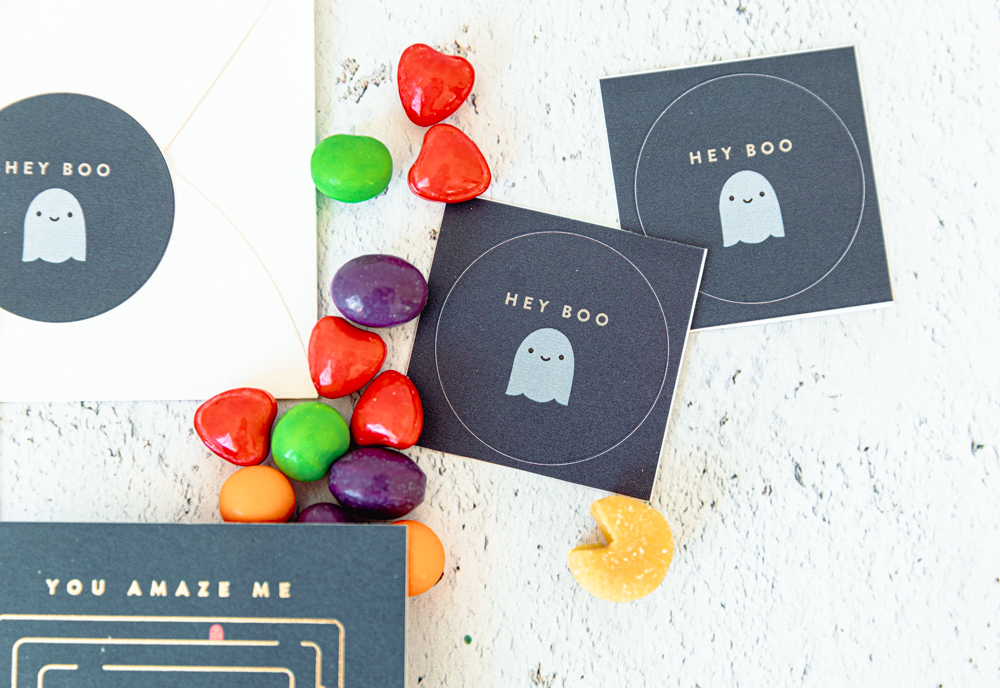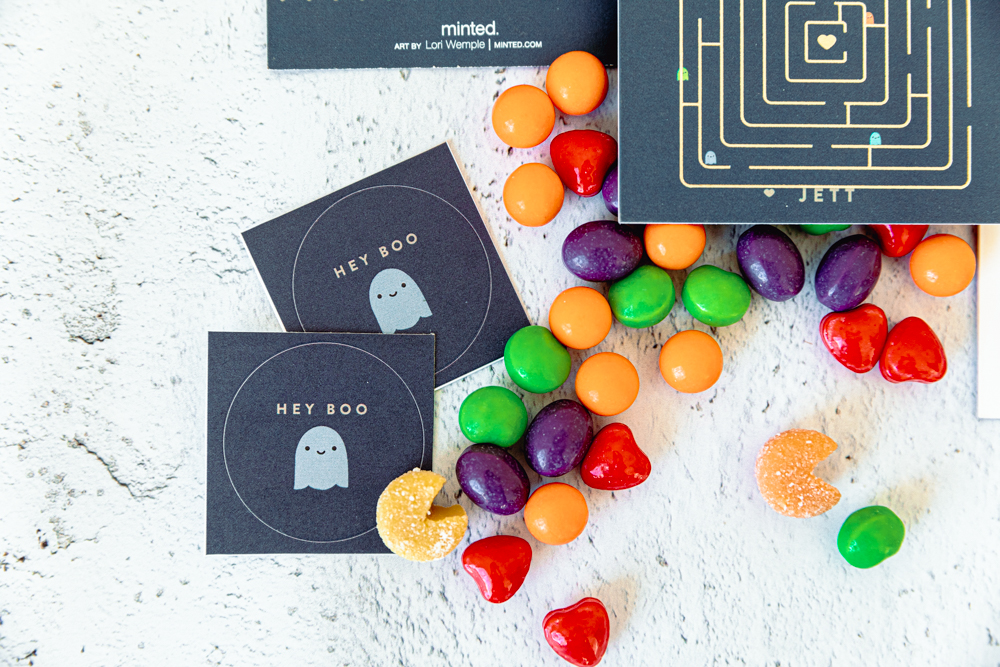 Jett is all about video games! He has everything from the wireless keyboard to the cool video game desk! So, of course, his passion for video games is playing out in his choice for Valentine’s Day cards for his classmates. He loved the retro maze foil card; I mean, wouldn’t any kid with a nod to the retro Pac man game. This card has the matching boo sticker, which is so cute. We did runts candy for a little treat to go with his cards. Remember in the game when Pac-Man eats a certain amount of dots, and you level up by getting a bonus fruit!
