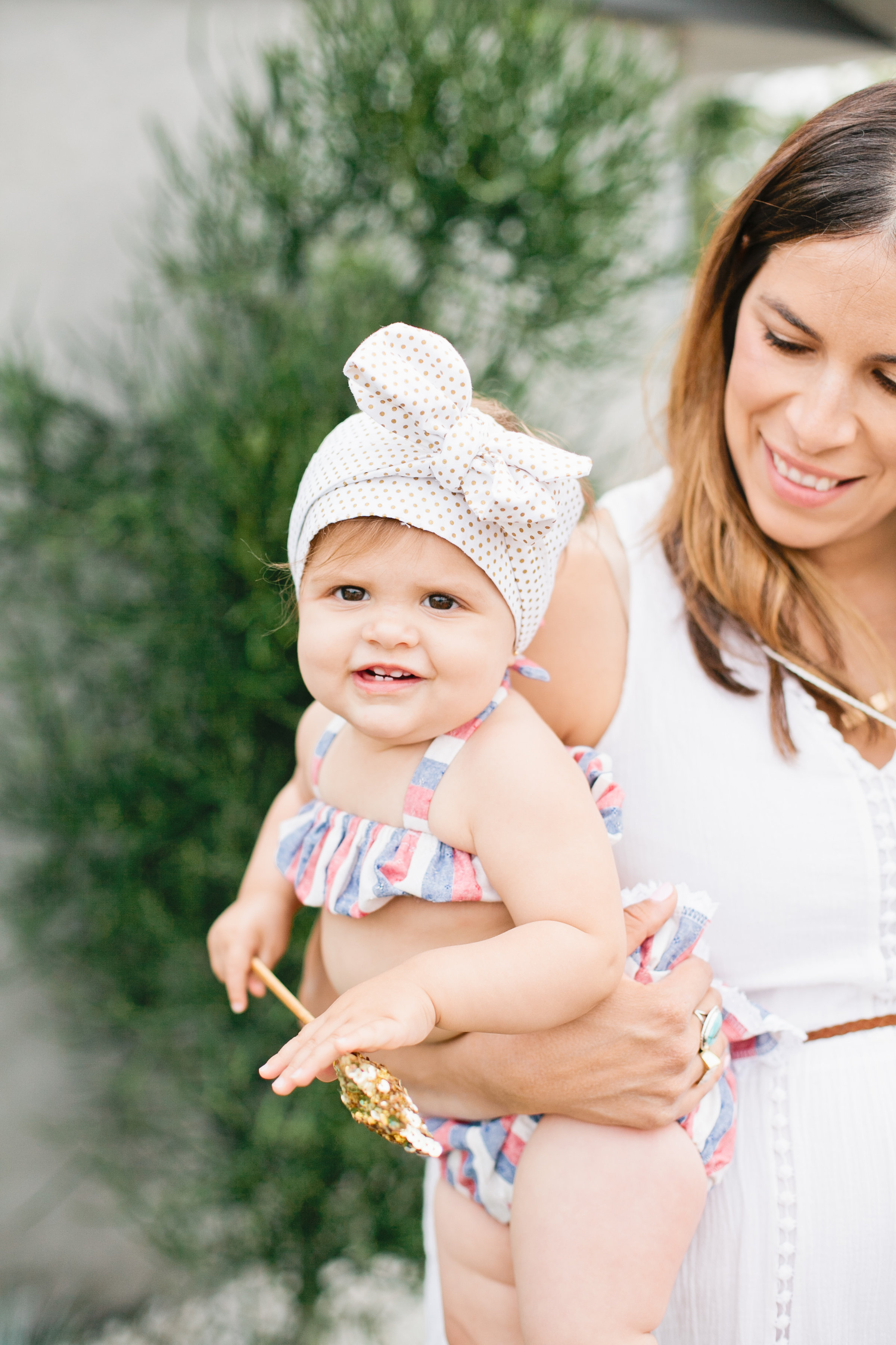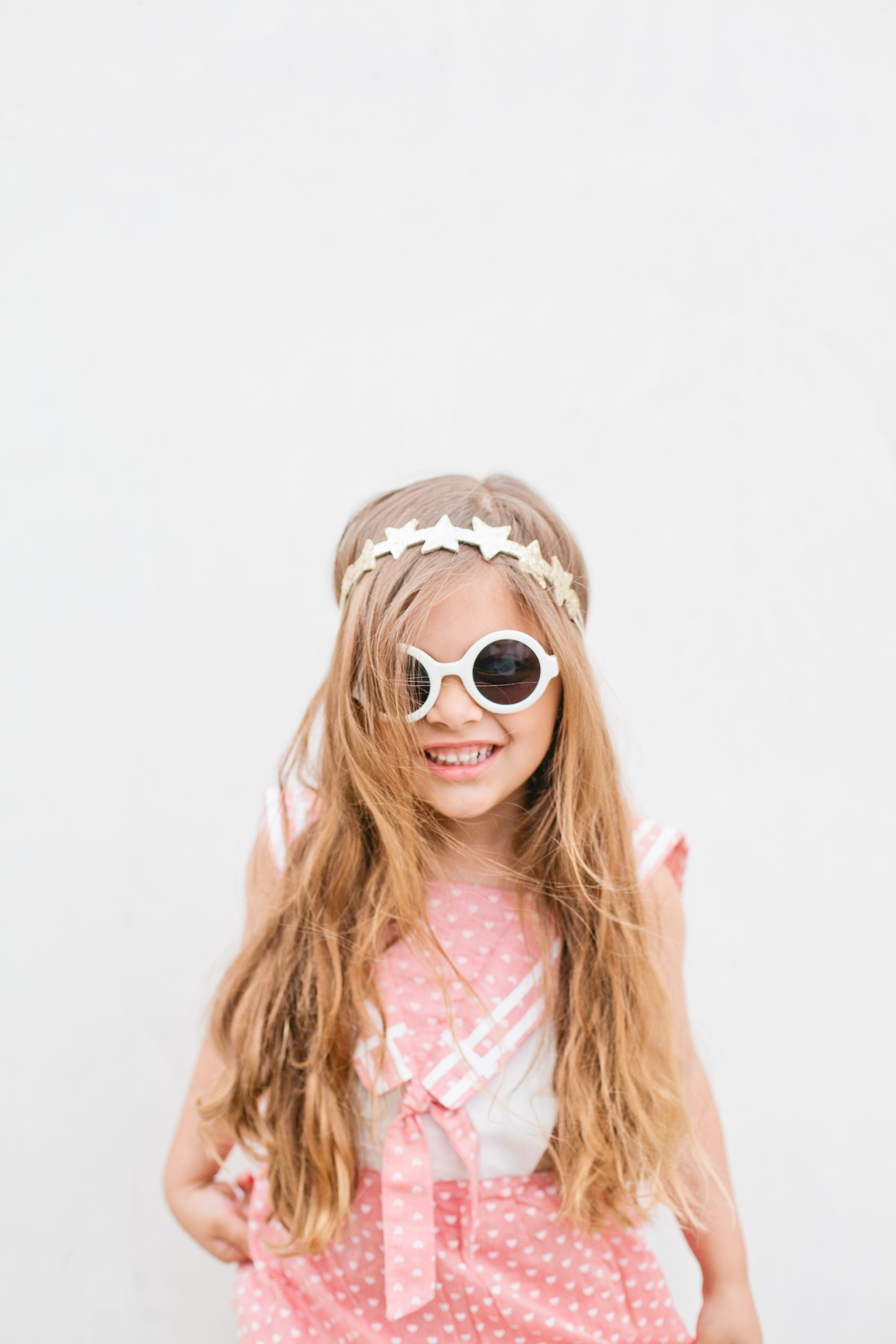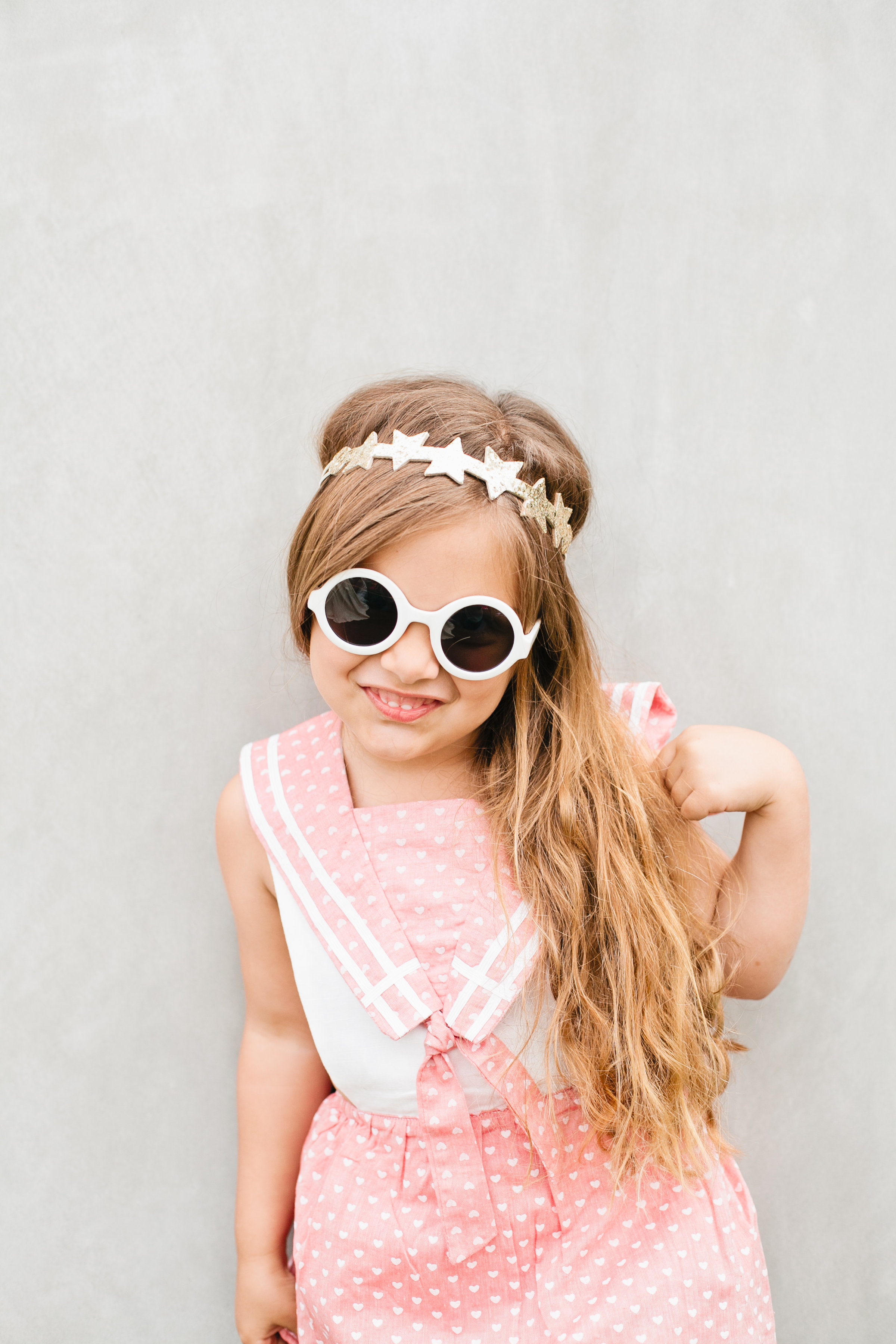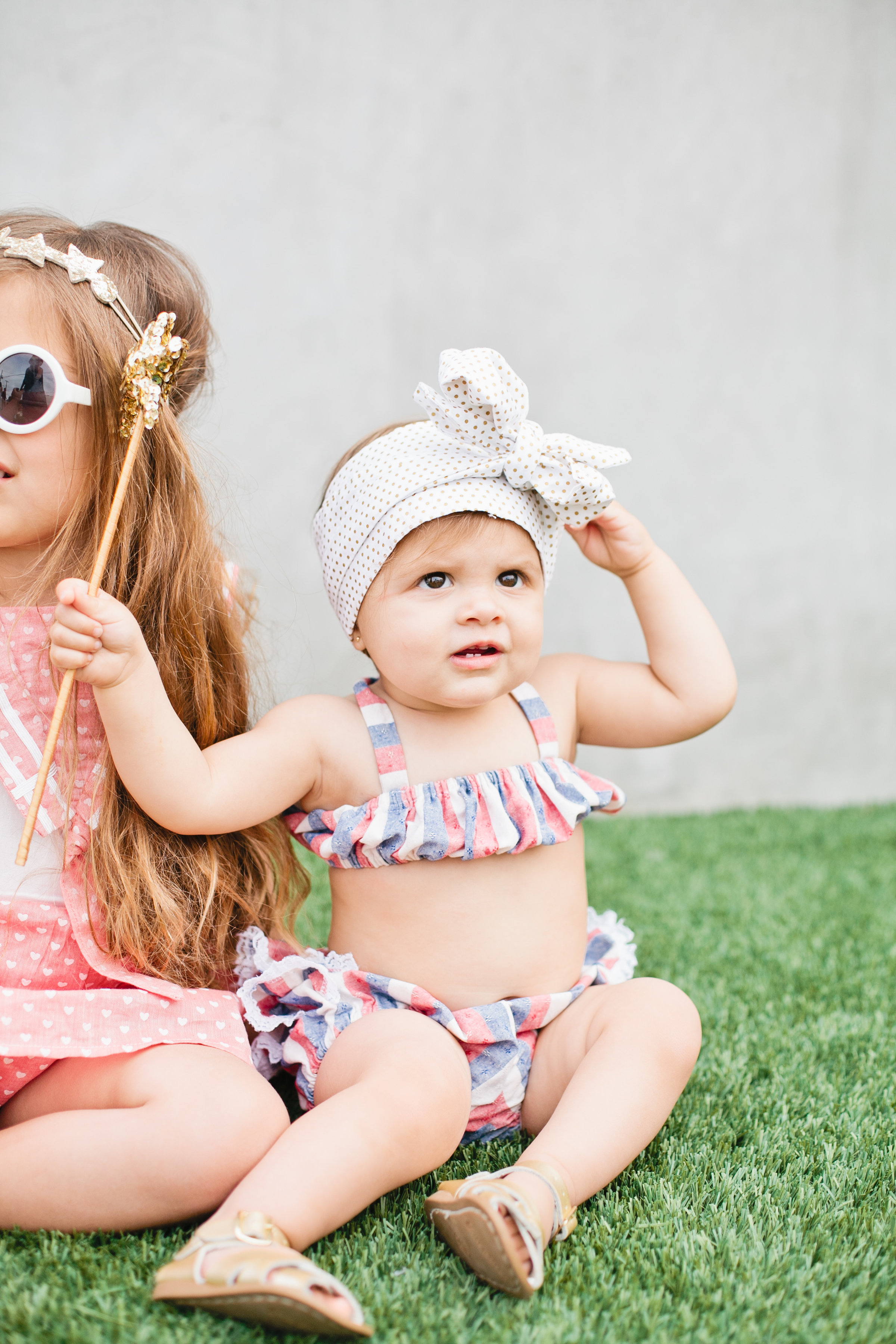 Isla is wearing the Ruffle Bikini Playsuit in Americana Stripe that you can find here… The Little Style Collective styled Isla in the cutest little head wrap that just makes the outfit along with gold salt water sandals and a golden star wand to play with!