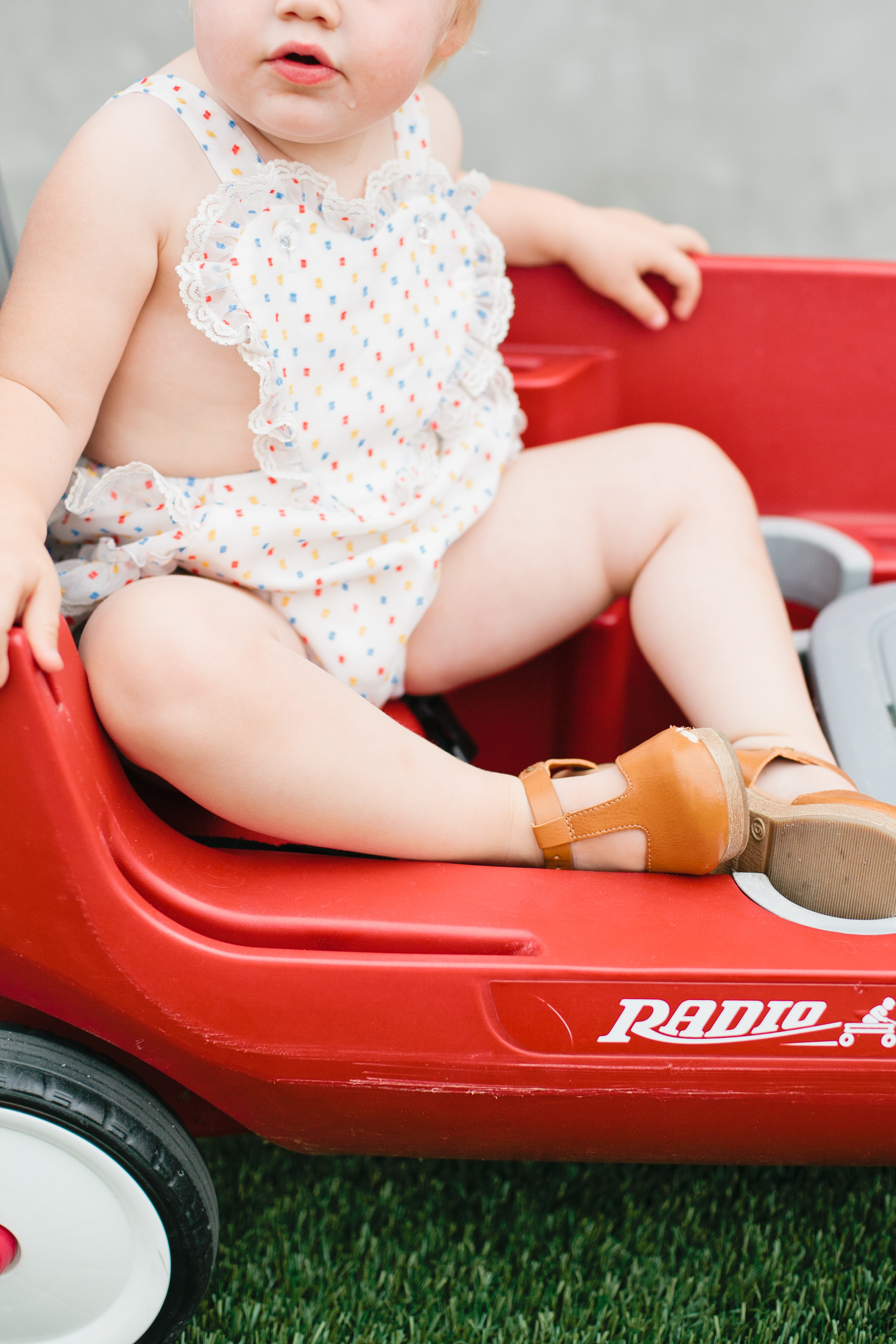 Next up is little Lena, who is an adorable little ball full of energy! We loved catching her in these darling shots, isn’t she so stinking cute?! Lena is wearing the Heart Romper in the Confetti Swiss Dots, Carissa & Ashley styled her in the cutest baby clogs (yes I just said baby clogs!!) and a straw hat with matching bag…