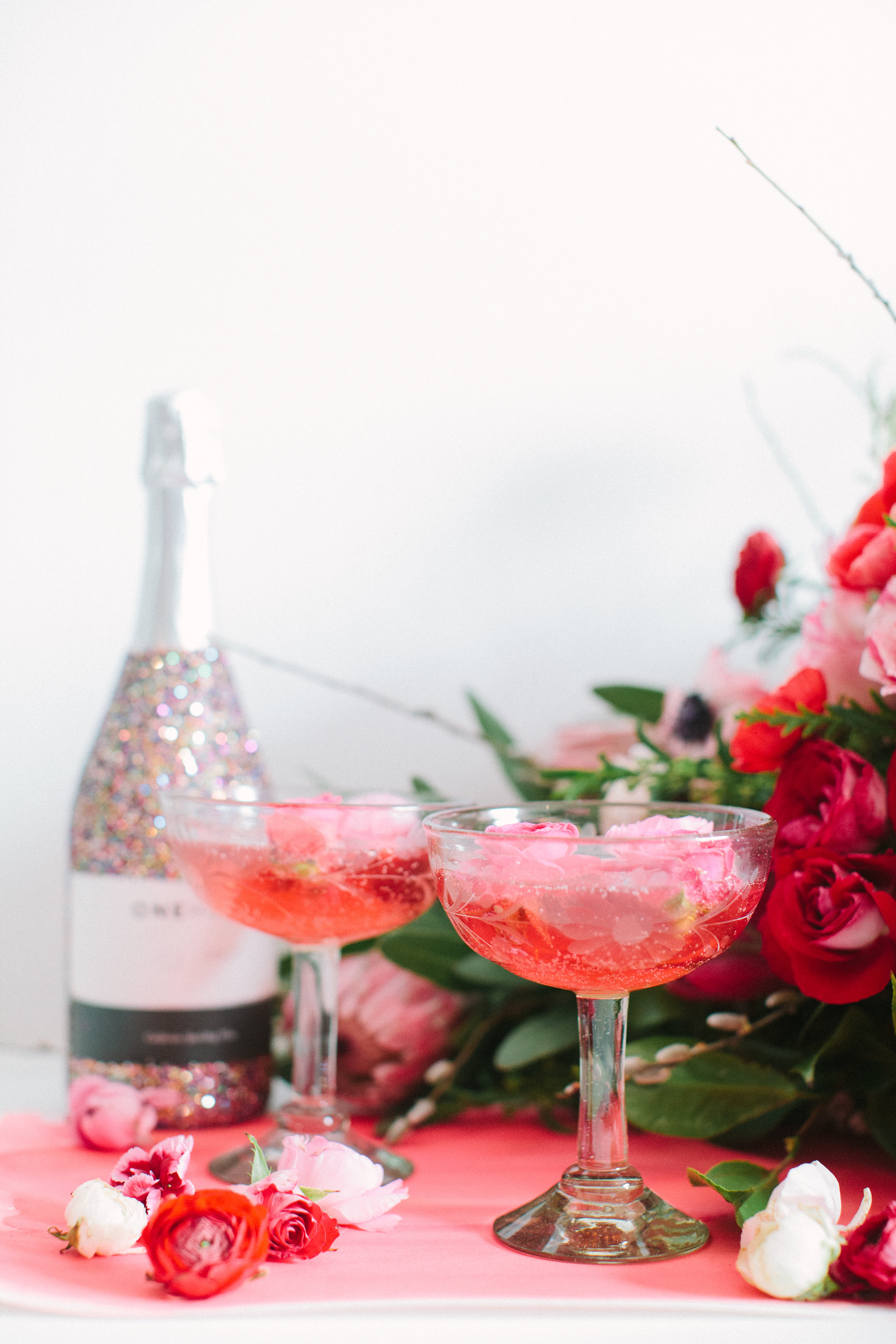 2. Once cooled, pour about 2 tablespoons of the syrup in each glass. Top with champagne and garnish with flowers.