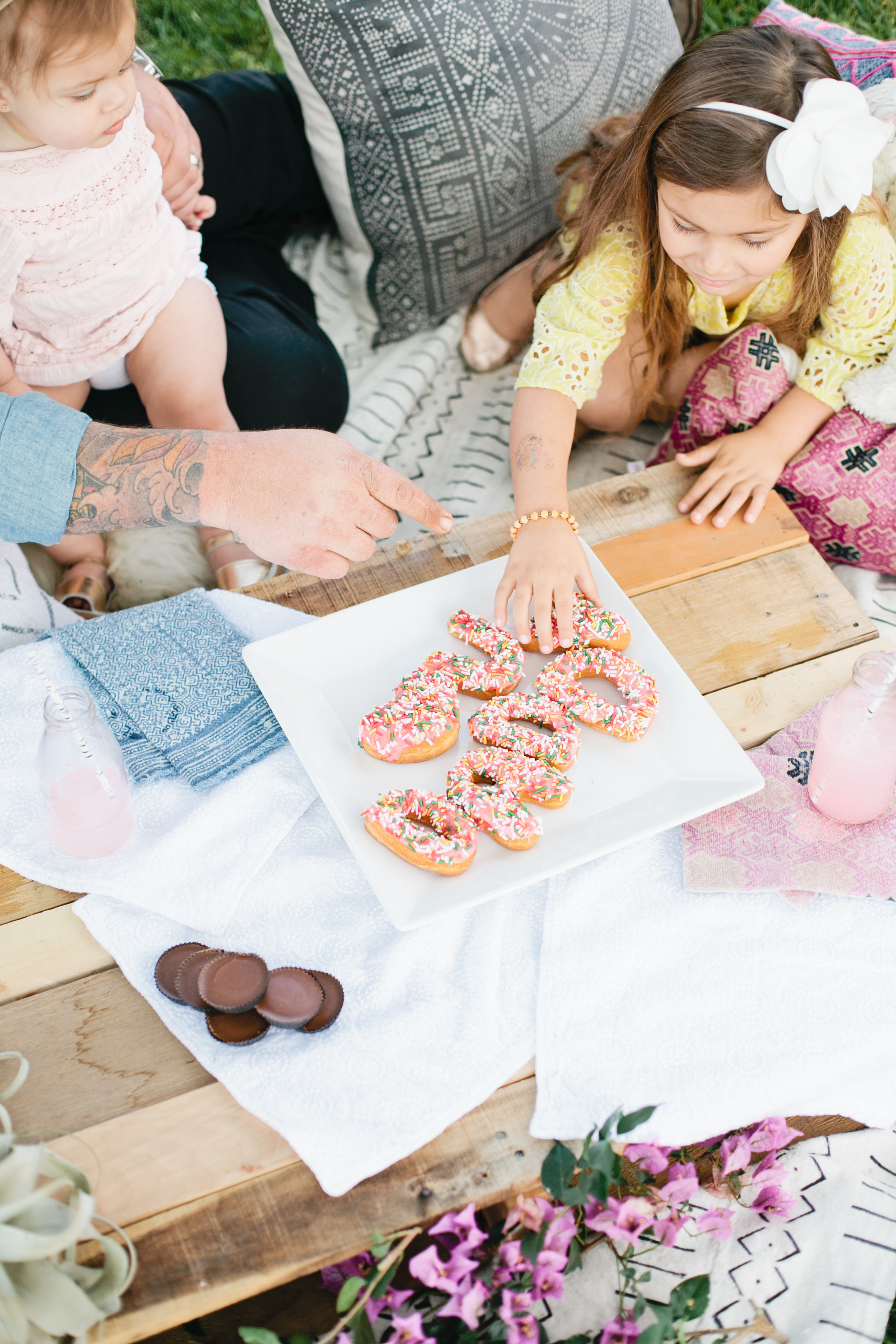 I thought of their favorite thing to eat together and hands down it’s sweets, but more specifically pink donuts with rainbow sprinkles. And…of course Reese’s peanut butter cups!