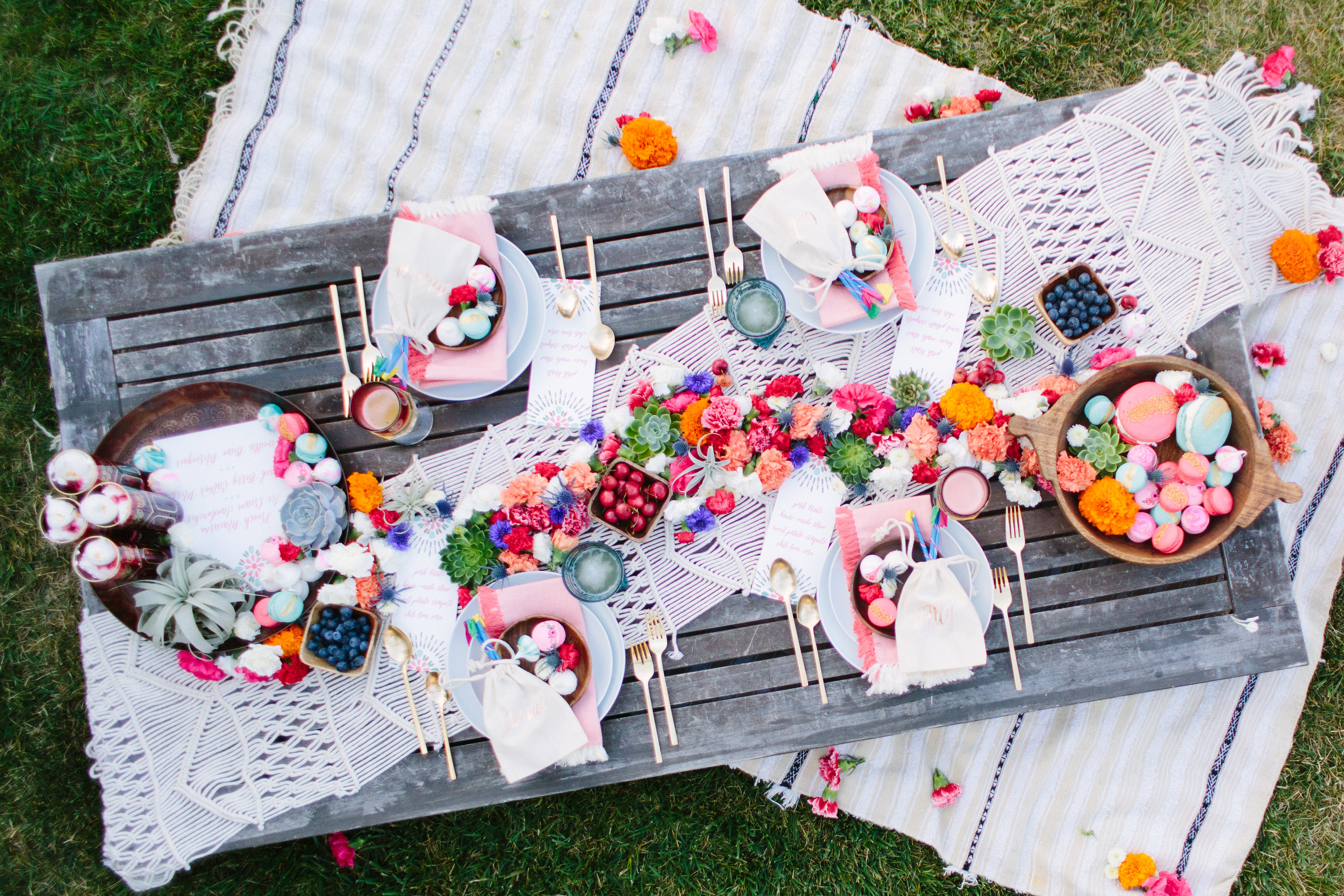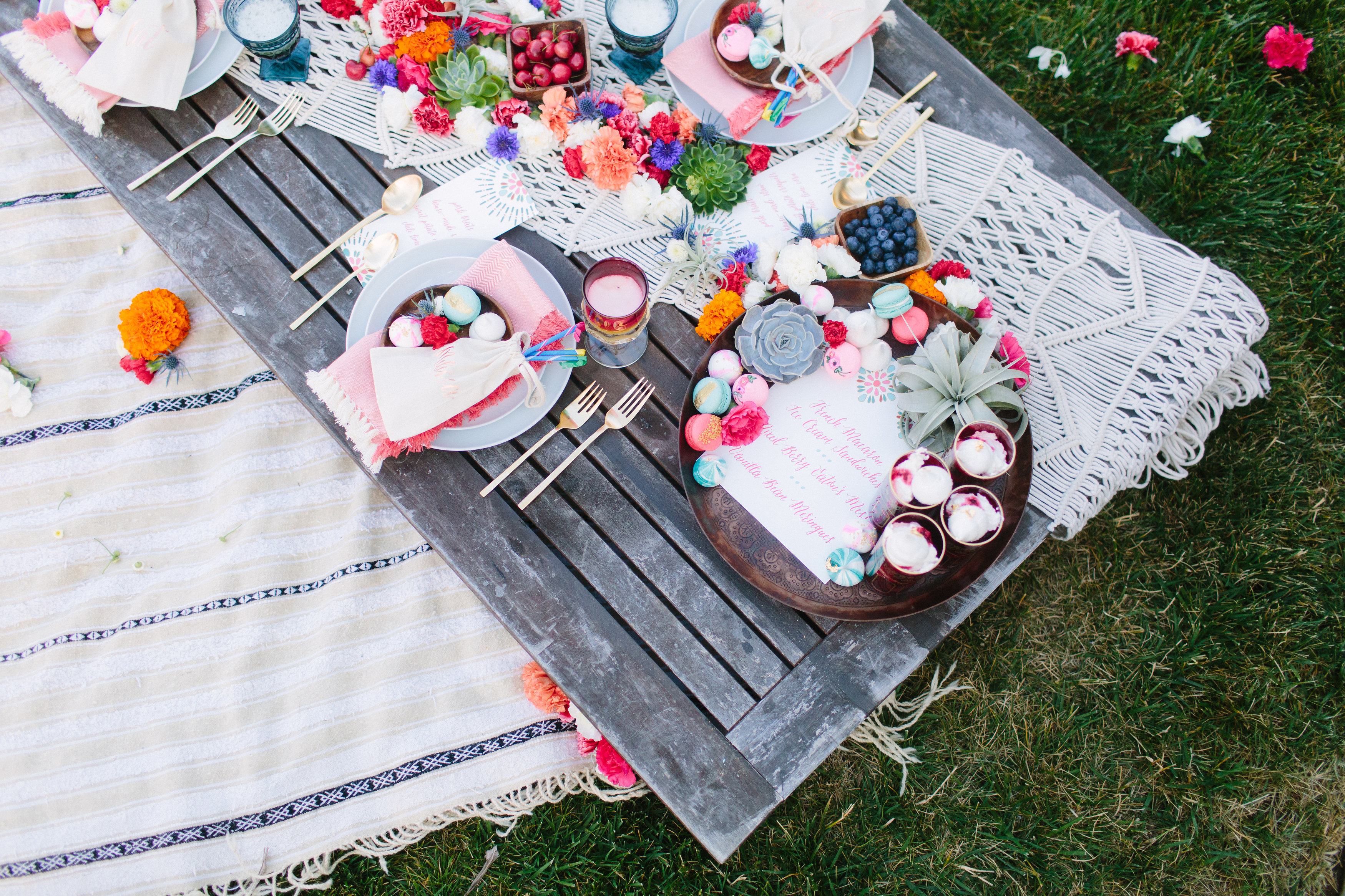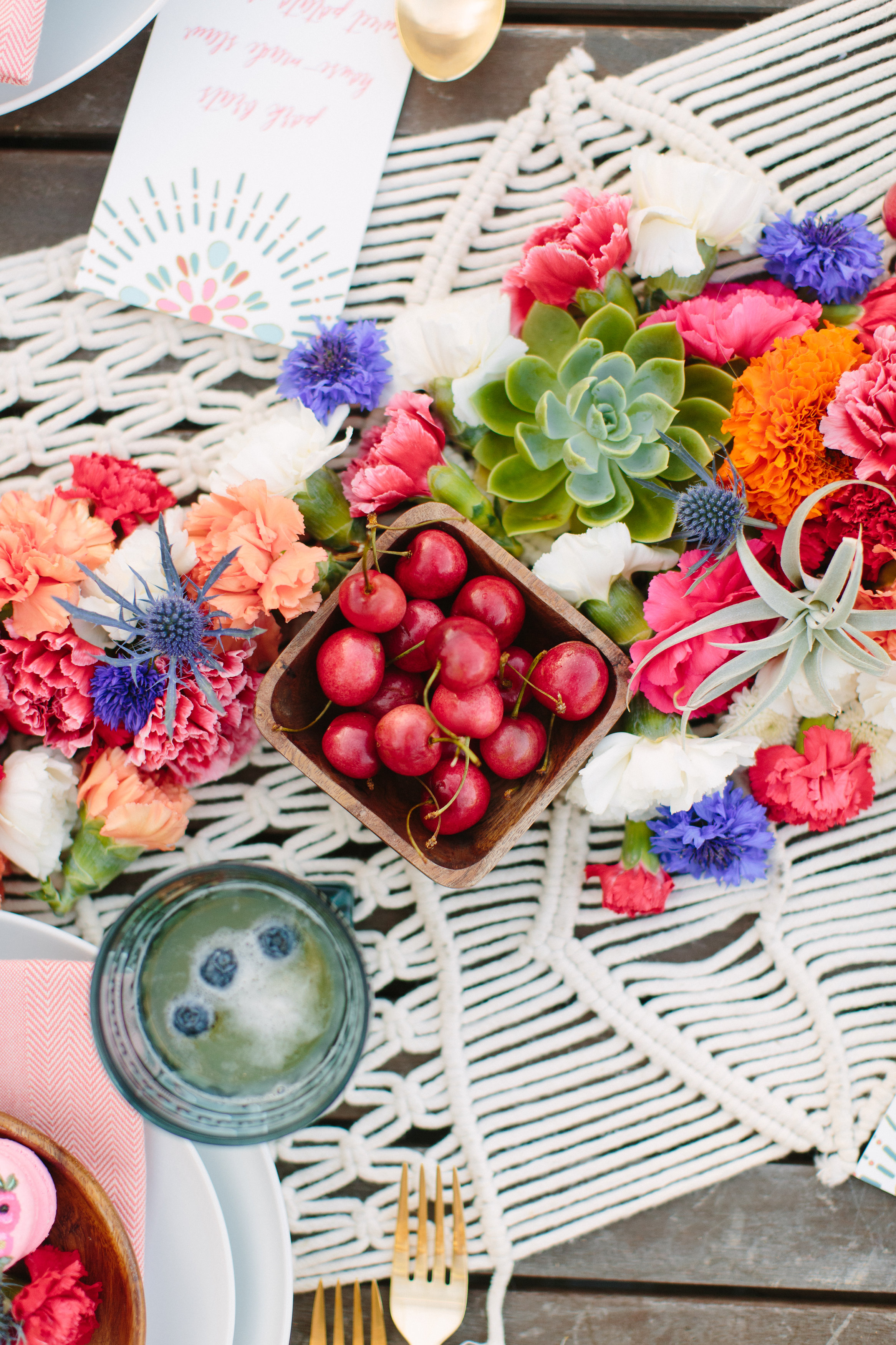 Bright wildflowers, carnations, succulents, and airplants made up the flowered garland that was laid across the tabletop. Mixing in colors of bright pinks + hints of coral, and marigold flowers give the table a fun moroccan twist on the traditional 4th.