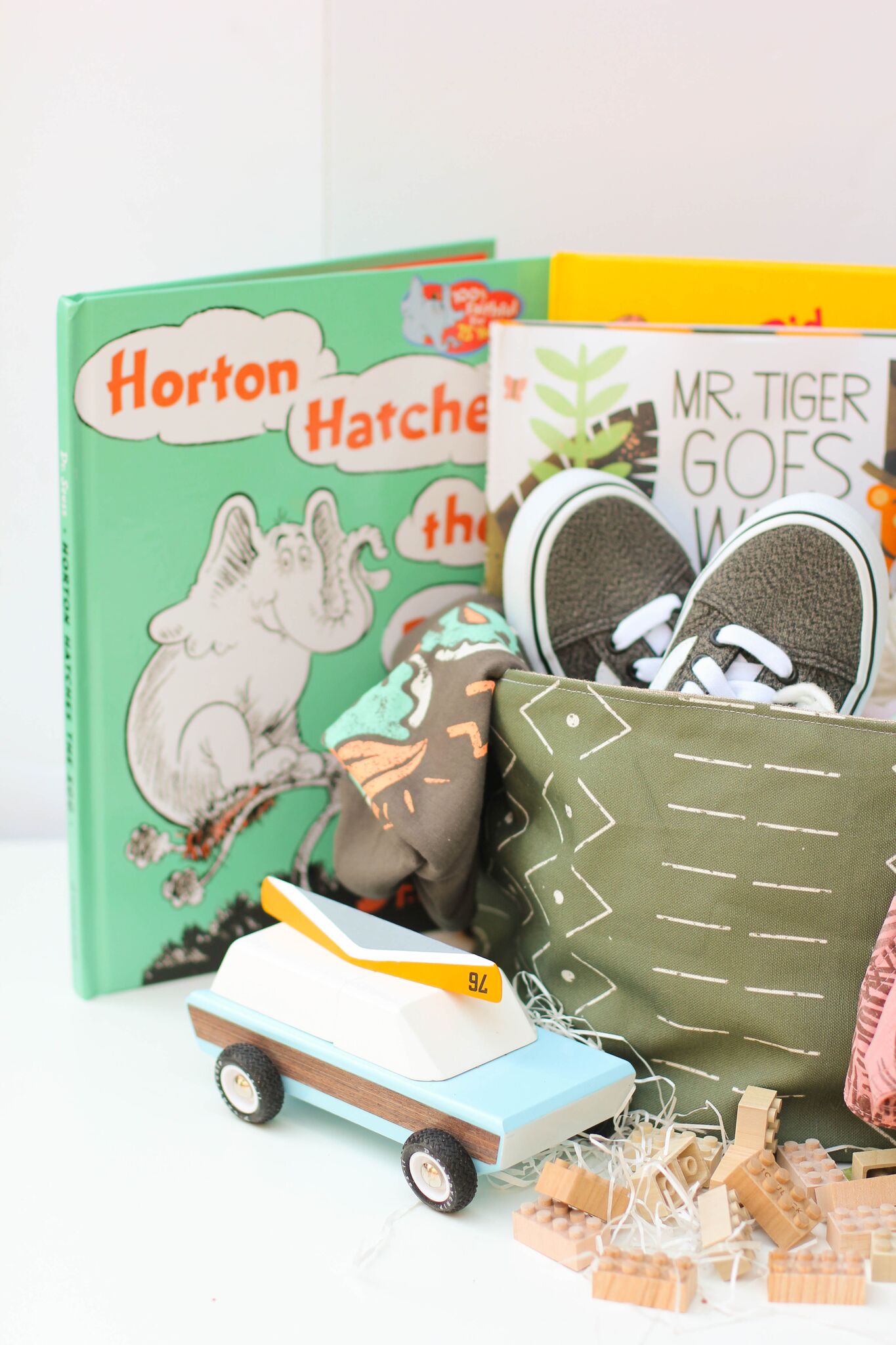 Last but not least, some good reading material.  I don’t know about you, but my boys are wild and the one time of day they actually sit and cuddle with me is when I read to them… So, books are a must!!  Abby picked out these three for her little man…  Horton Hatches an Egg, Mr. Tiger Goes Wildand Did I Ever Tell You How Lucky You Are?