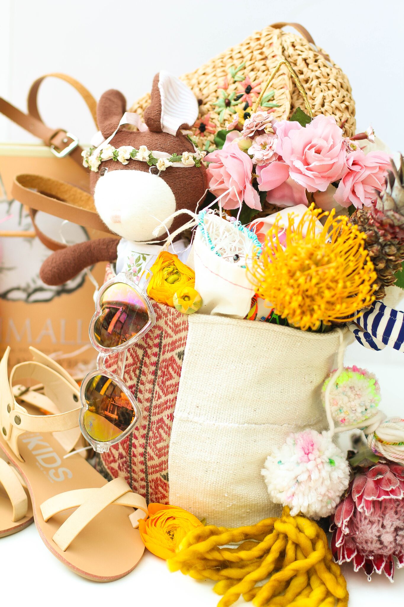 Another Easter must have are floral bunny ears from JL Designs.  These are the ultimate Easter accessory!  Speaking of accessories, this little girl’s basket is set with a cute pair of sandals for Spring, heart shaped sunnies, a new raffia bag and cute bracelets (here and here) from our girl Julia at Gunn & Swain.