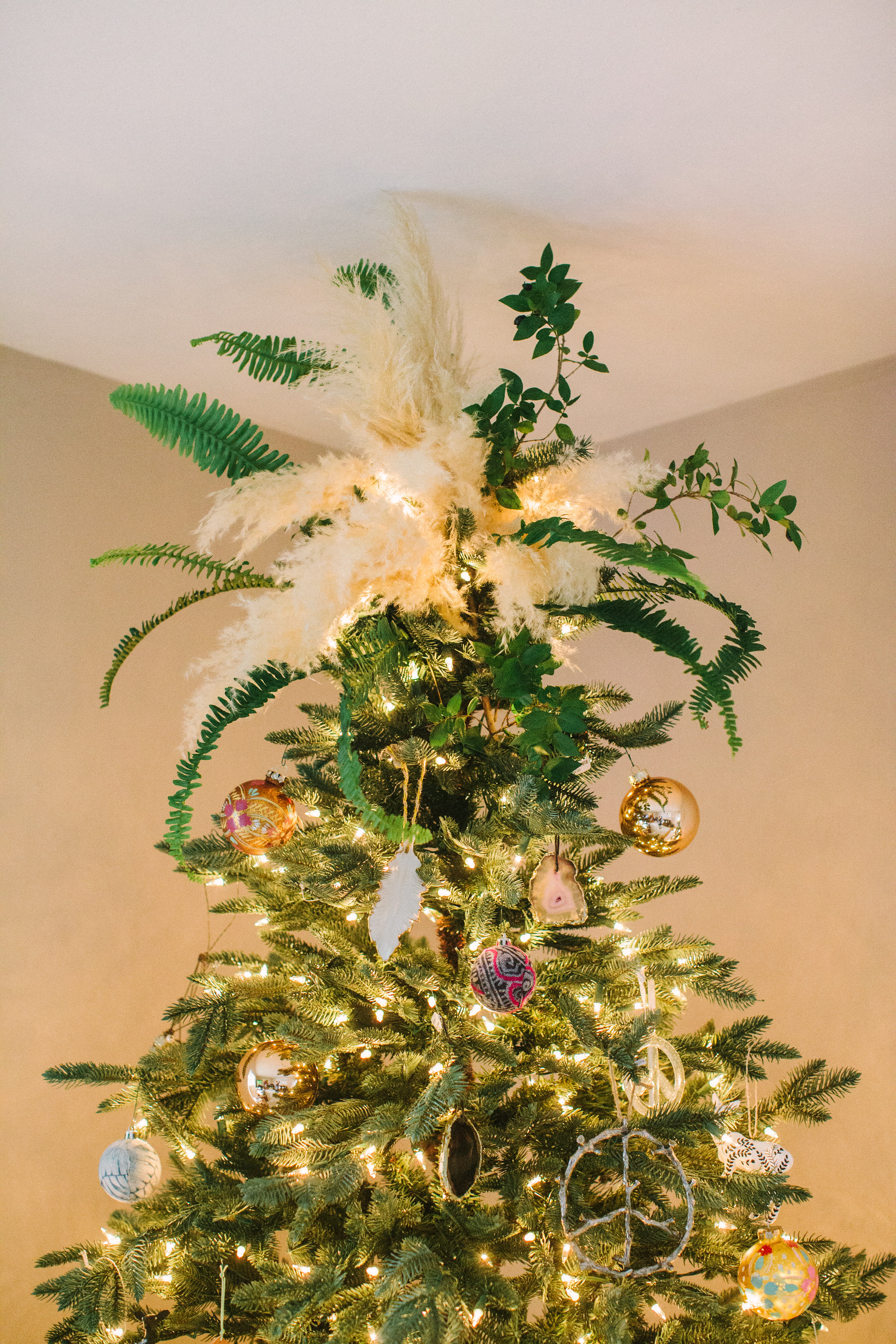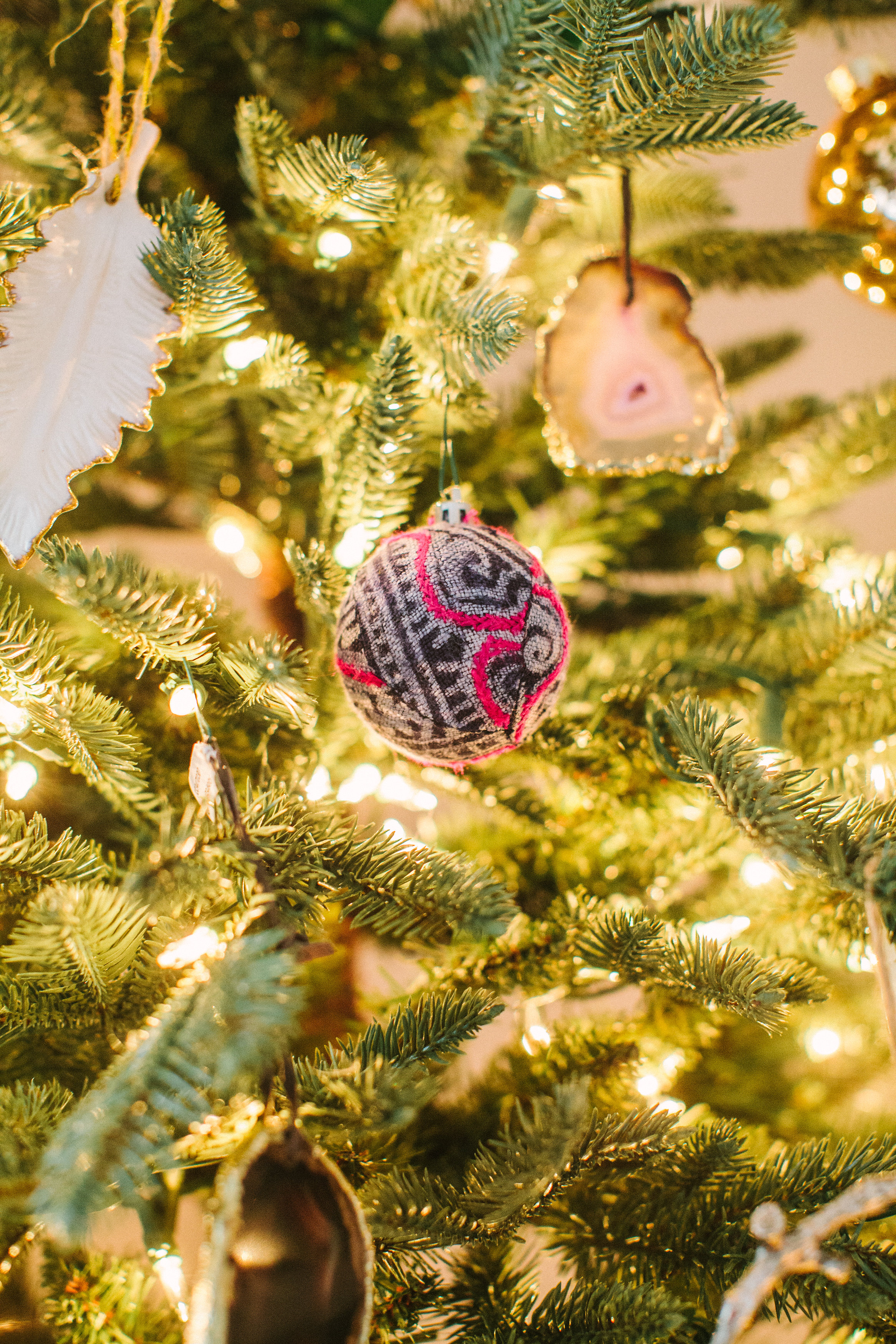 This is my favorite part of the tree. The ornament combination of pink + blue hmong, geodes, copper, feathers, and copper.