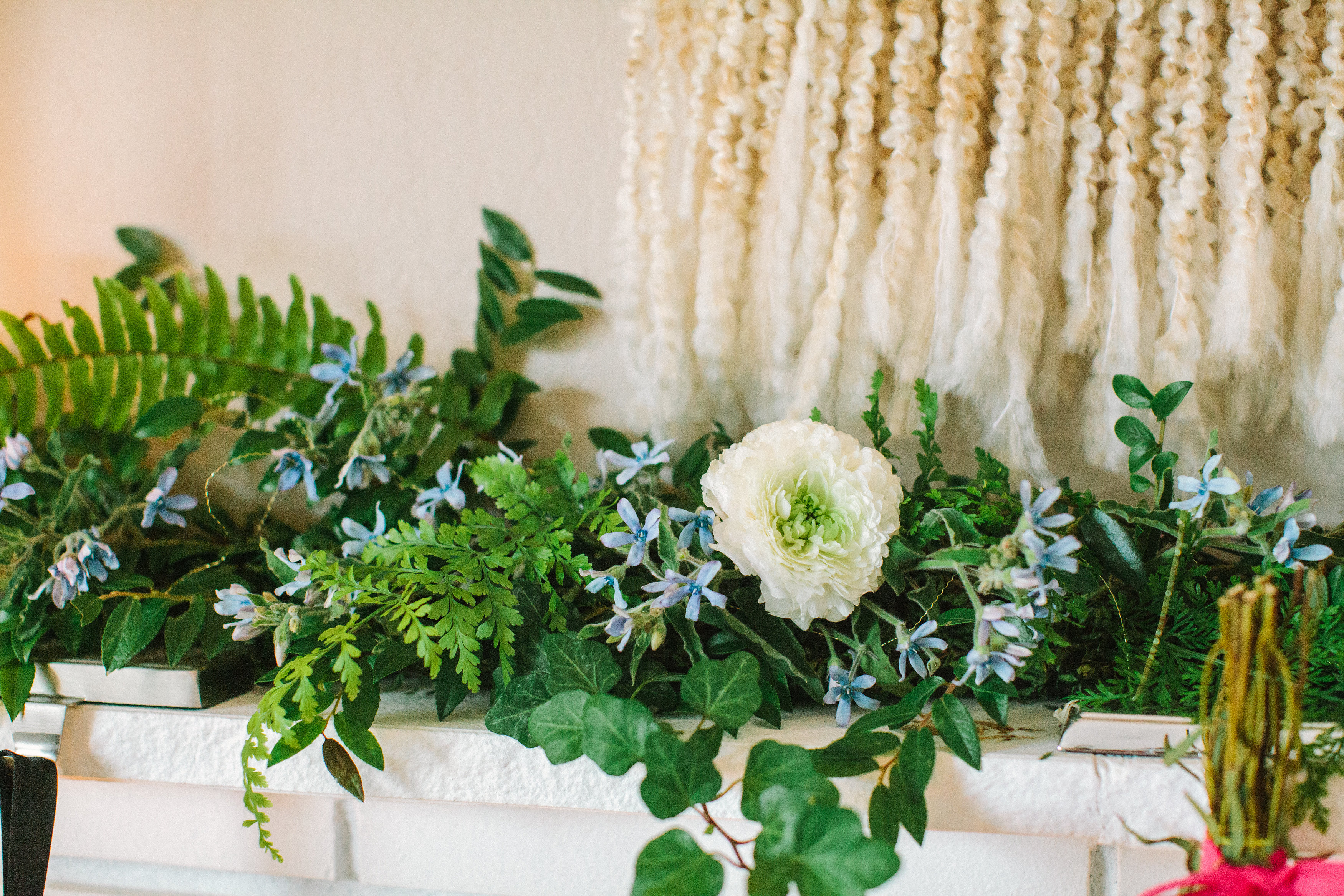 Ferns and Pampas grass were added to the top to create a feathery head piece look. In love with it. We joke that we want to take it off and wear it as an actual head piece.