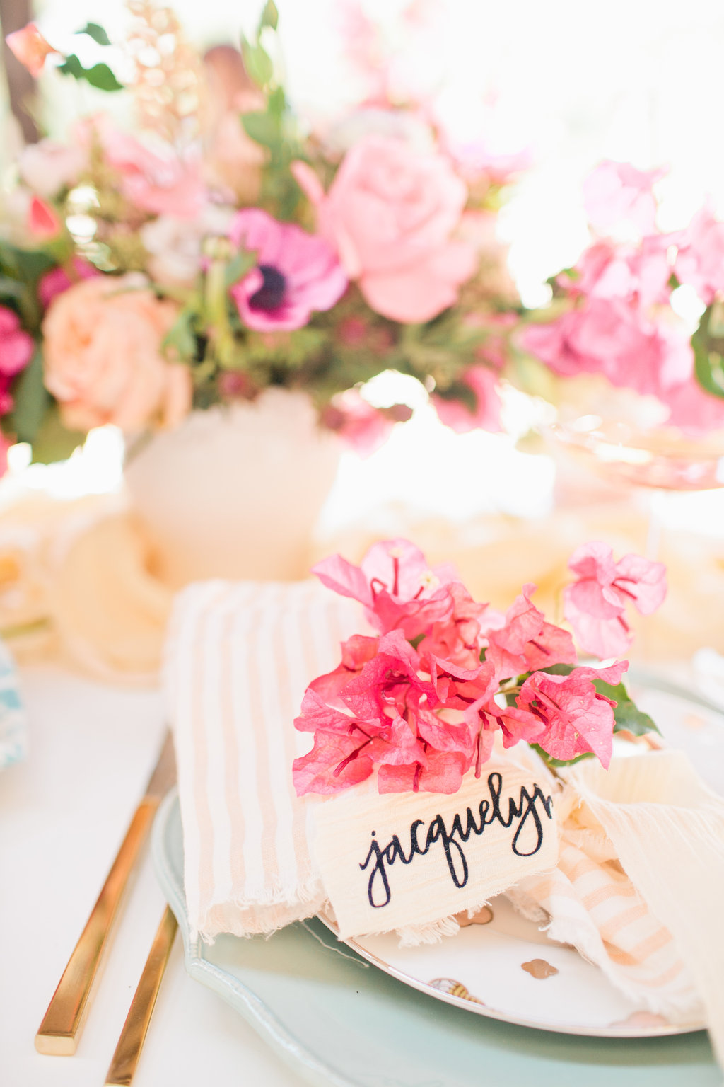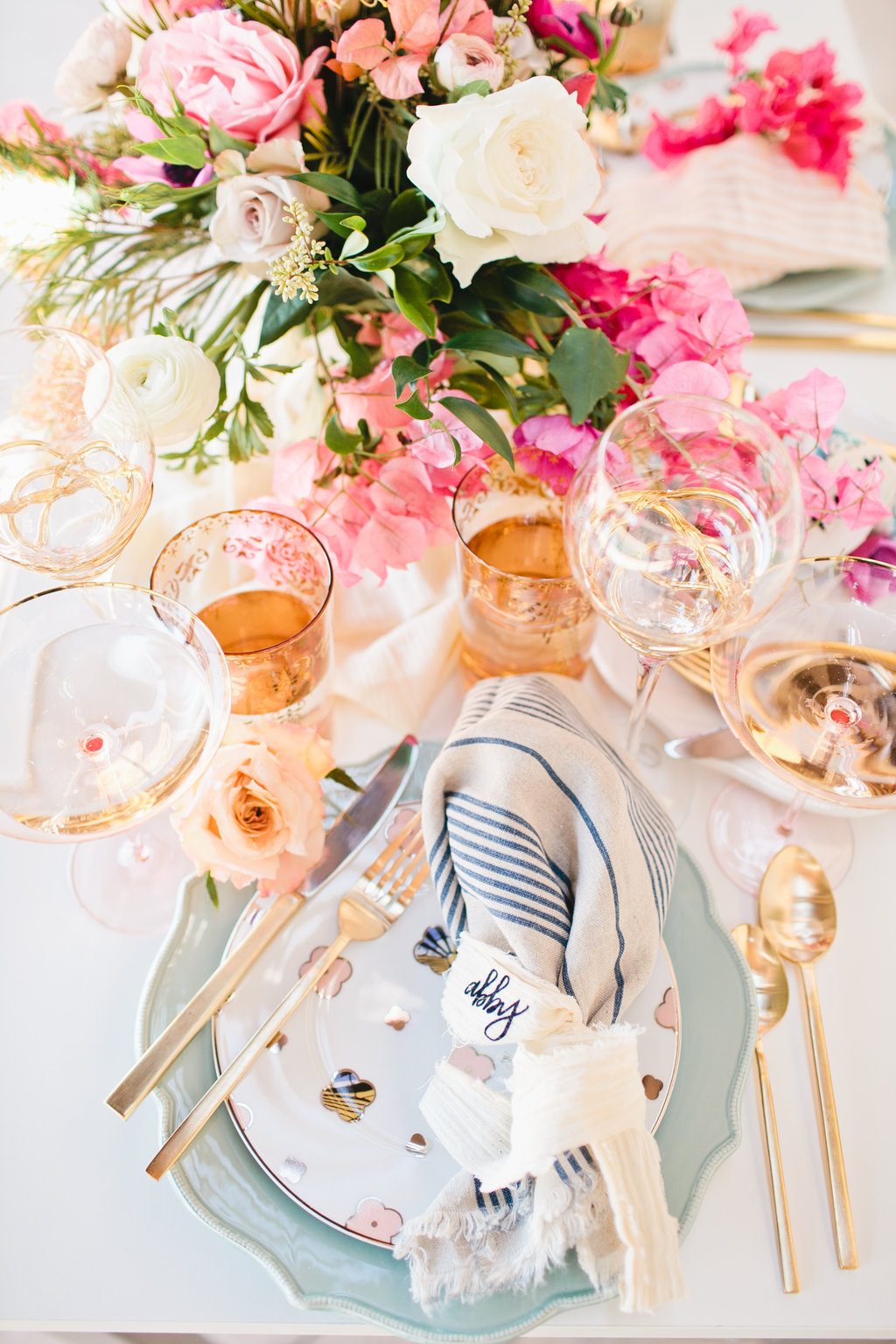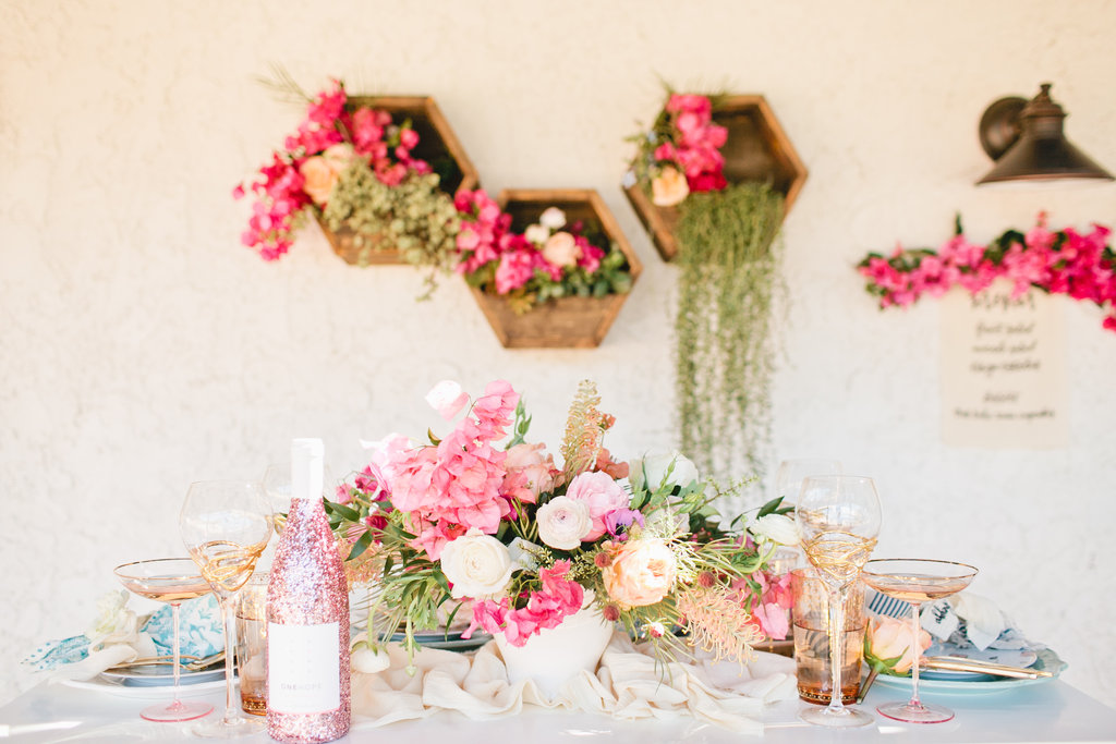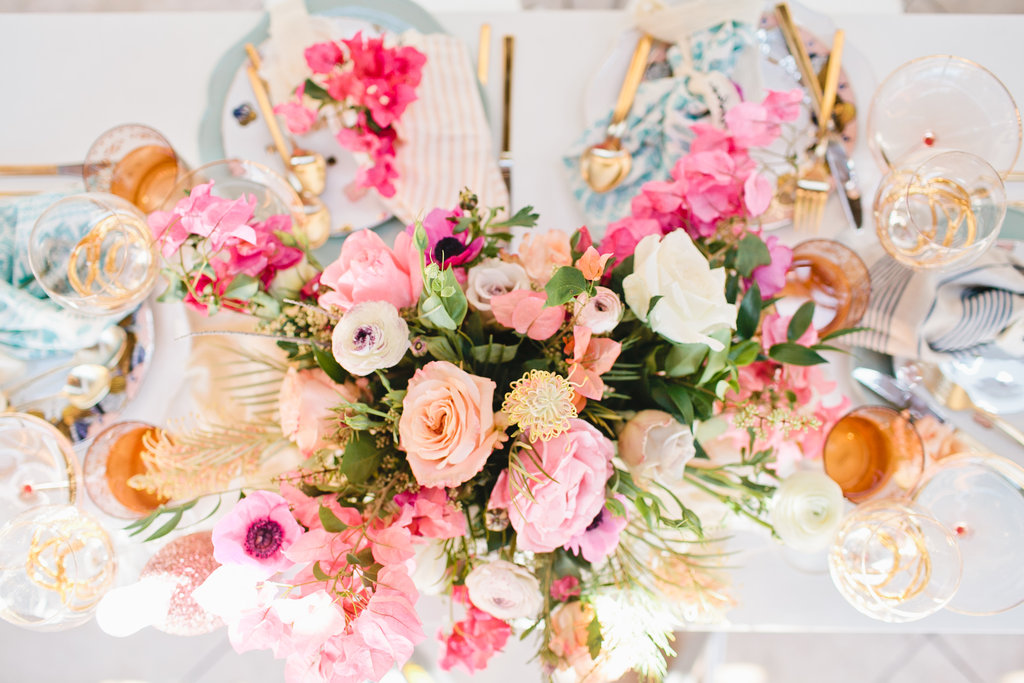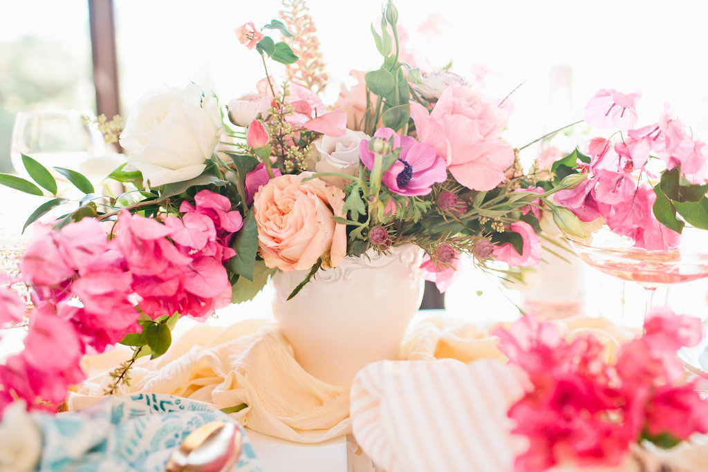 The colors of the table top fit perfectly in the vision we had for this Mother’s Day table. When we think of Mother’s day we think soft, pretty, cozy but elegant at the same time. This table was all of those and more. We brought in some darker pinks with the talents of the florist designer Meghan of Flowers by Mae Mae. The tabletop arrangement was bananas along with the accents on the wall and at each place setting.