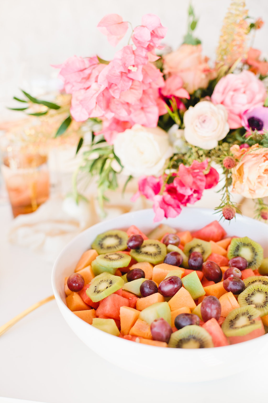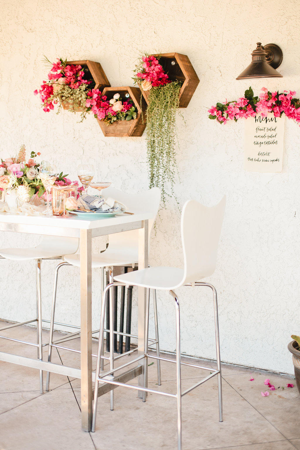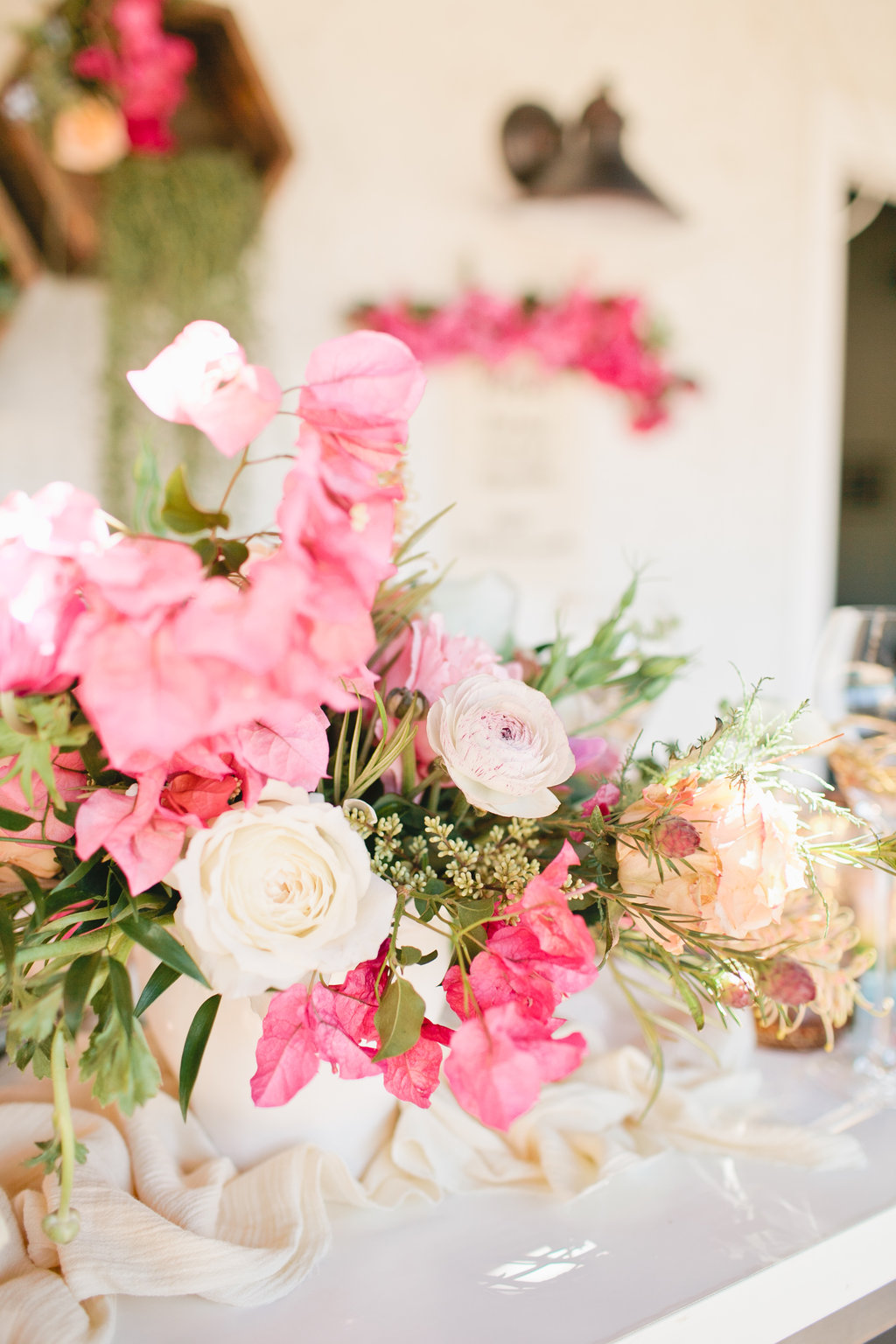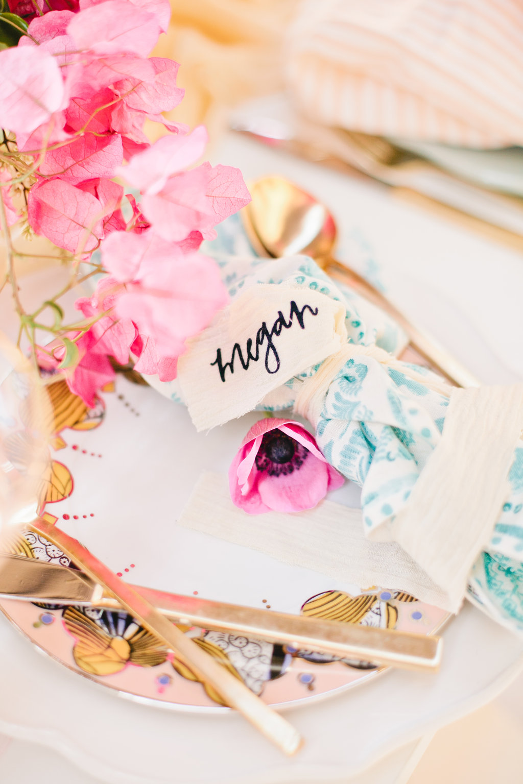The colors of the table top fit perfectly in the vision we had for this Mother’s Day table. When we think of Mother’s day we think soft, pretty, cozy but elegant at the same time. This table was all of those and more. We brought in some darker pinks with the talents of the florist designer Meghan of Flowers by Mae Mae. The tabletop arrangement was bananas along with the accents on the wall and at each place setting.