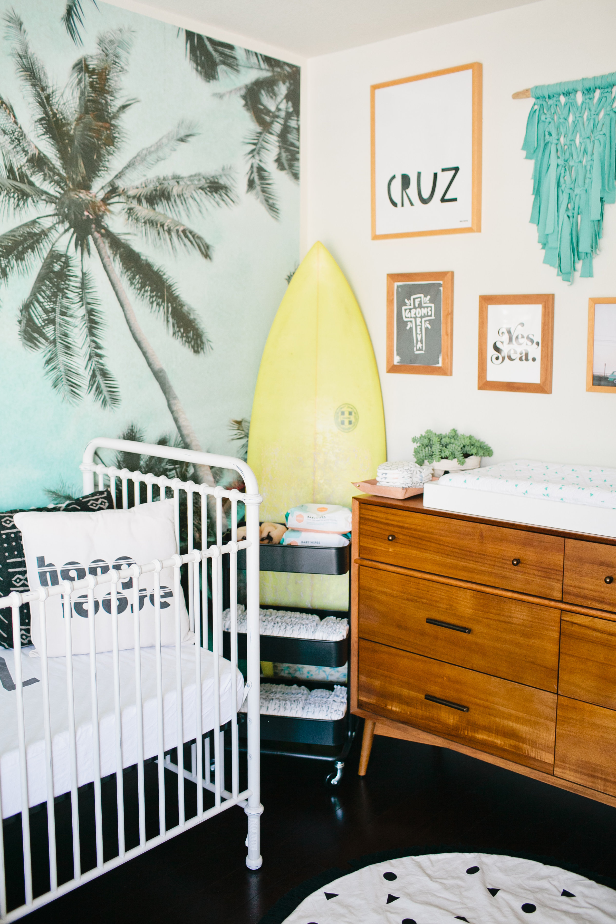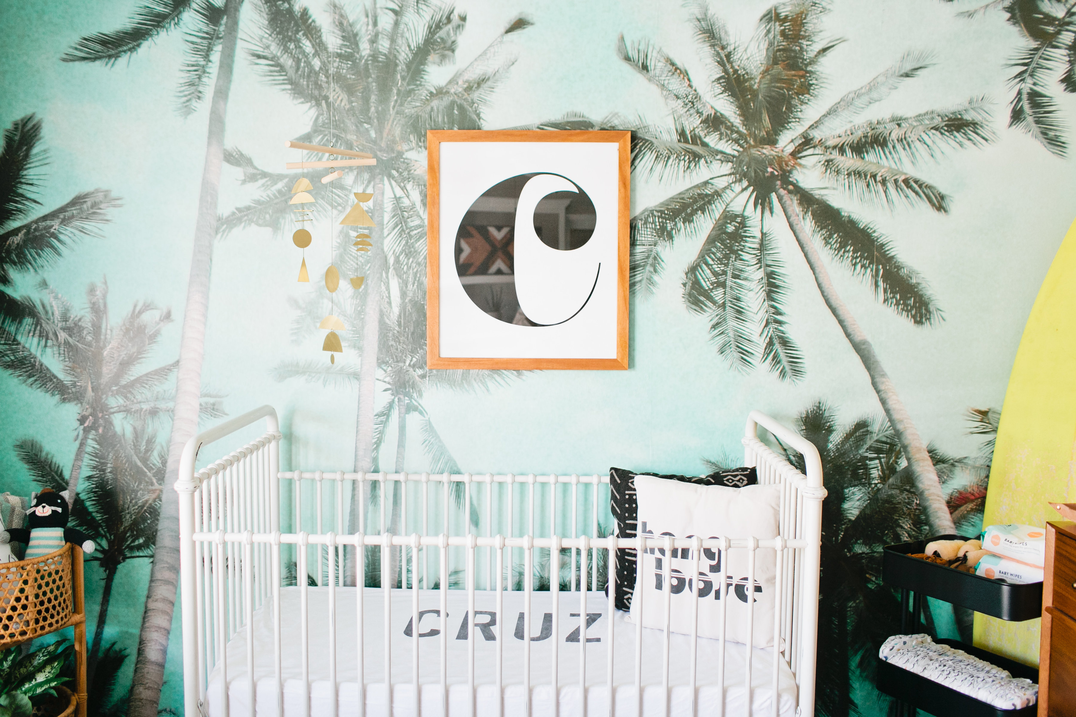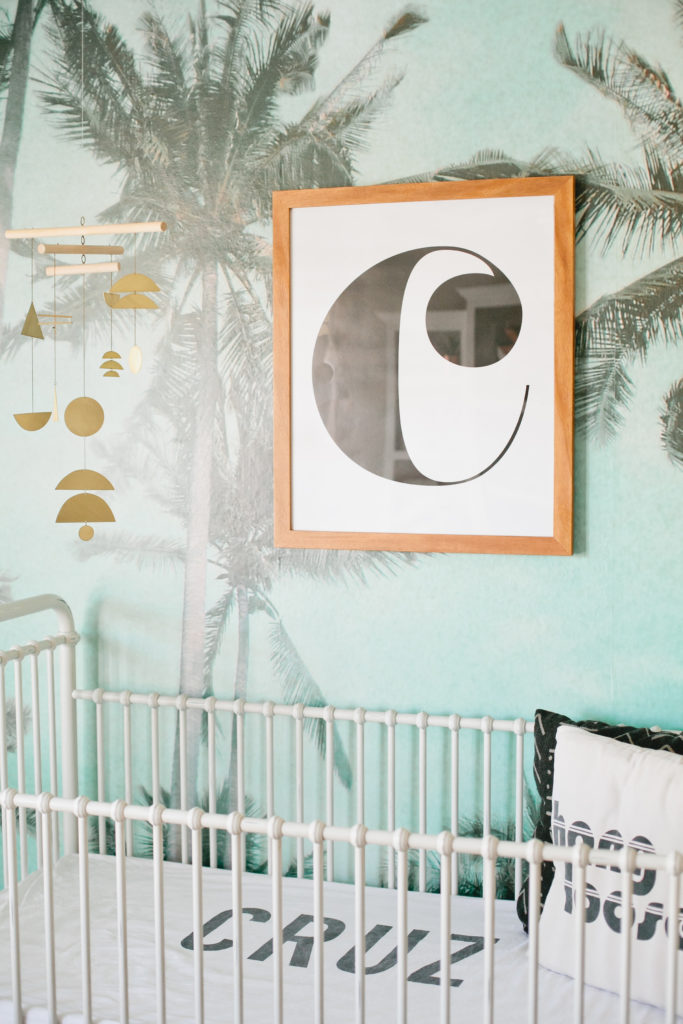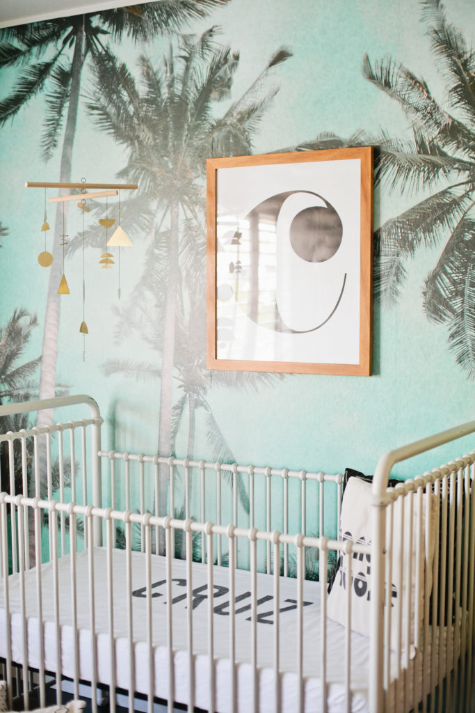 The first piece to the puzzle of this nursery was definitely the Palm Tree wallpaper mural from Kawaiian Lion.   I knew I wanted a statement wallpaper in the nursery and I tossed the idea around of a few others but this Too Palmy Wallpaper from Kawaiian Lion was just perfect for us.  We spend so much time as a family at the beach, our house is just about a half mile away so it’s really one of our favorite places.  Plus it creates the perfect scene to welcome our new guy into our home.  I love the colors and the calm and serene mood it sets in his room.