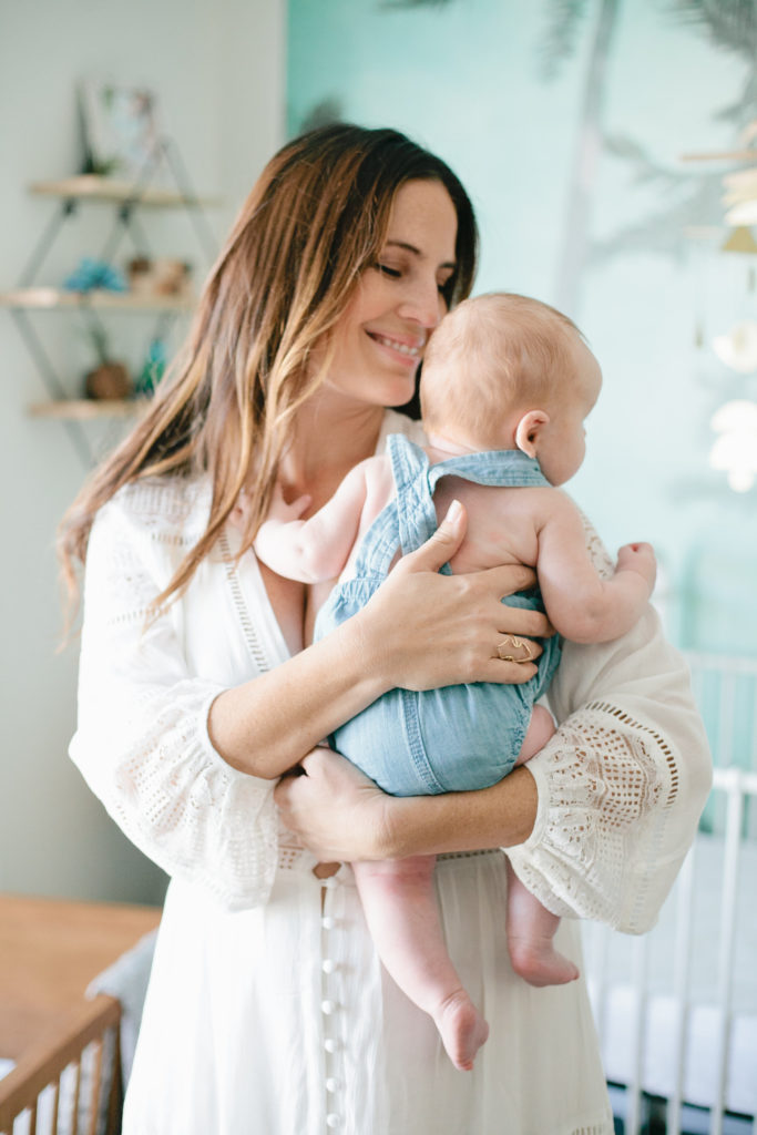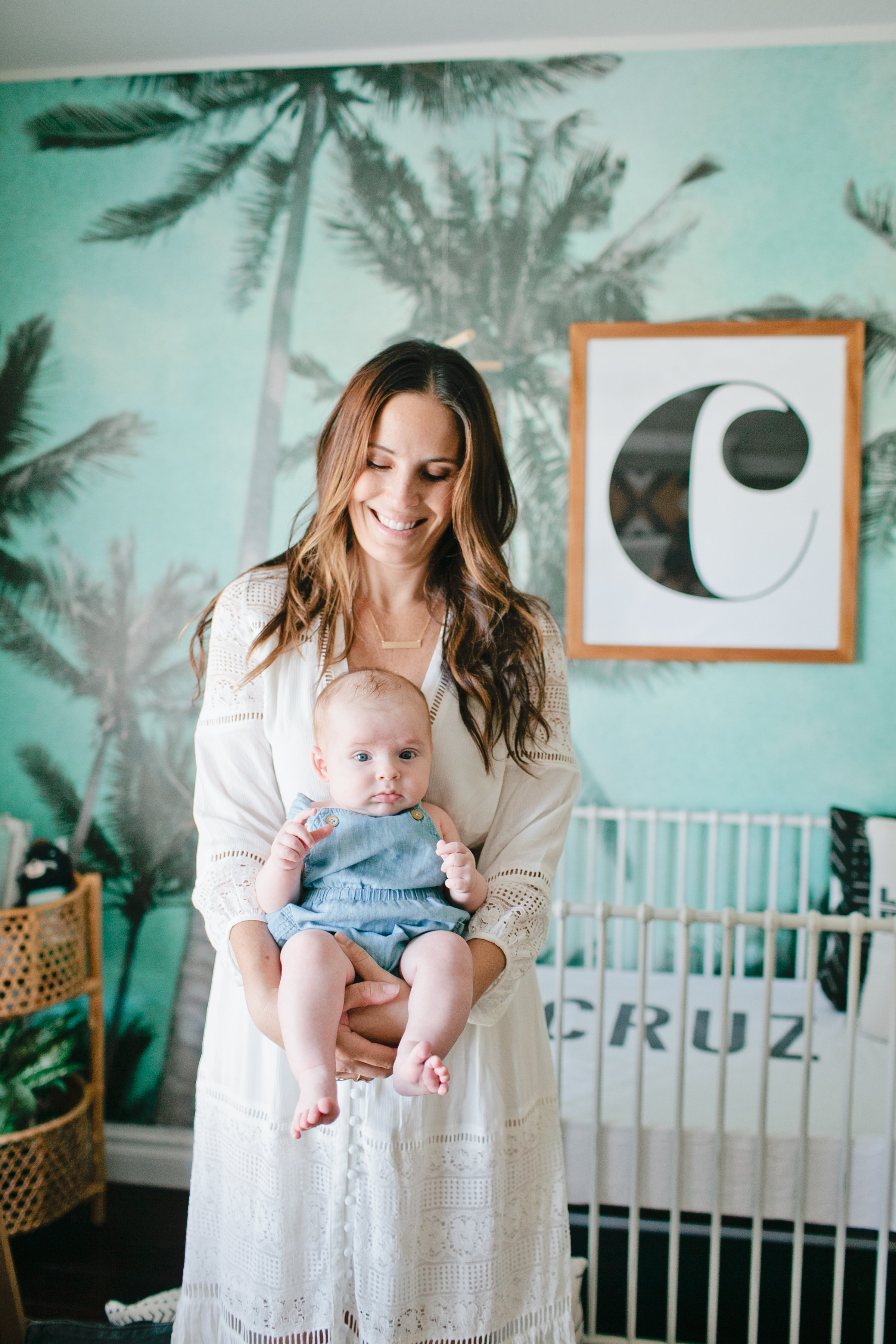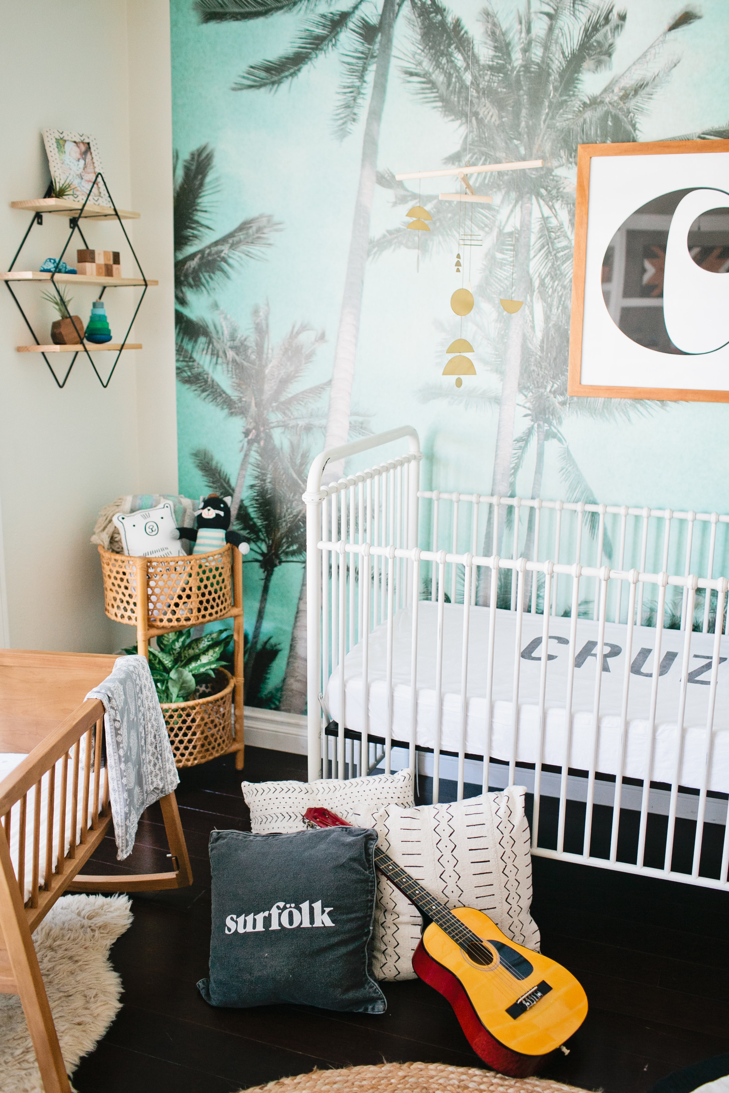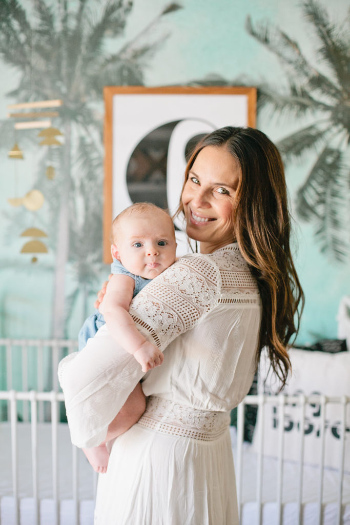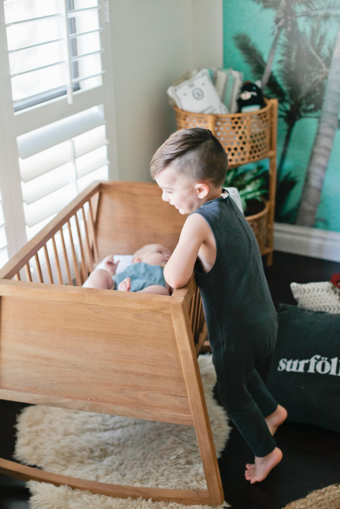 The first piece to the puzzle of this nursery was definitely the Palm Tree wallpaper mural from Kawaiian Lion.   I knew I wanted a statement wallpaper in the nursery and I tossed the idea around of a few others but this Too Palmy Wallpaper from Kawaiian Lion was just perfect for us.  We spend so much time as a family at the beach, our house is just about a half mile away so it’s really one of our favorite places.  Plus it creates the perfect scene to welcome our new guy into our home.  I love the colors and the calm and serene mood it sets in his room.