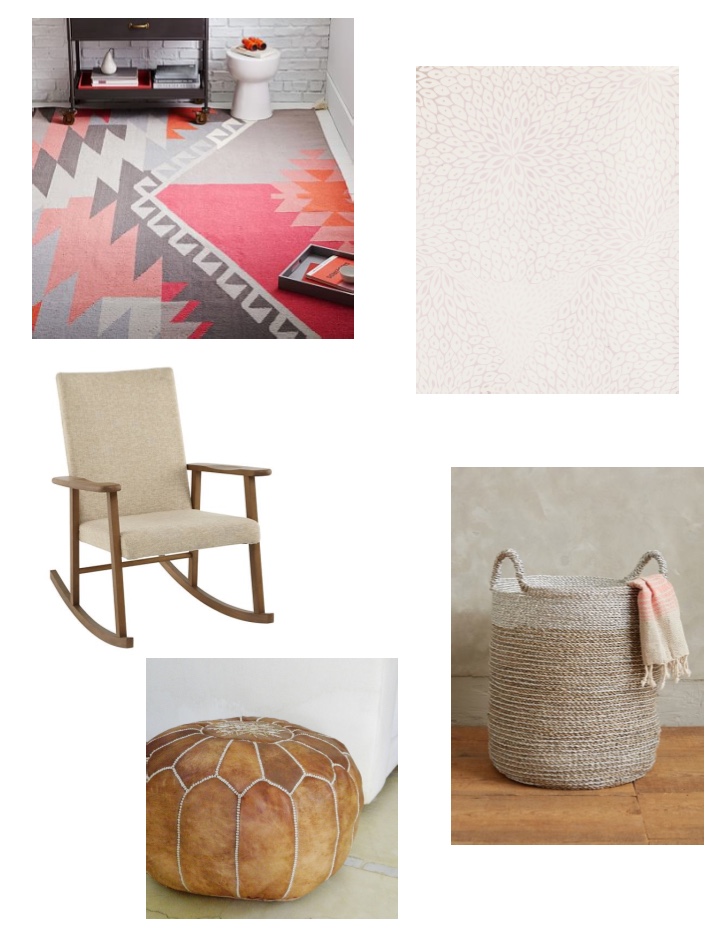 I put together this Nursery Inspiration Board starting with the rug from West Elm. I loved the bright to light pink mixture with the contrast of grey and orange. I’m using my white classic crib from my first daughter Edie’s room, and an antique brown dresser that was mine when I was growing up. I like mixing textures and patterns all the while keeping the same color scheme and most importantly keeping it light and bright. We are wallpapering one wall with the print on the right from Serena & Lilly, Mid Century Rocker from Land of Nod, Hamper from Anthopologie, and Moroccan Leather poof .