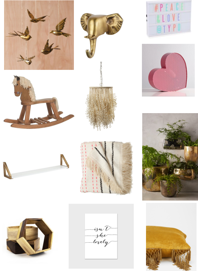 I fell in love with the Swallow Ornaments to use as Isla’s mobile from Dot & Bo along with the Hexagon Shelves (My handy hubby actually duplicated them and you can find them on Etsy here). The light box was a must, It’s sold out everywhere and I finally found it at an online shop in Australia. The Elephant hook, white & gold shelf, throw blanket and heart night light are from Land of Nod….LOVE that place. Rocking horse find on Etsy. Amazing chandelier from Serena & Lilly (actually named Isla chandelier…it was a sign)! I want to put a pretty plant in the corner of her room and I thought this large gold pot from Anthropologie would look best. I’m in love with Stevie Wonder’s song “Isn’t She Lovely”, so I found this print appropriate on Etsy. Last but not least, this amazing throw pillow from Urban Outfitters.