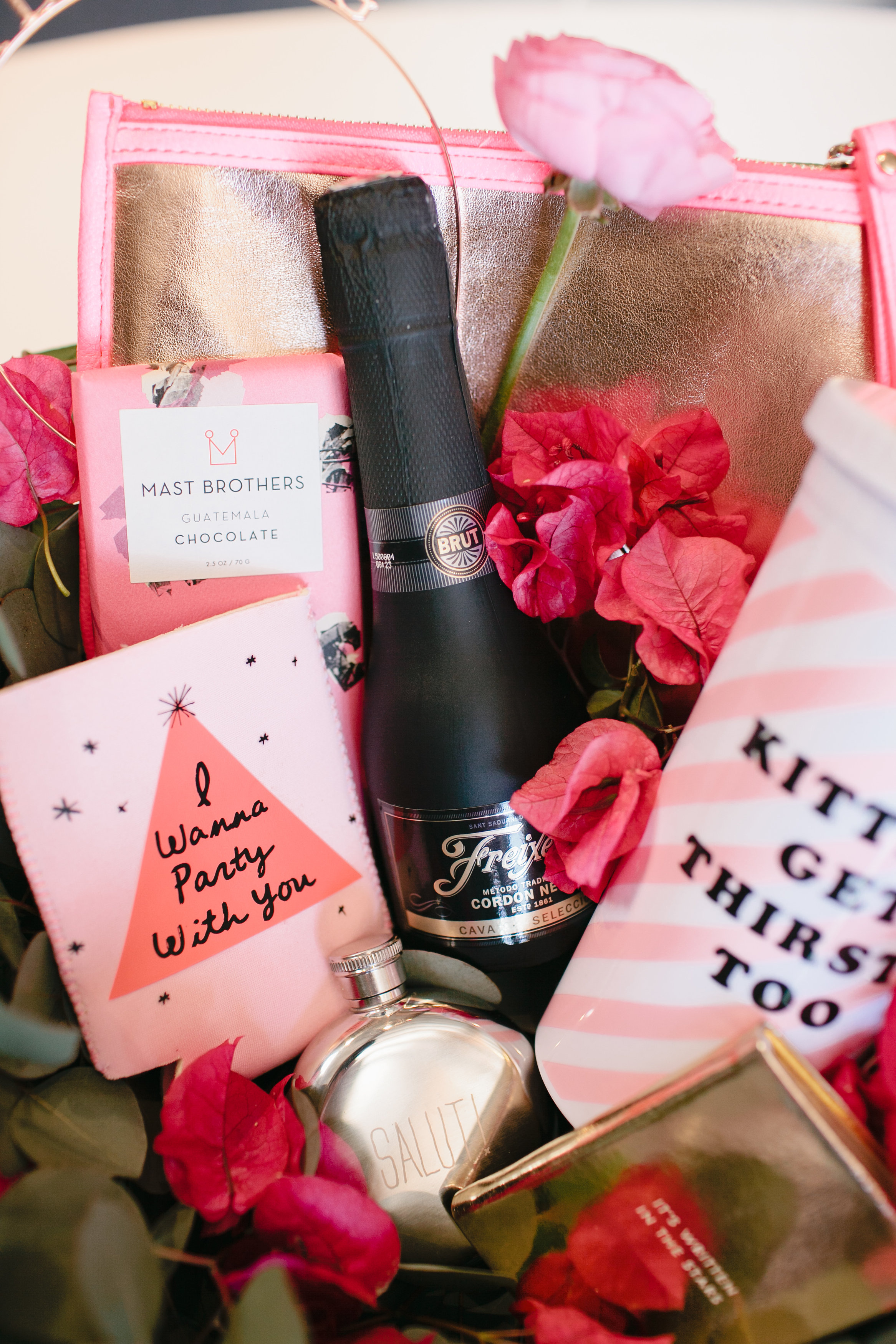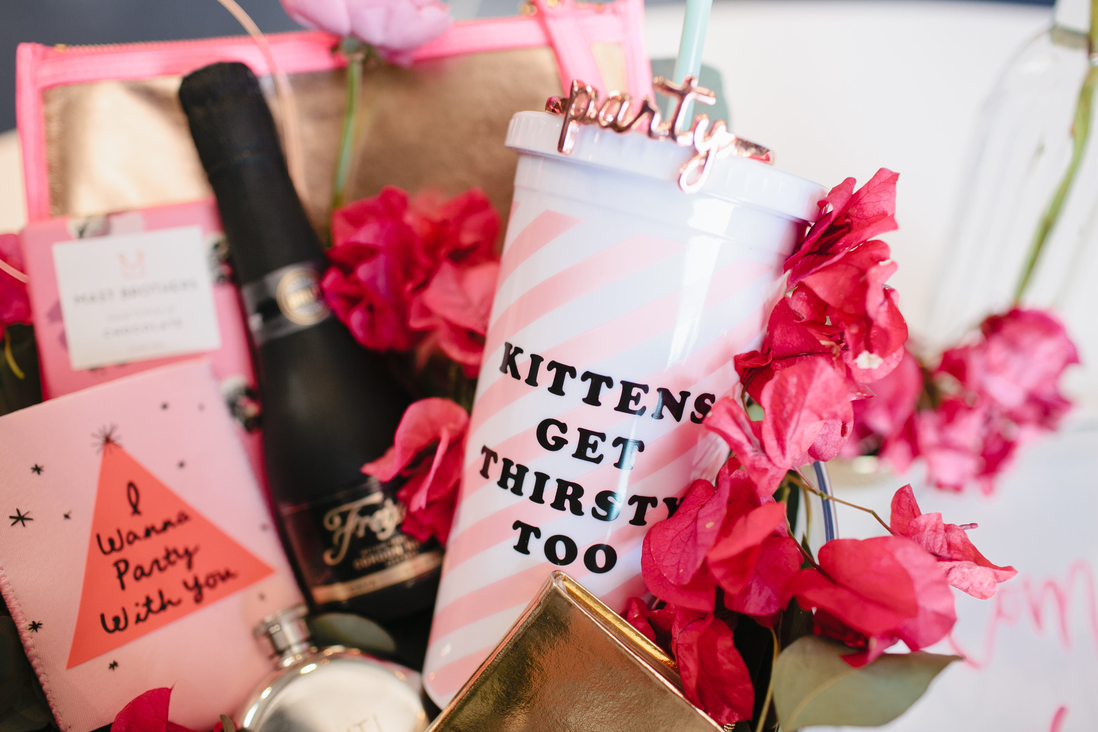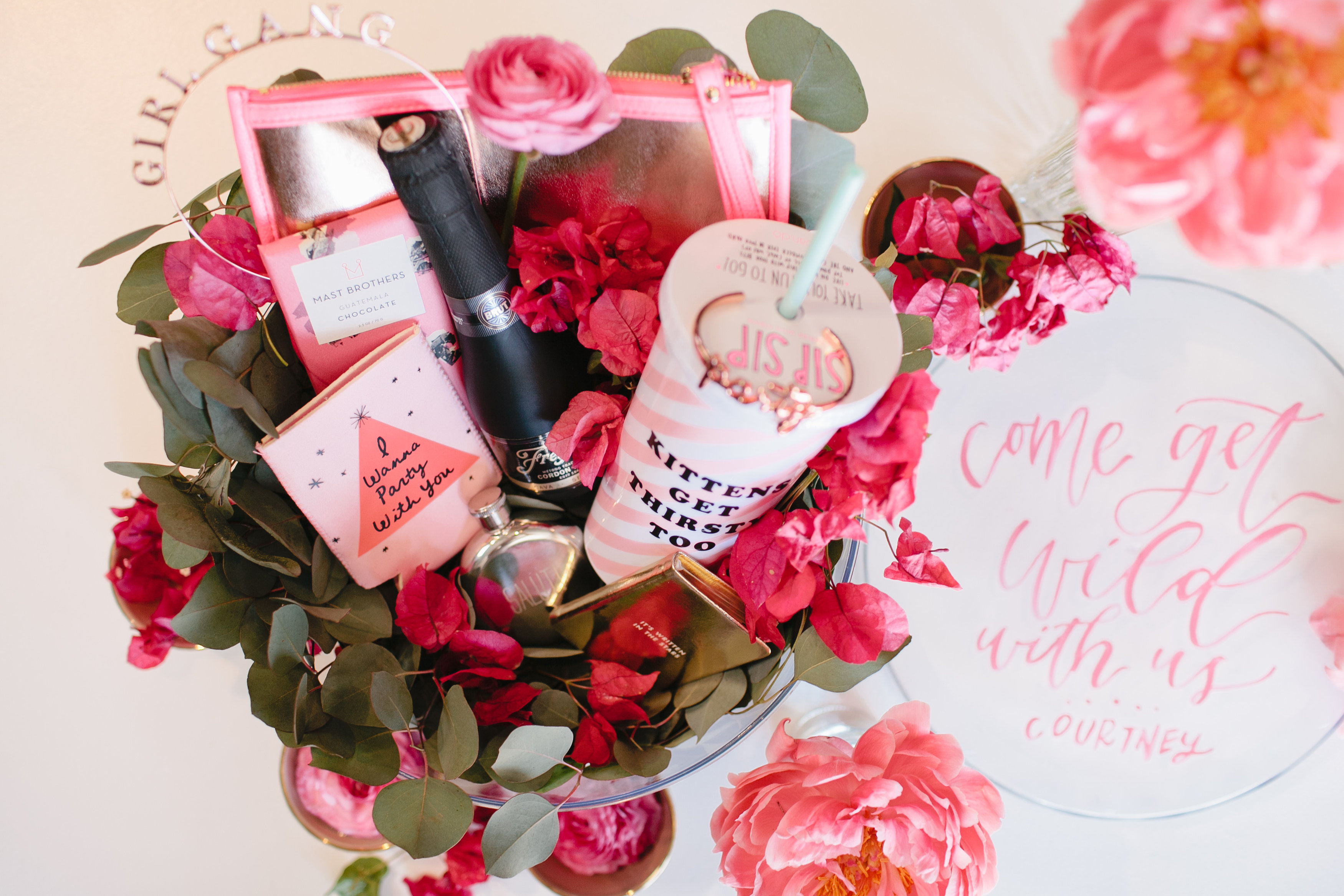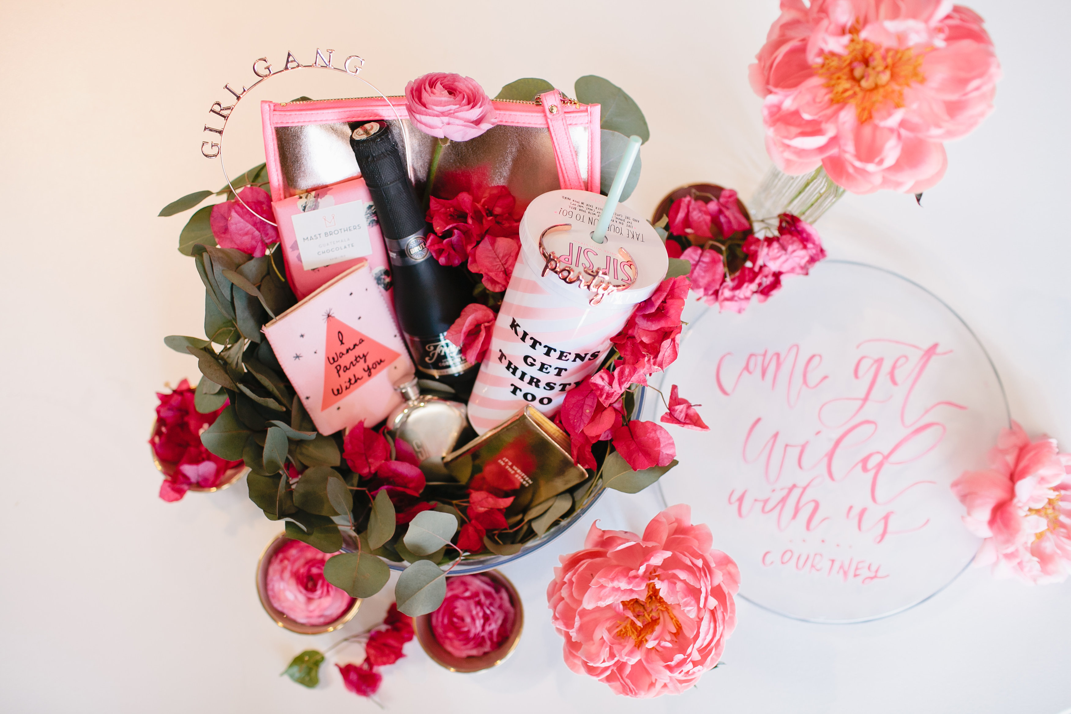We recently has some fun with 100 Layer Cake (featured today!!) doing a Bachelorette party shoot for Friexenet Sparkling wine.  We loved getting wild with the theme, and can’t wait to share one of the marvelous details of the shoot with you…. The Ultimate Bachelorette box!  It will kick off your wild night or weekend on the right foot, and your bridesmaids will love, love, love it.  We partnered with our friends…the super talented ladies over at Bloom Babes to make it extra sweet and fill it with  eucalyptus leaves and flowers…