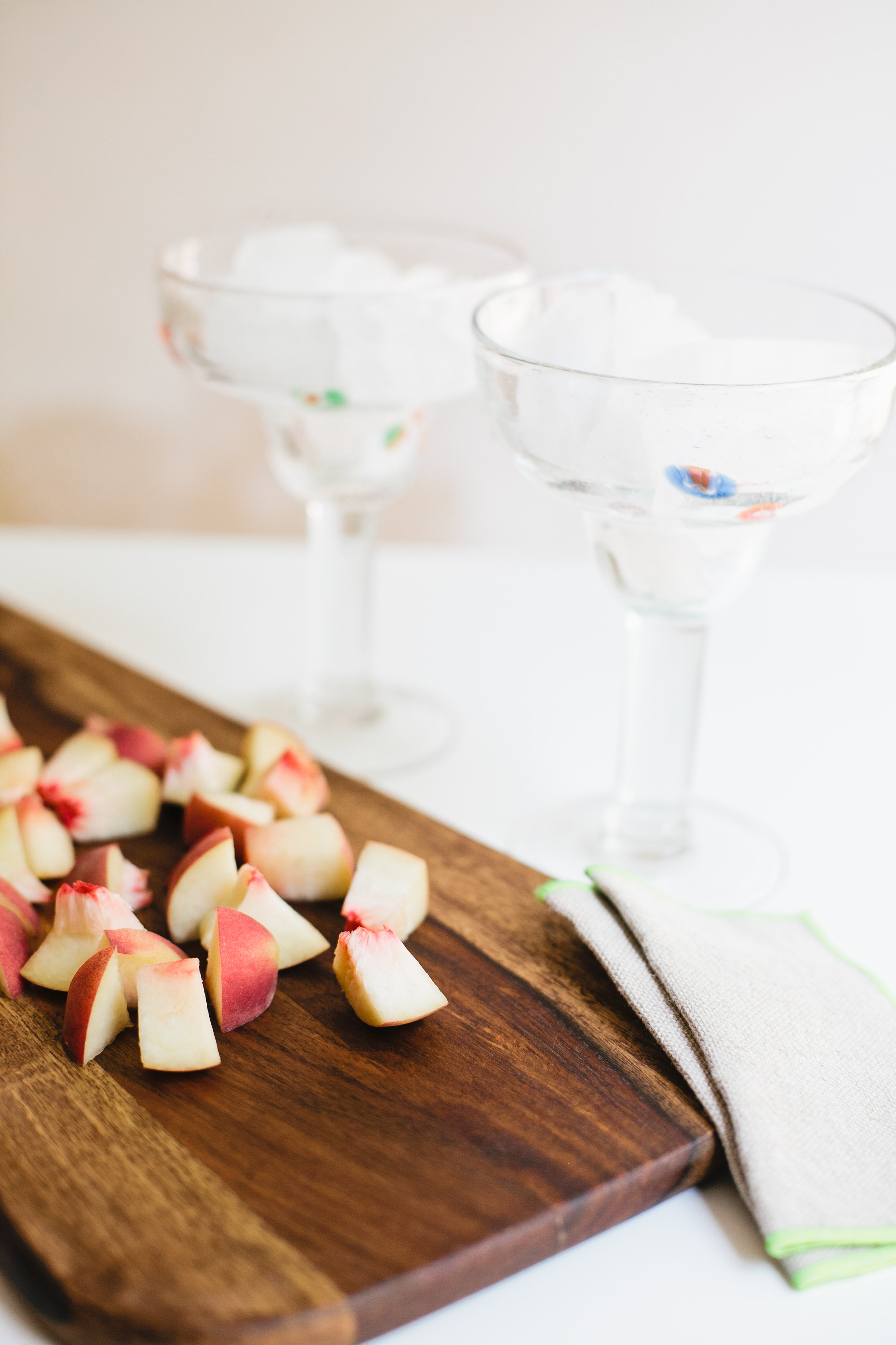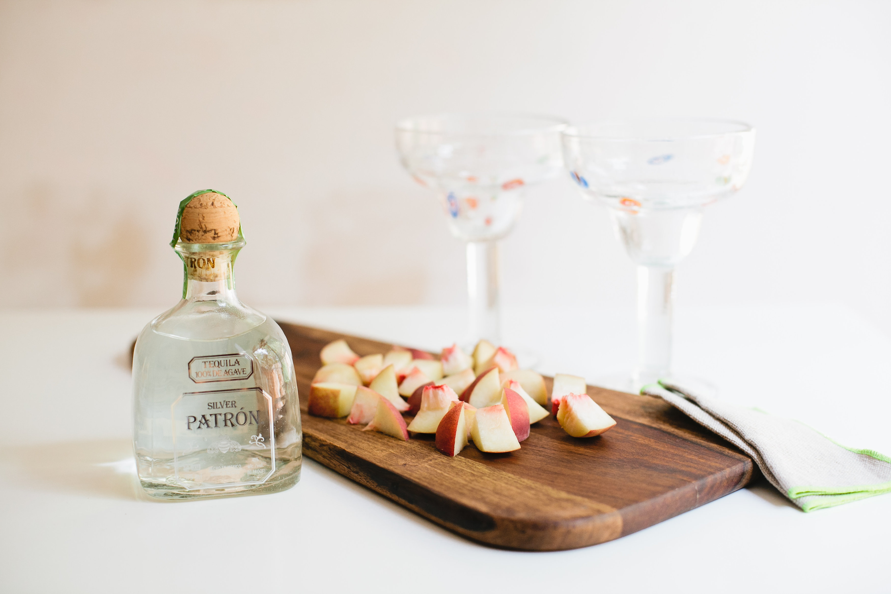 Chop up your white peaches, throw them into a blender with some ice.  Top them with your tequilla, triple sec, the juice of your lemon and some honey.