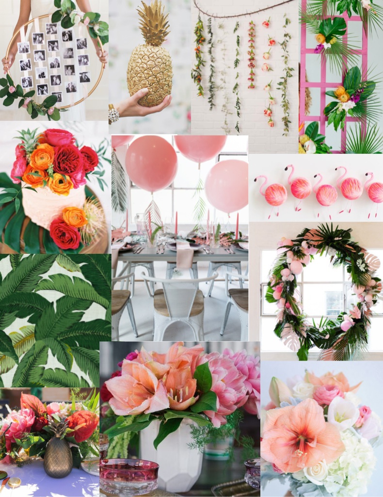 Here’s more vision boards from another party we did for an awesome client a couple months ago. It was her daughters first birthday and we knew how special this one had to be!! She wanted a pretty, colorful tropical theme, heavy on the pink. Here’s the pictures and color palate Jacquelyn started with …