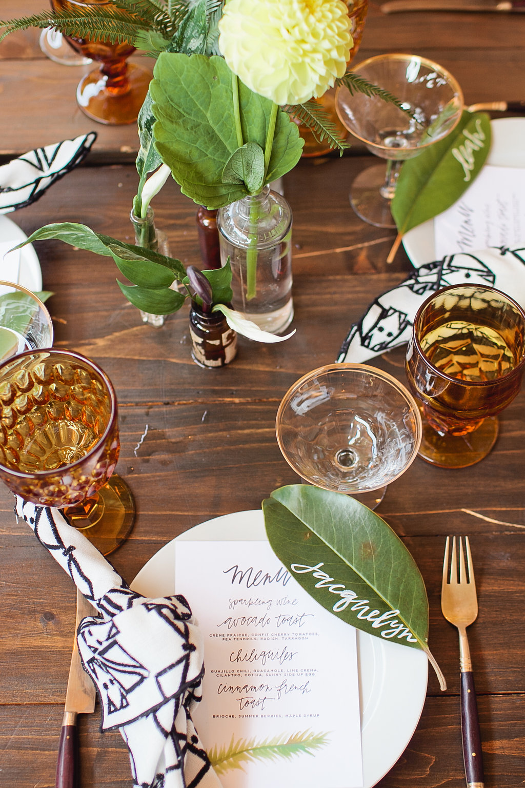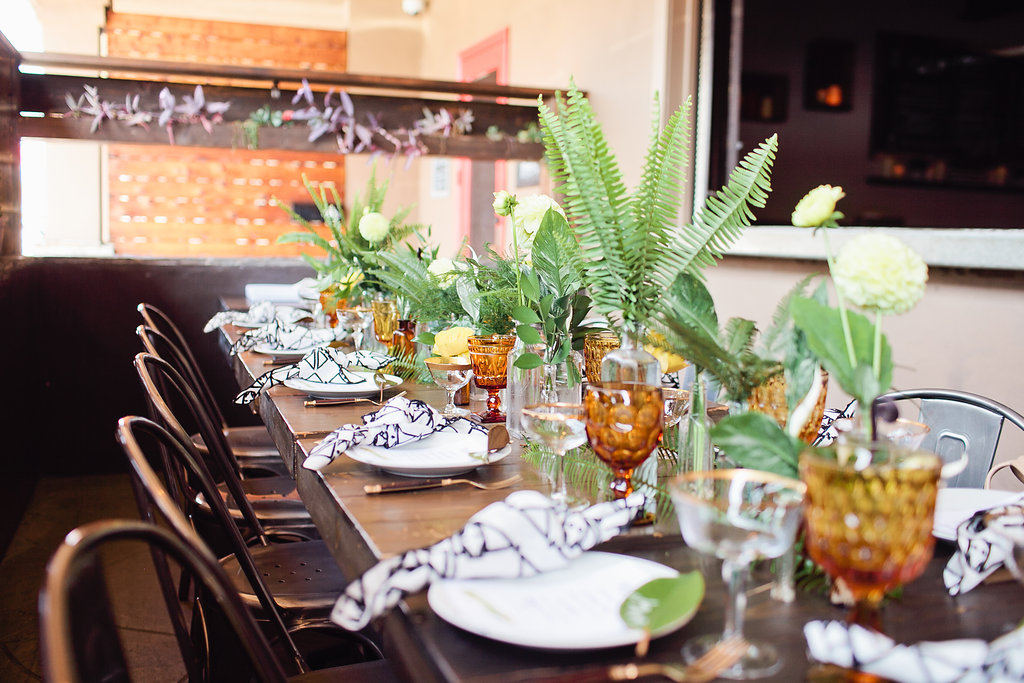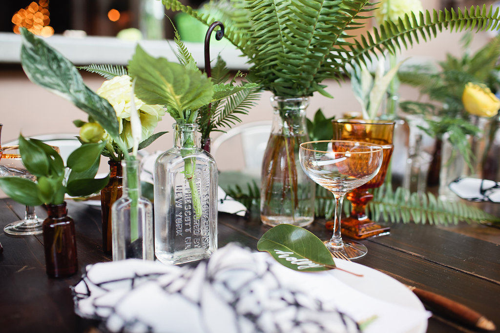 Now a peek at the actual party to see the vision board come to life….We loved the idea of the vintage vases all down the middle of the table mixed with different types and ferns, adding our own styled twist and pop of yellow.
