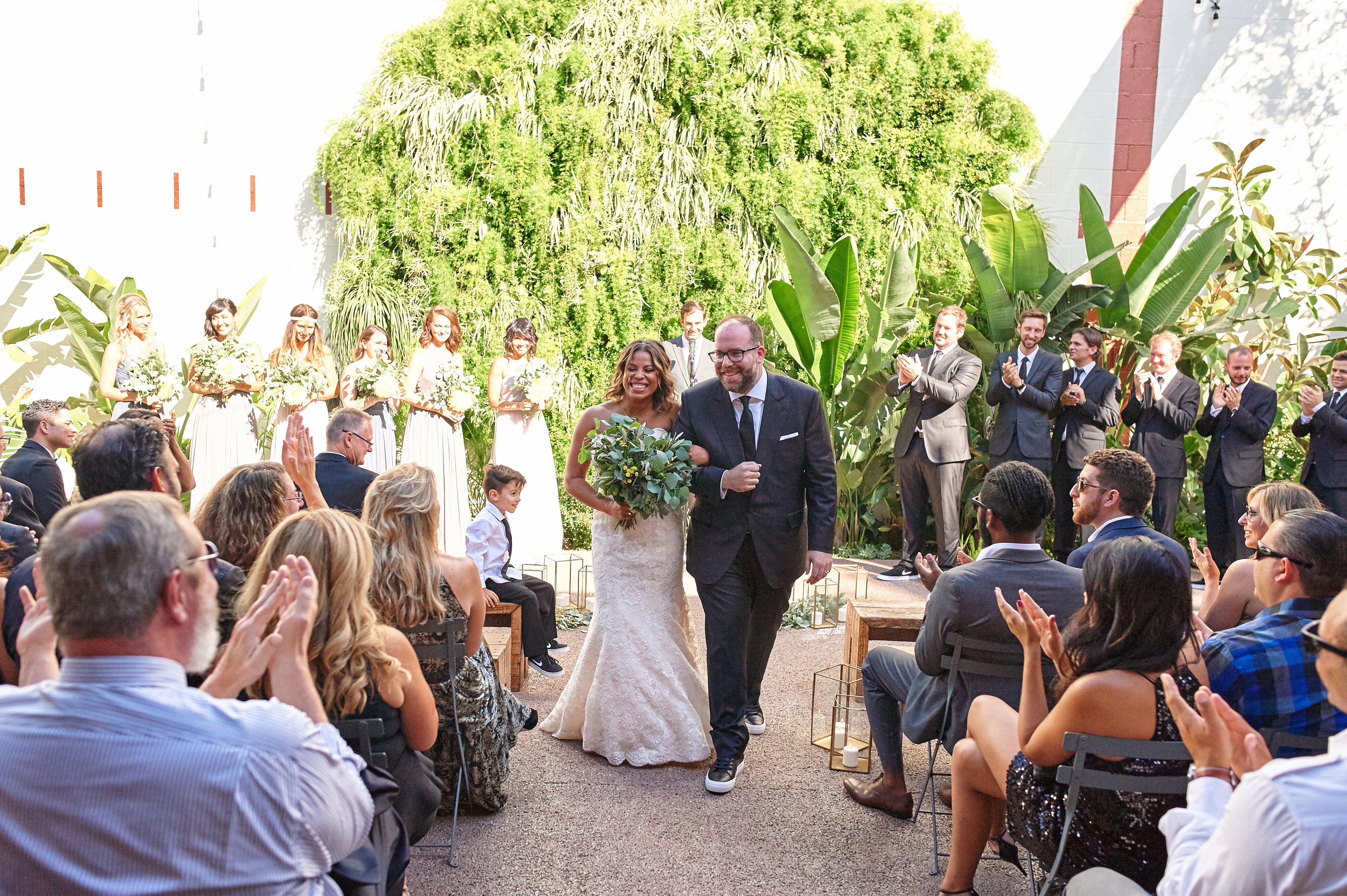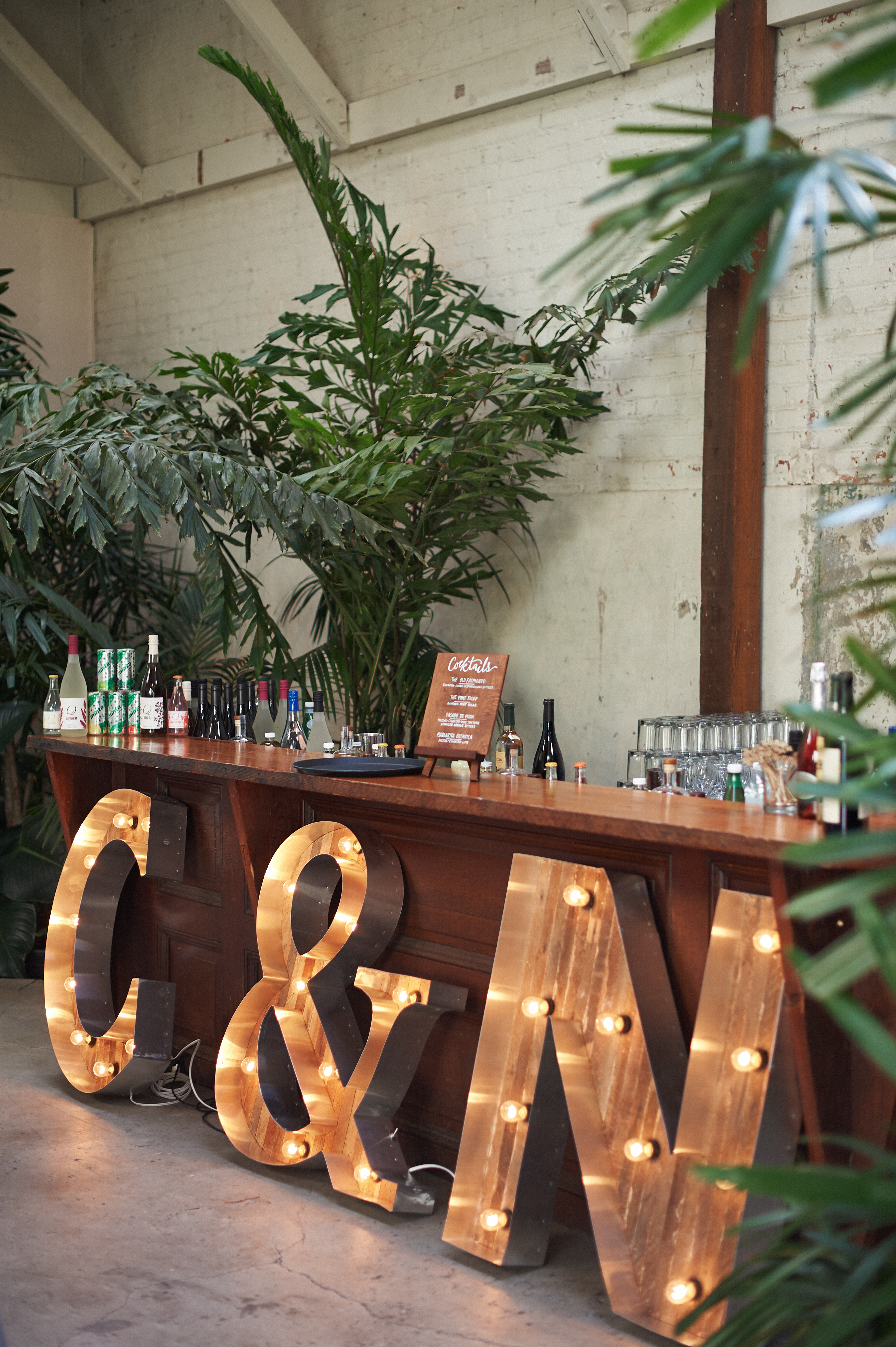 We did a gem of a wedding last year in the ultra cool arts district of downtown LA and we couldn’t wait to share it with you guys, also find it featured on Ruffled Blog today. When we started talking design with Chris and Nicole we were thrilled to hear they had picked Millwick as their venue, the new modern space owned by the Marvimon group. It took one walk through and it had us at “hello”. The space is killer with it’s built in custom bar, plant wall, and custom projection screen. It has an amazing industrial feel, yet it’s warm at the same time with all the plants and wall textures.