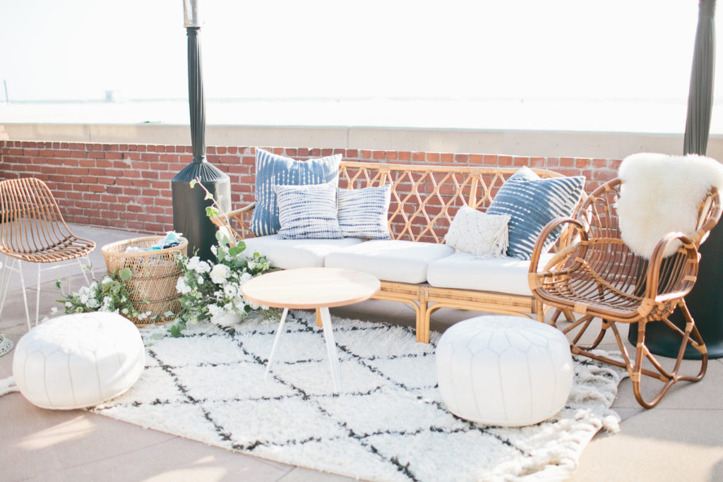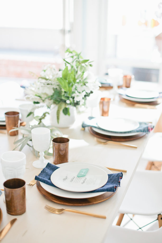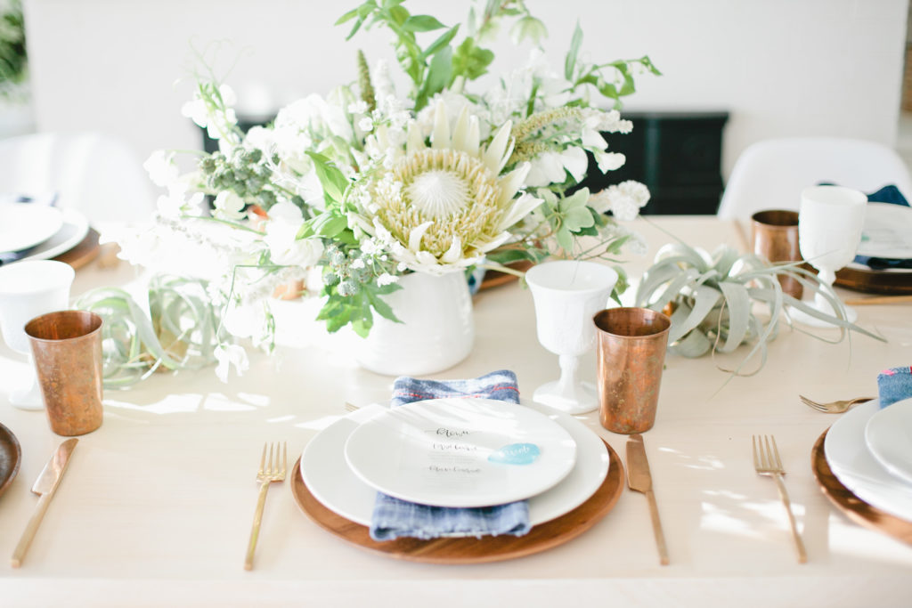 The tables from Witty Rentals were neutral and airy, adorned with beautiful floral arrangements by Of the Flowers and pretty tabletop pieces of white, copper and mud cloth from Hostess Haven. I’m so happy with how the modern pieces from Witty worked with the boho style of the florals and tabletop items, love it!