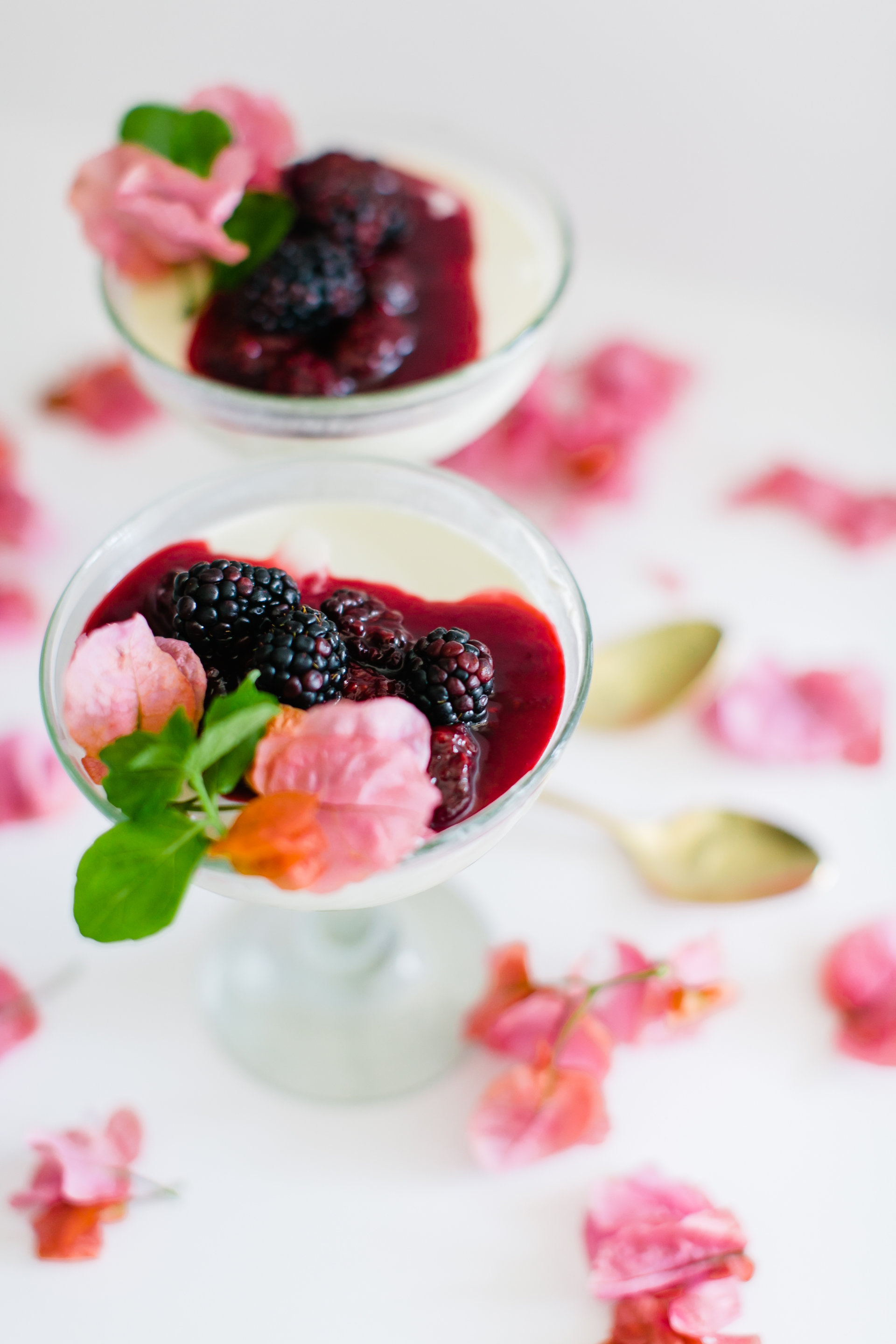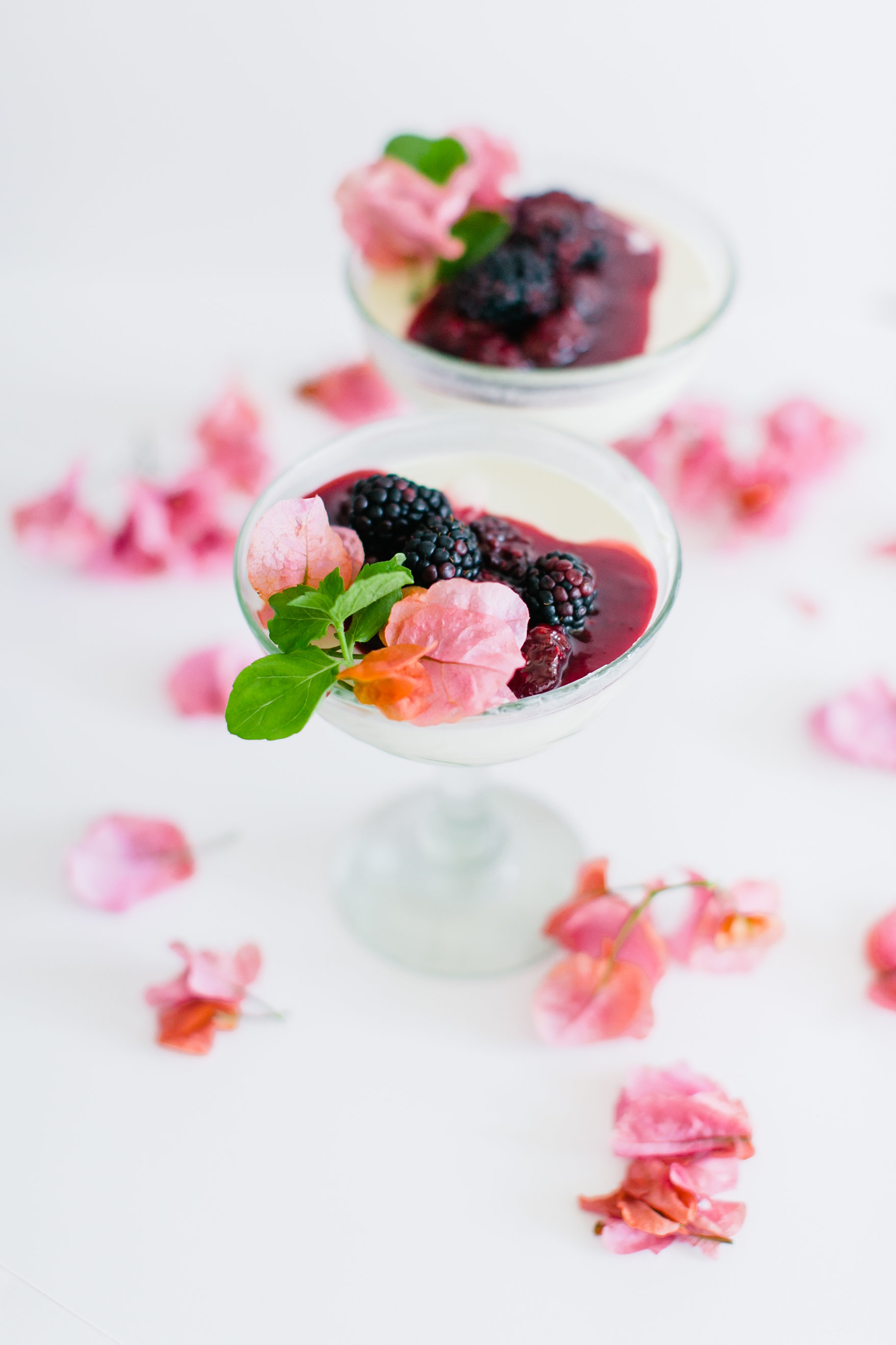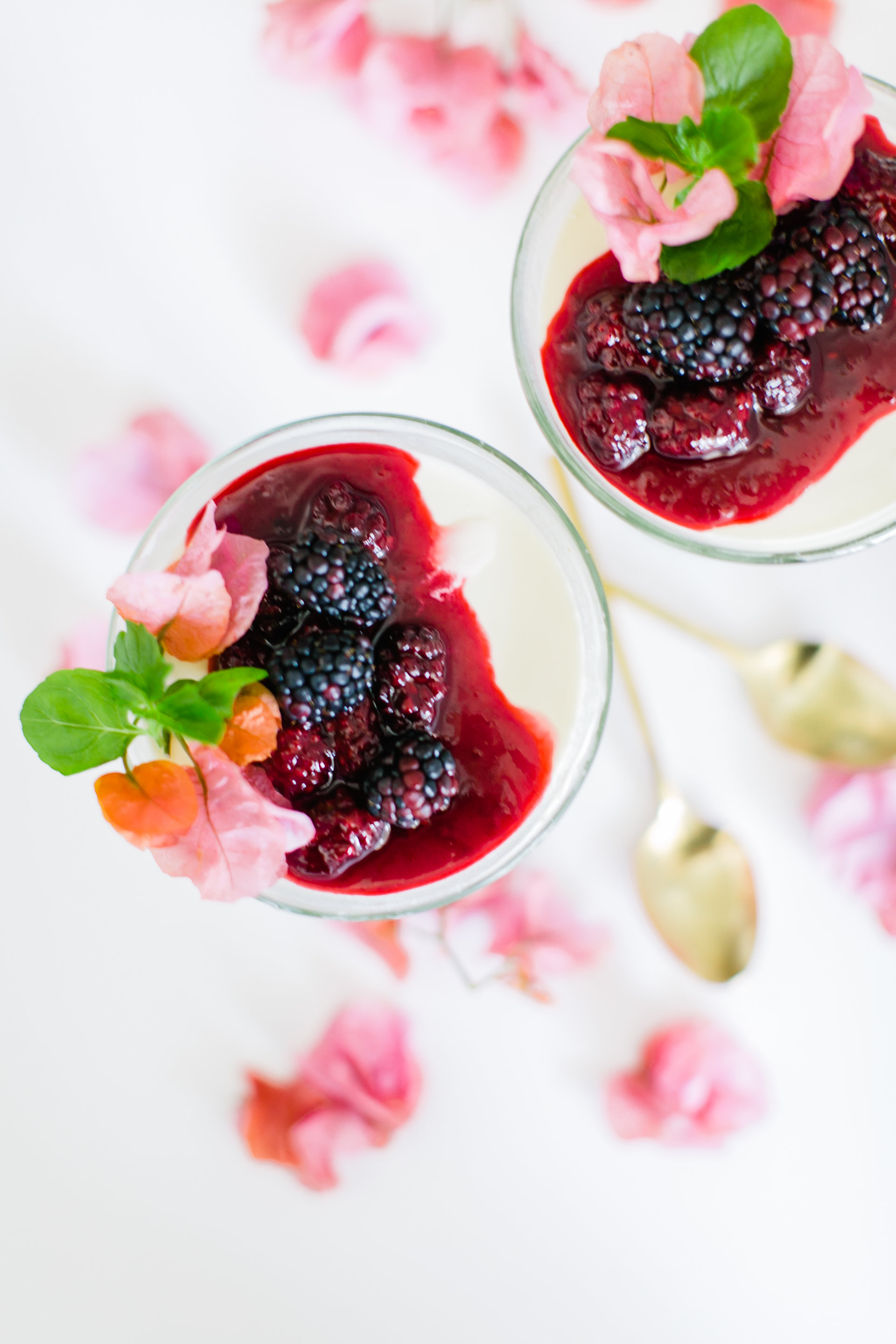 It’s Friday and that means it’s the weekend and it’s time to TREAT YO’ SELF!!!! I’ve got a delicious recipe to share that Mama Bettencourt (aka my mom) made for me a few weeks ago. She’s always trying something new and this blackberry buttermilk panna cotta was a crowd pleaser. My Mother in Law was visiting when she made this and ended up eating it for breakfast and dessert she liked it so much! Lucky you, she is sharing the recipe with us and she says it’s easy… Music to my ears!